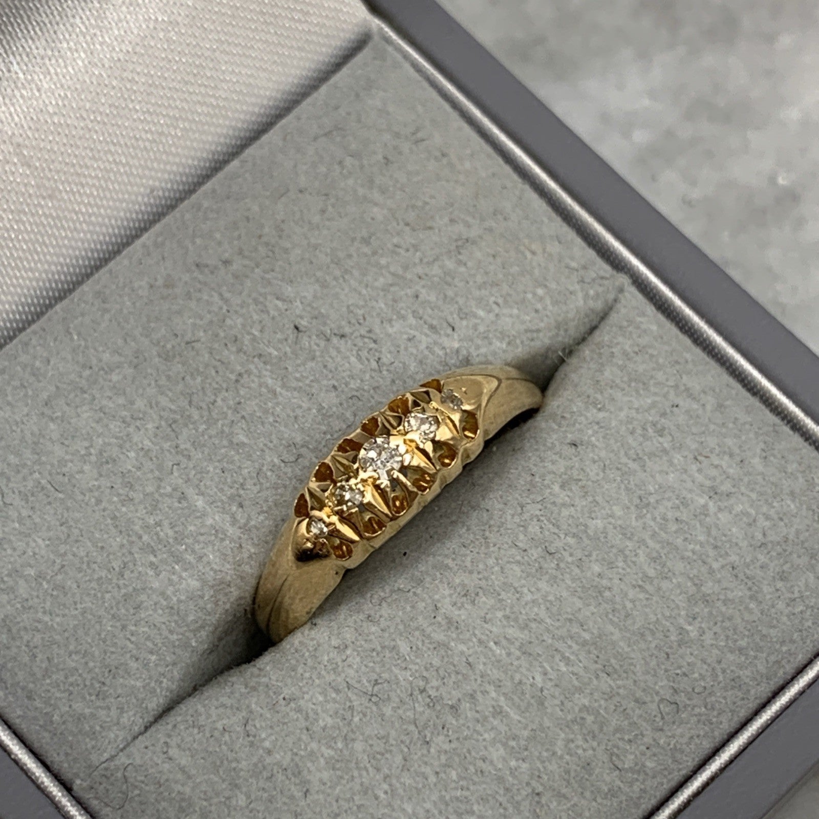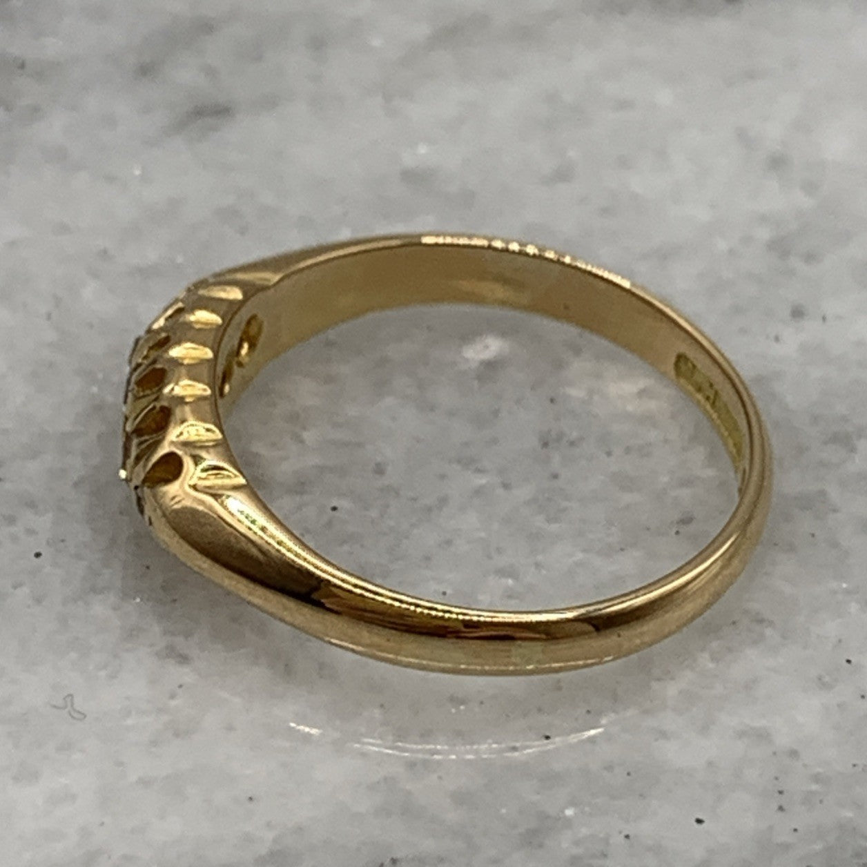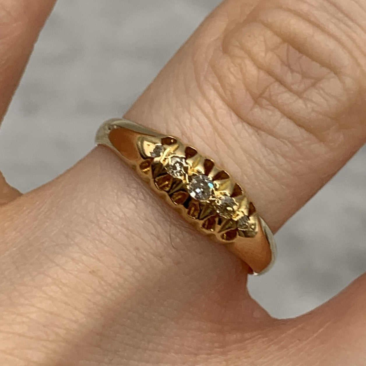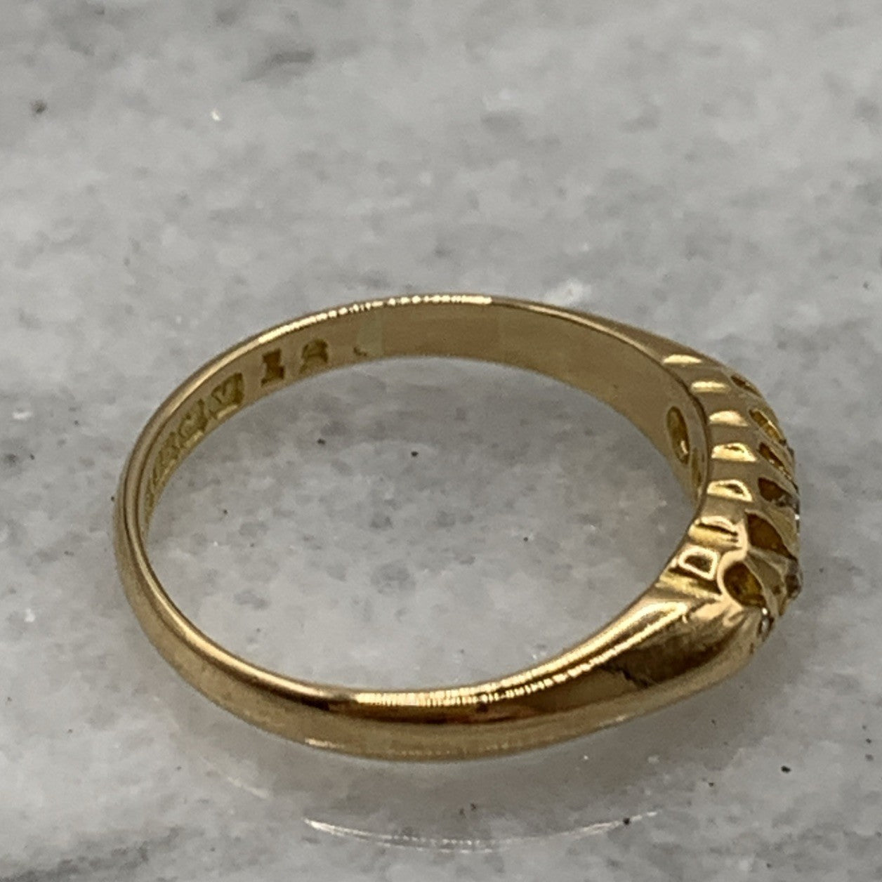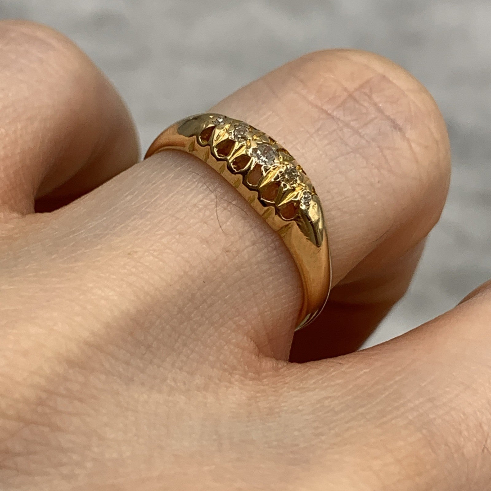- A gorgeous antique boat style gold ring featuring five petite round cut diamonds.