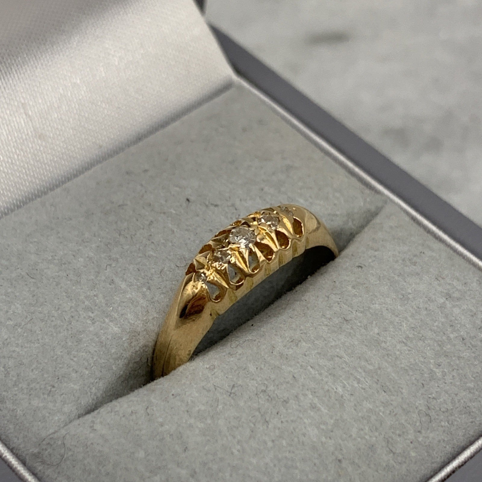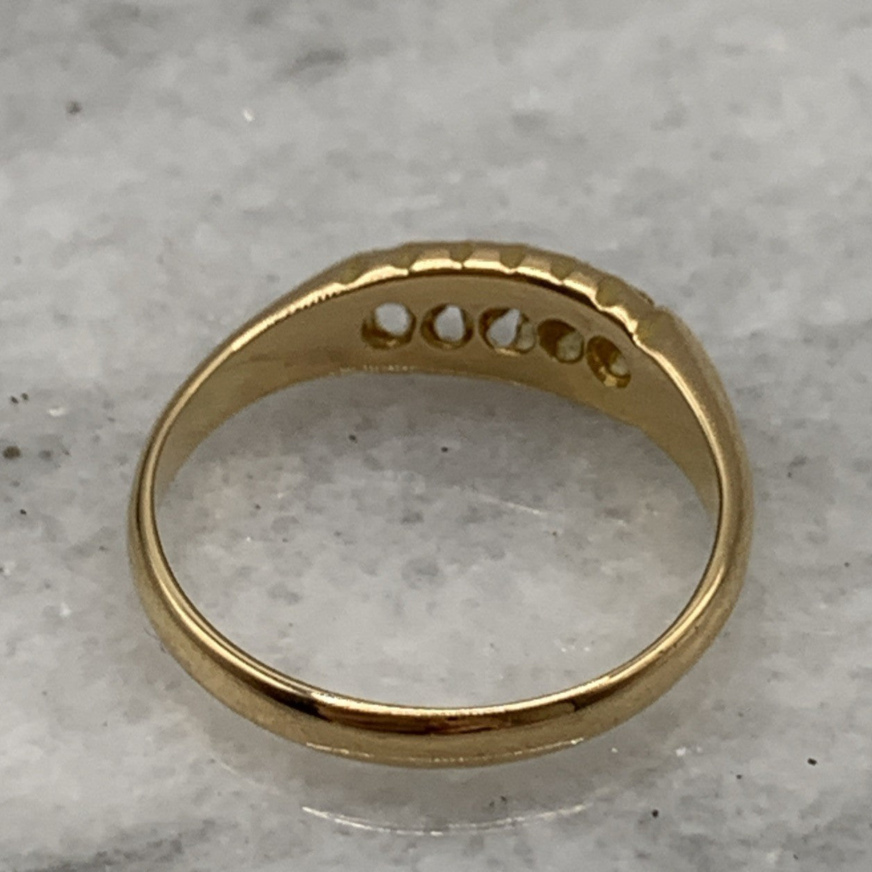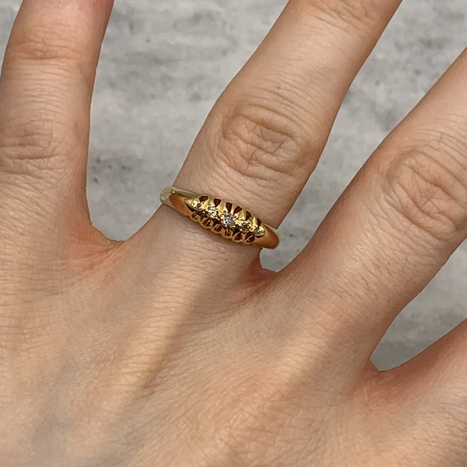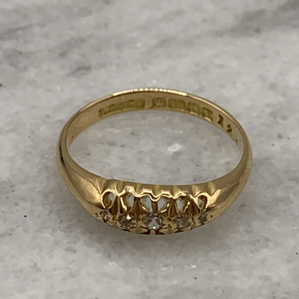 - A gorgeous antique boat style gold ring featuring five petite round cut diamonds.