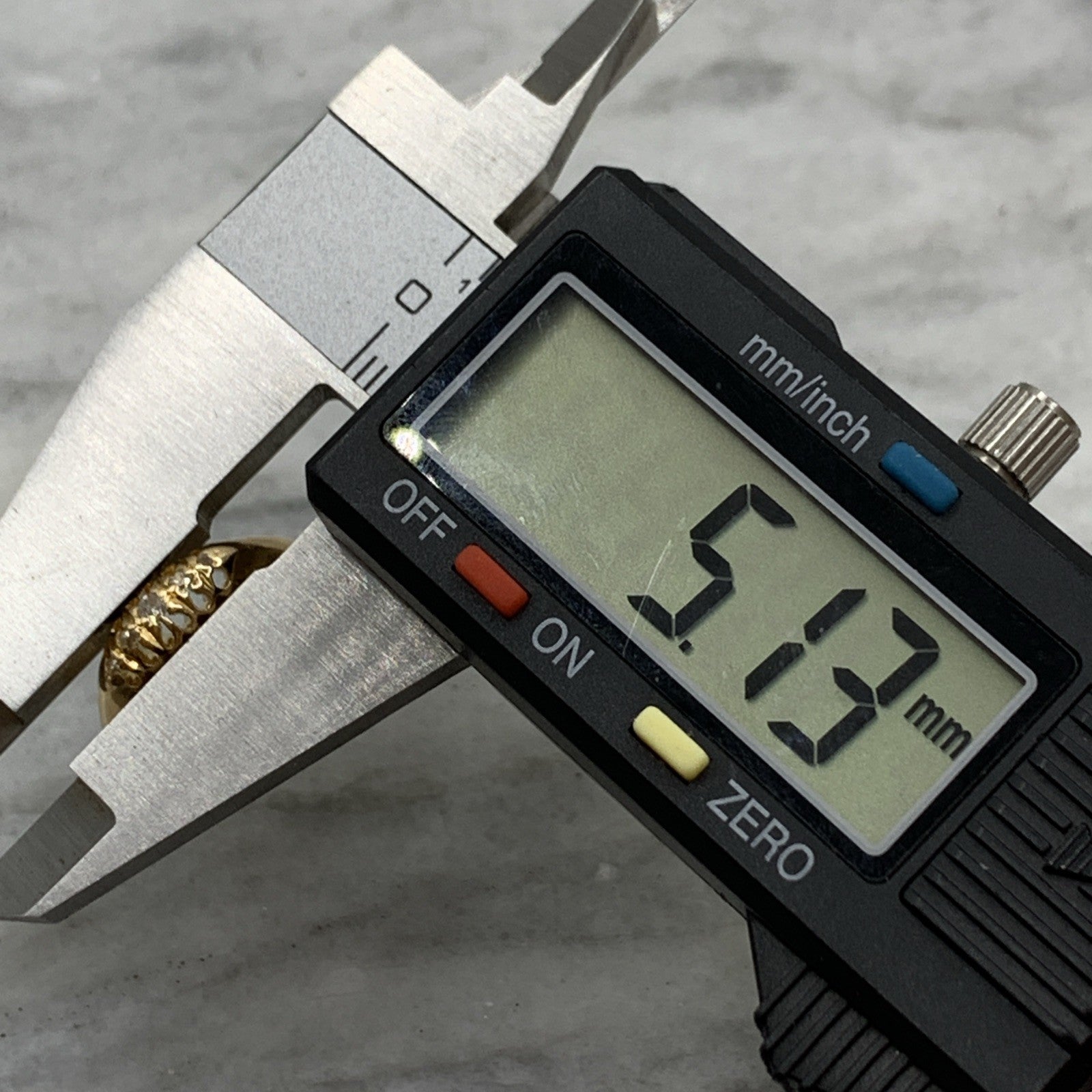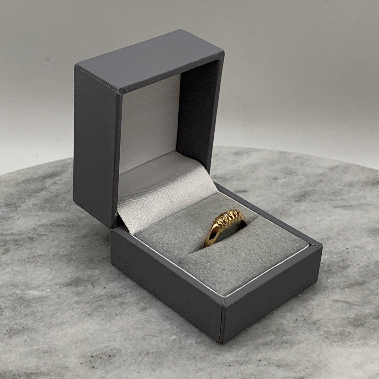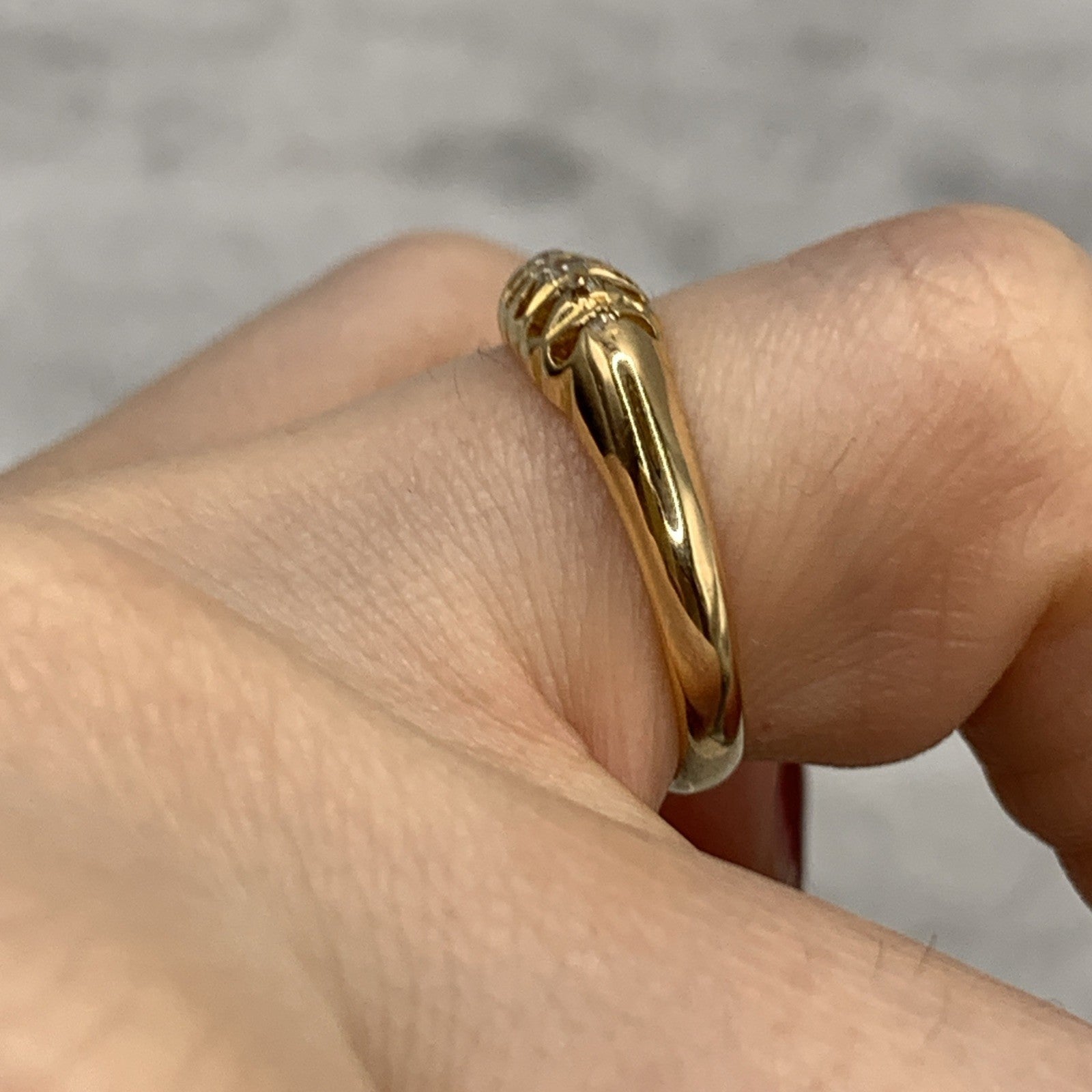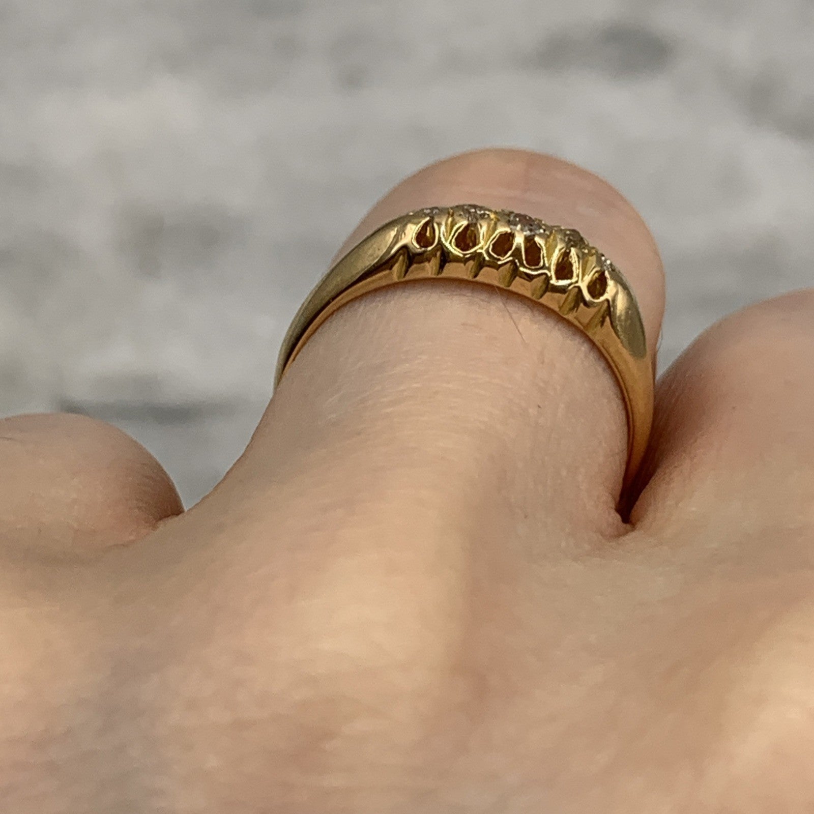 - A gorgeous antique boat style gold ring featuring five petite round cut diamonds.