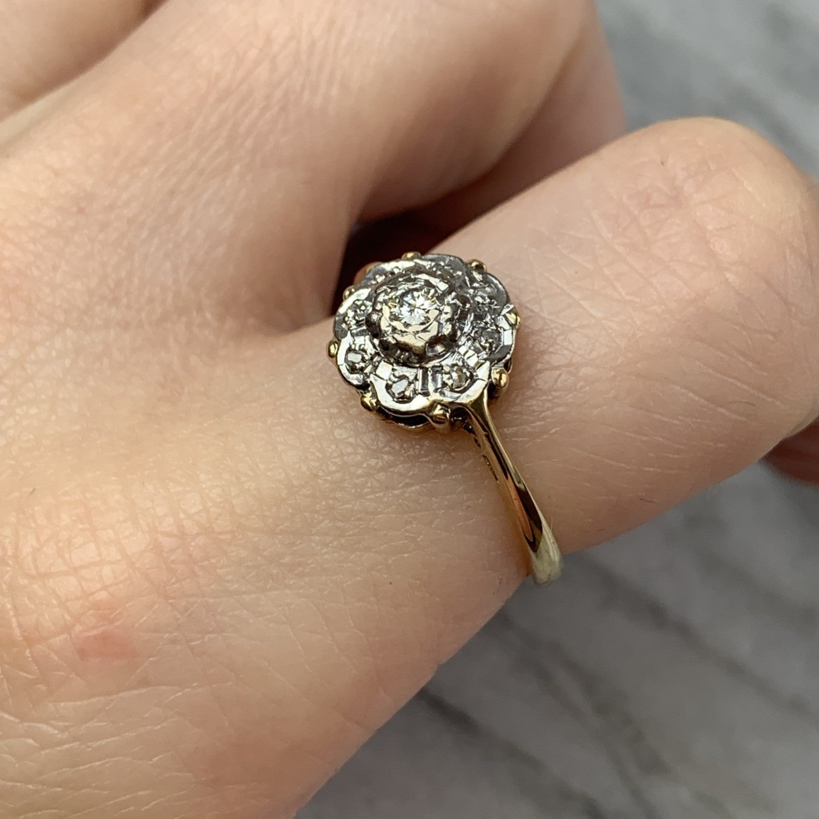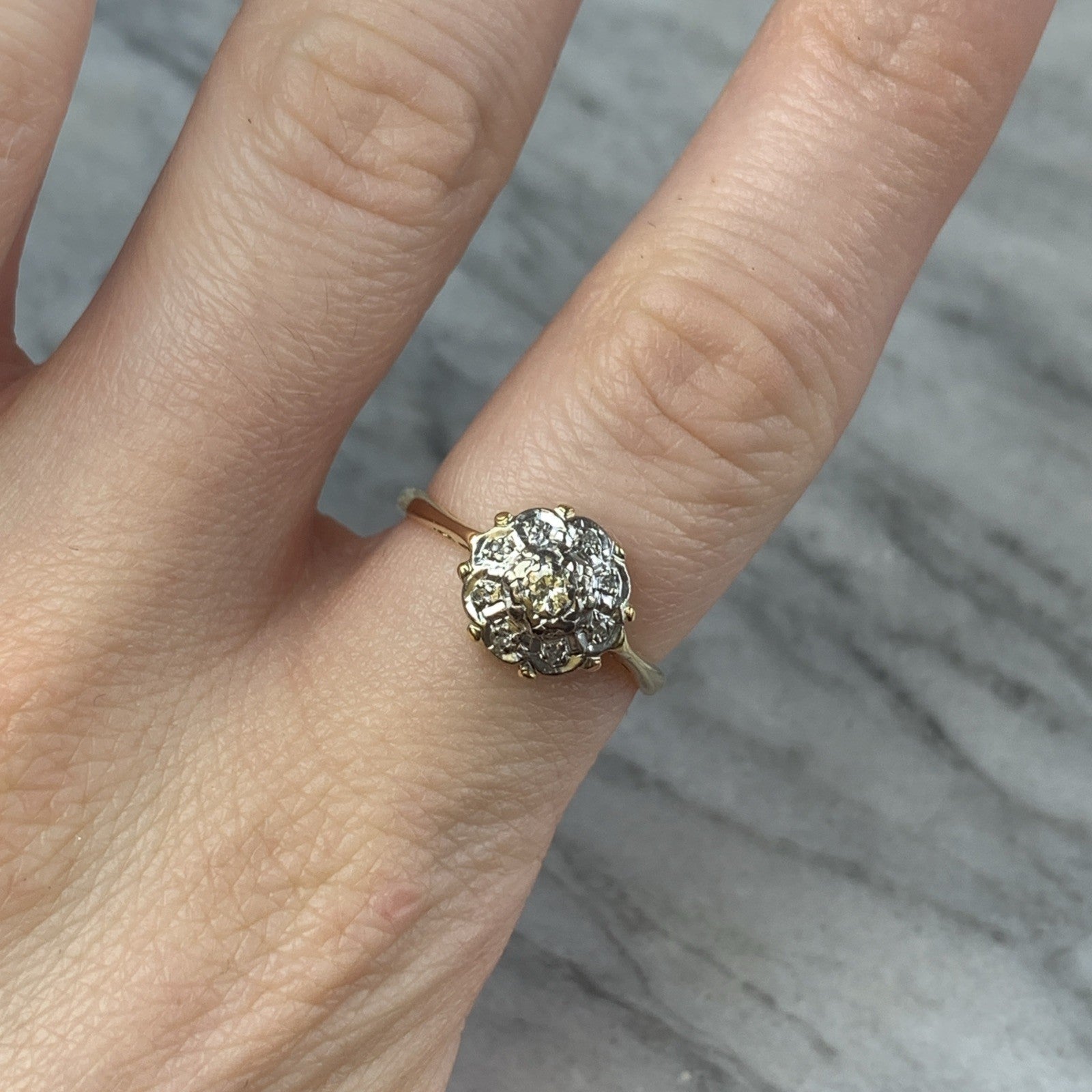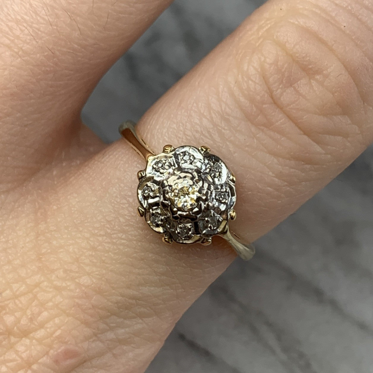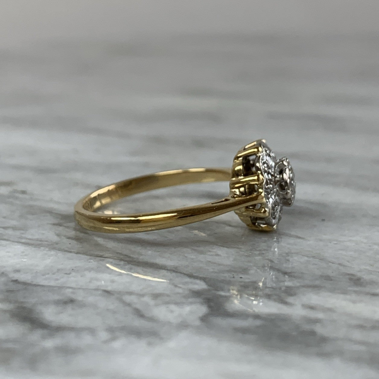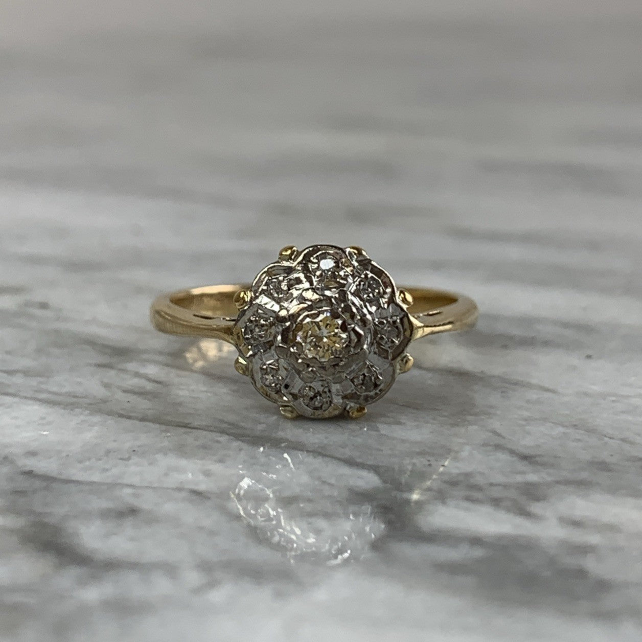 A lovely gold ring showcasing a floral cluster of illusion set diamonds.