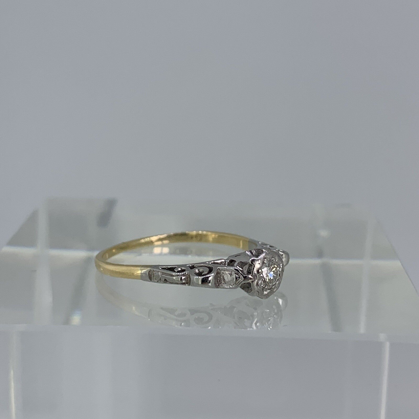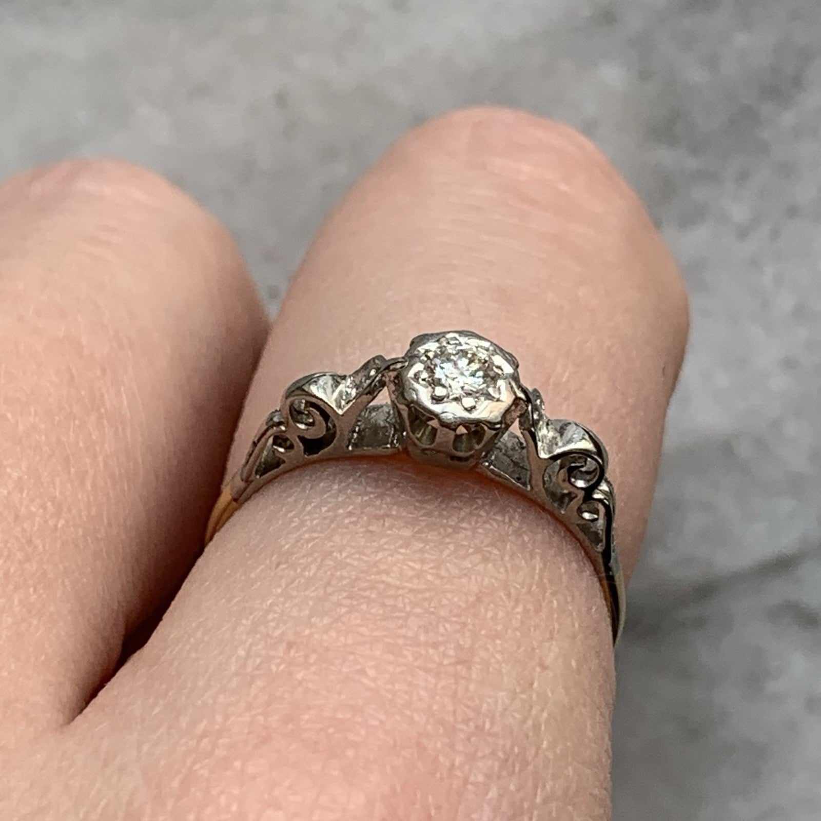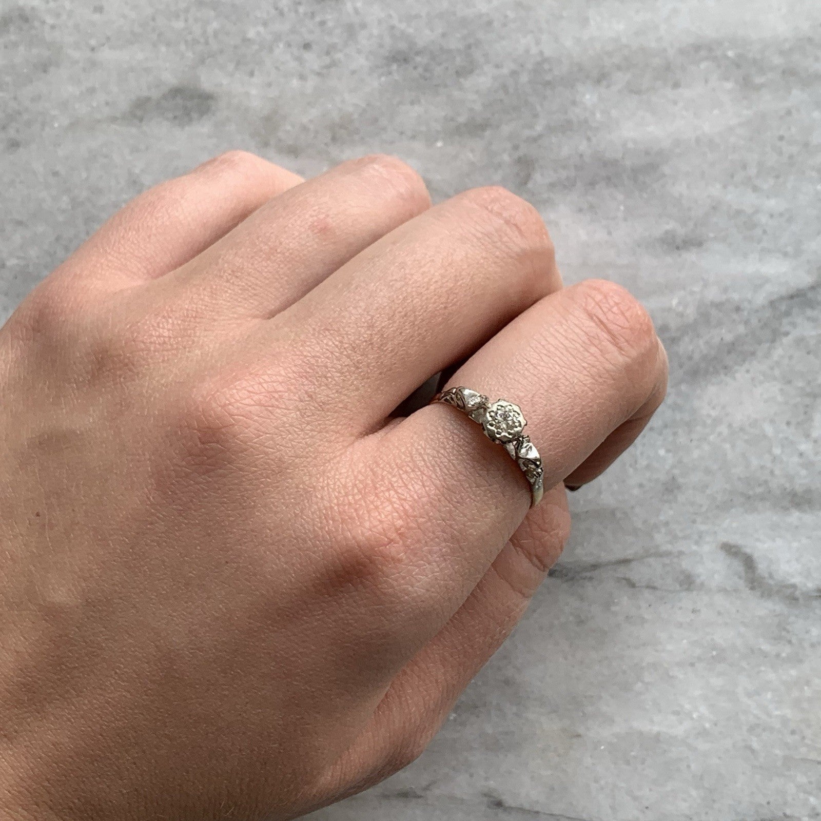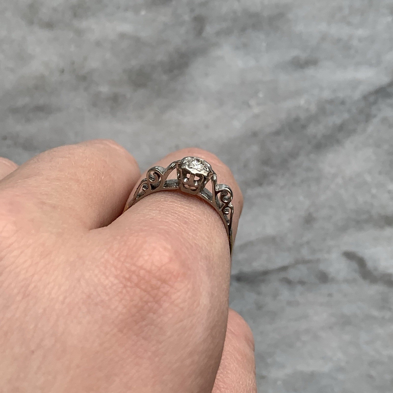 A beautiful vintage ring featuring a natural diamond in a platinum setting that resembles a tiara. Diamond approx. 0.17ct.