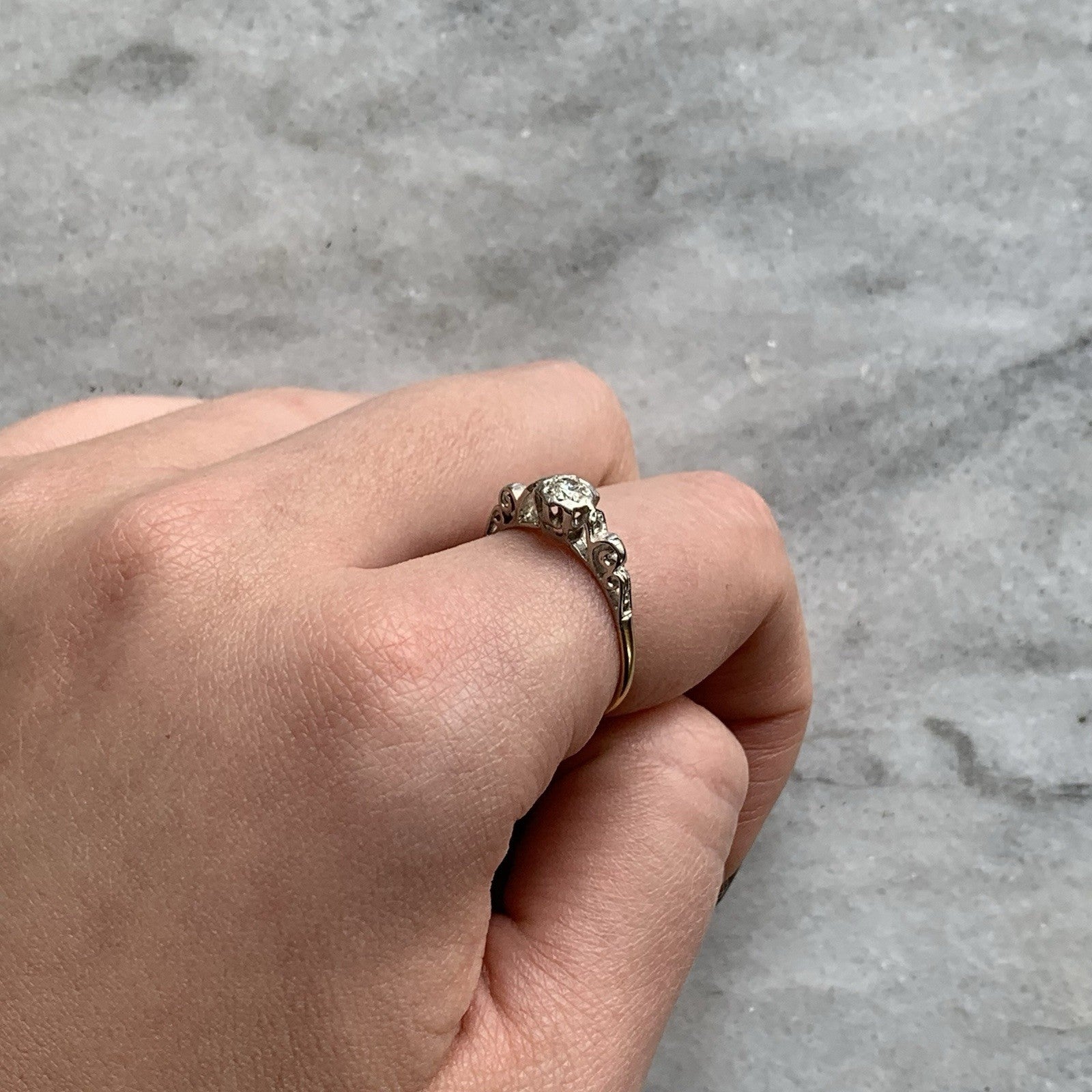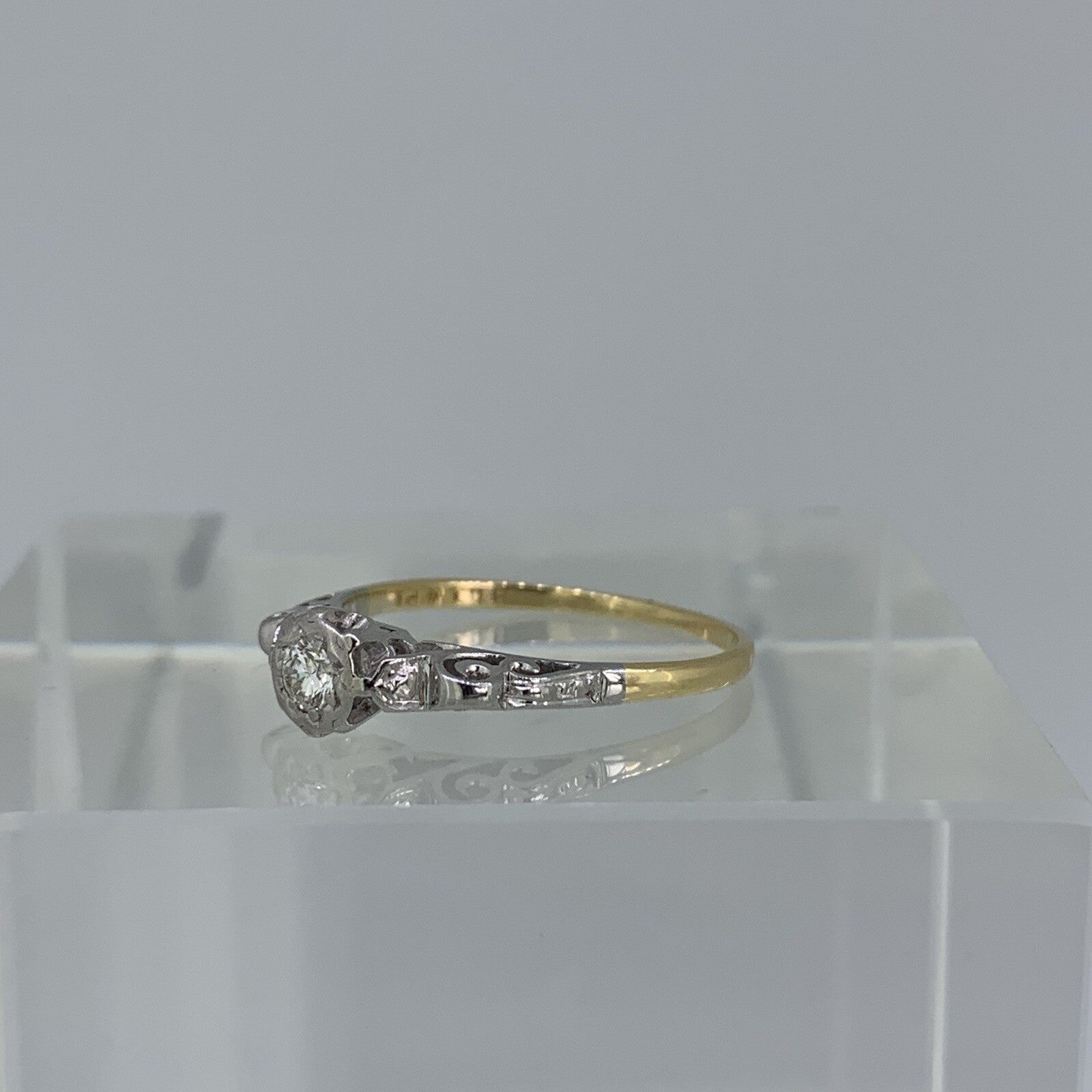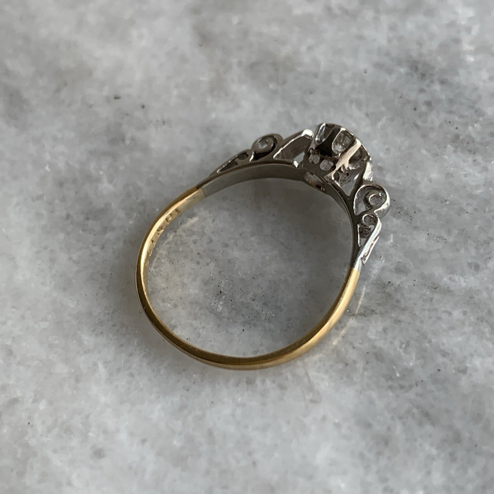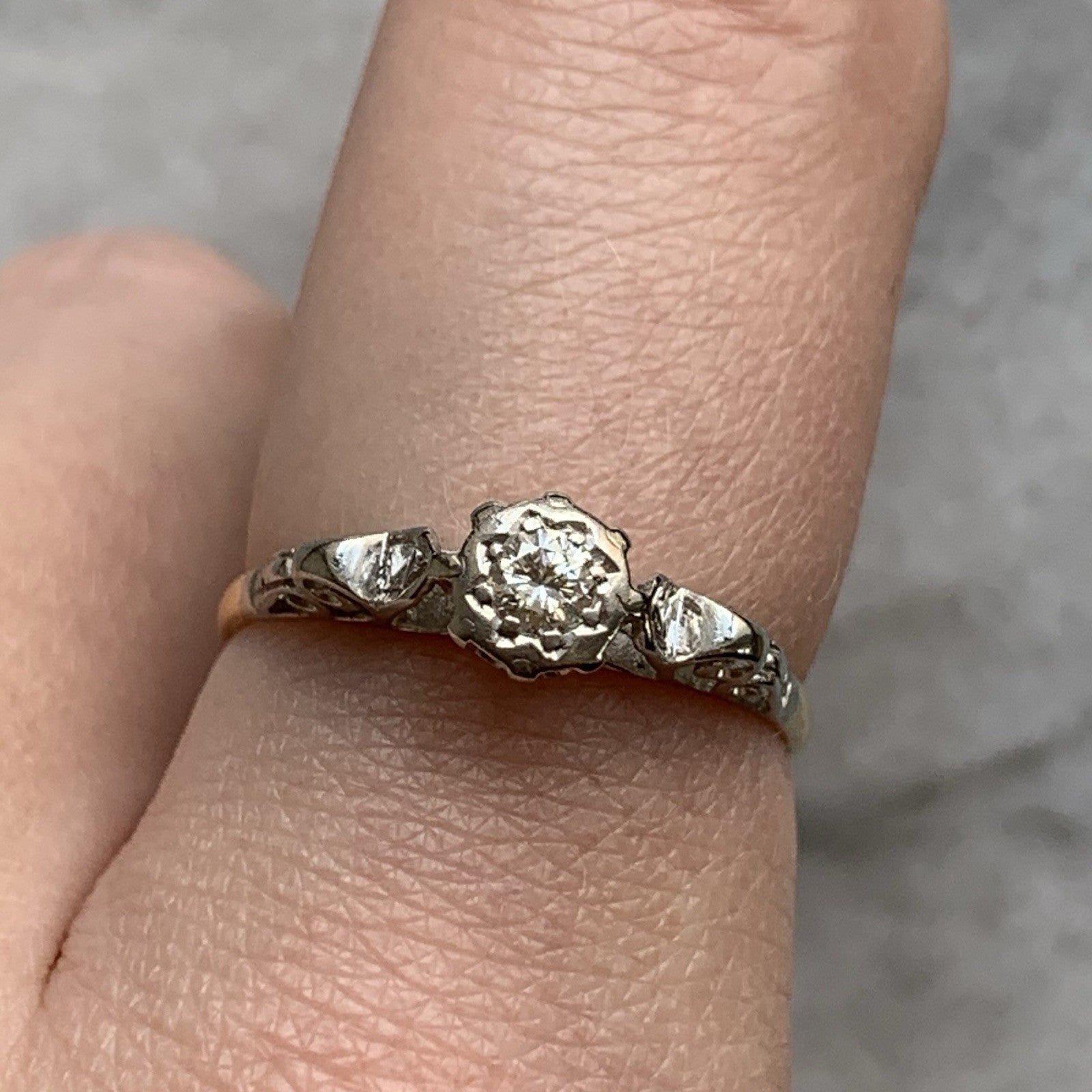 A beautiful vintage ring featuring a natural diamond in a platinum setting that resembles a tiara. Diamond approx. 0.17ct.