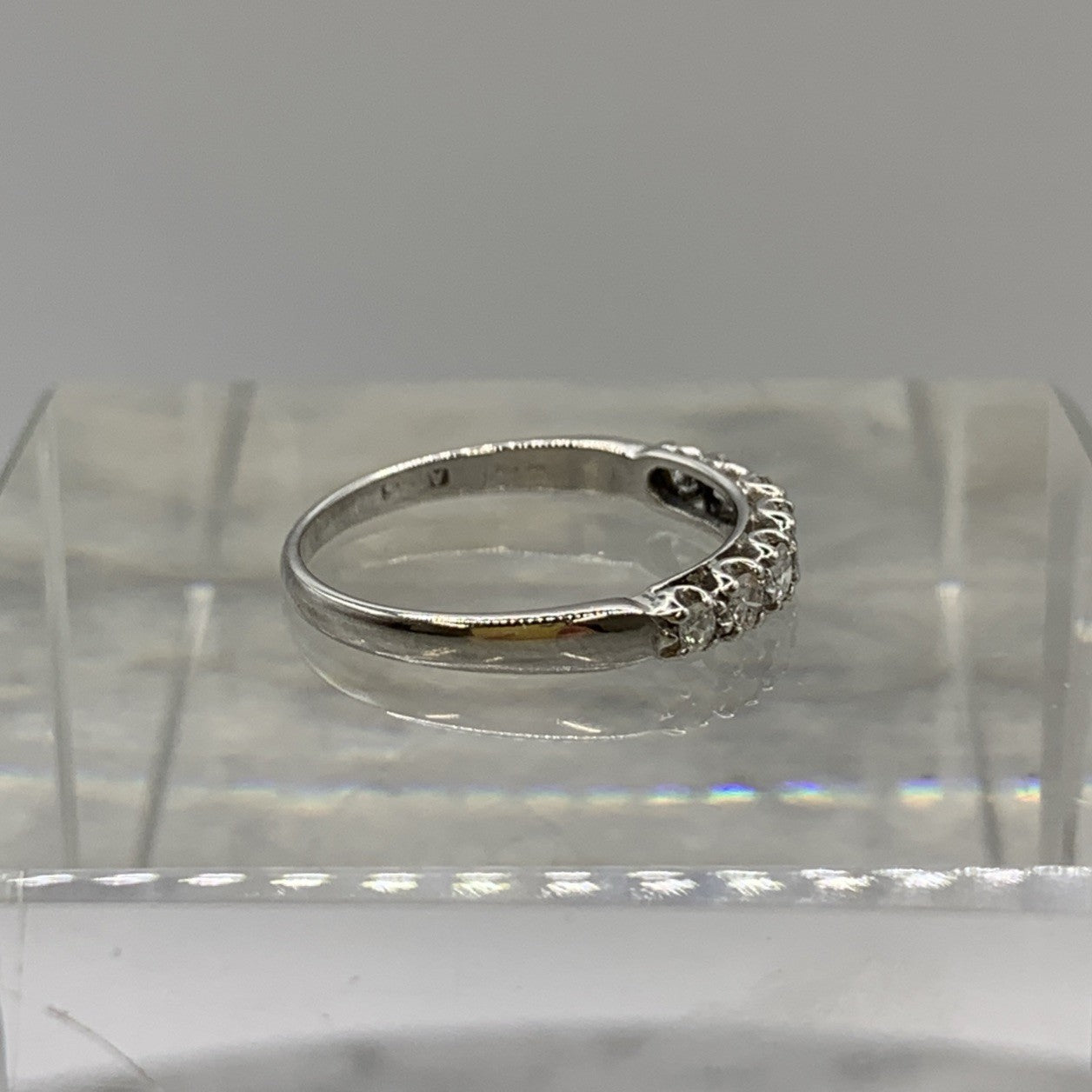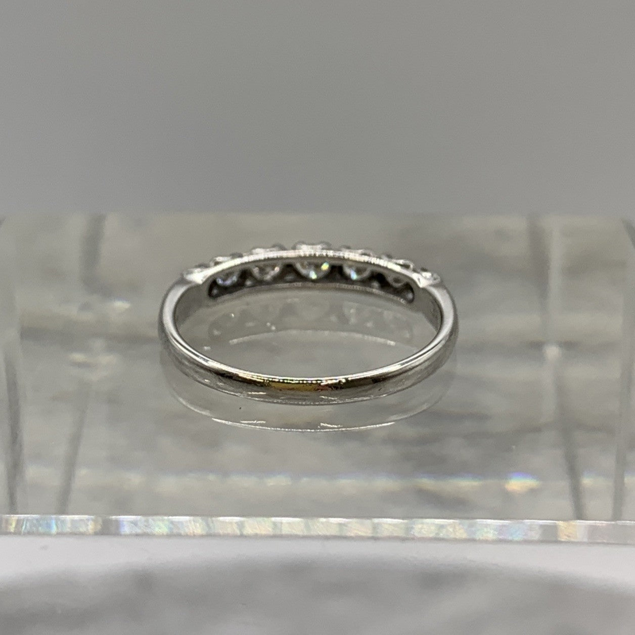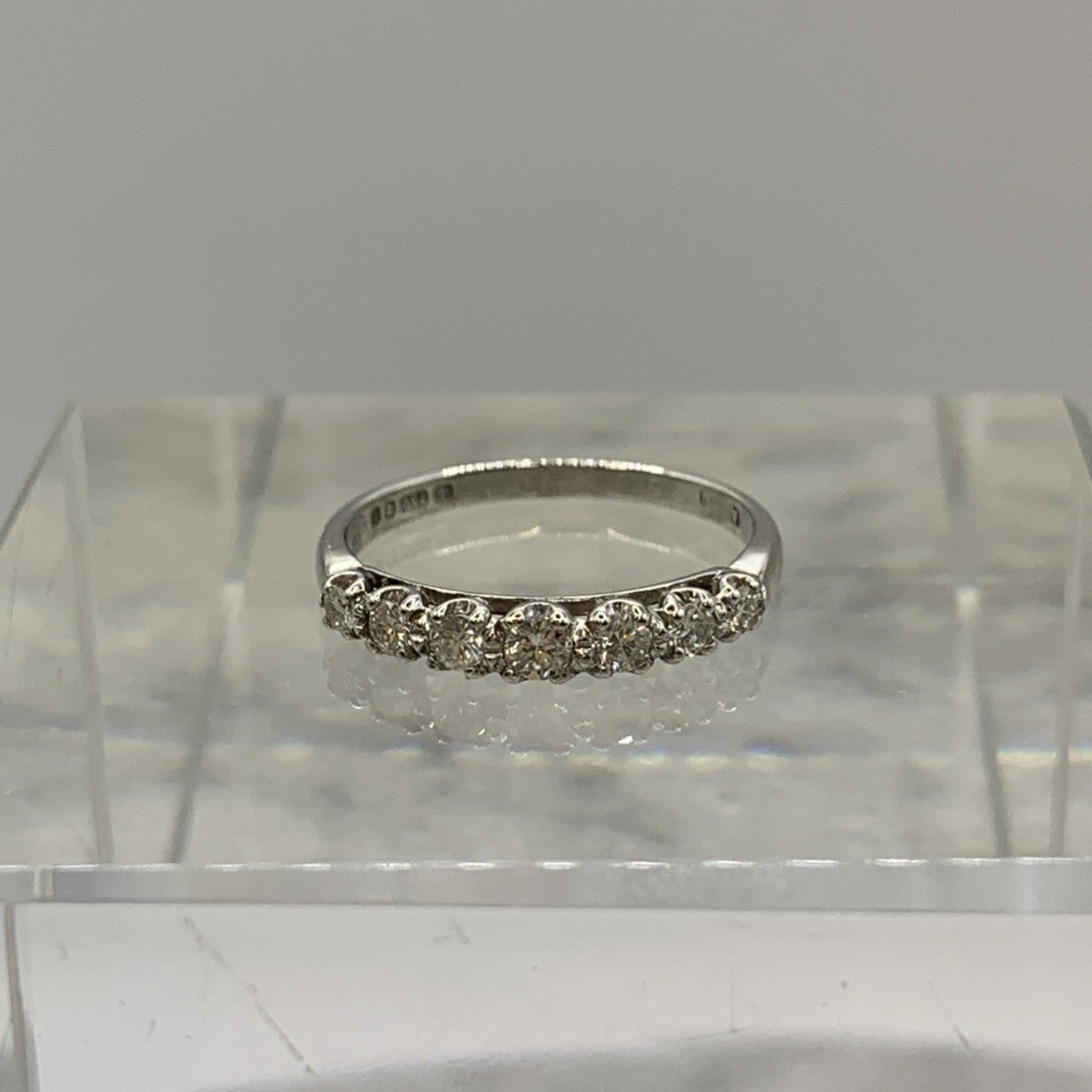 A beautiful 18ct white gold ring showcasing seven round cut diamonds.