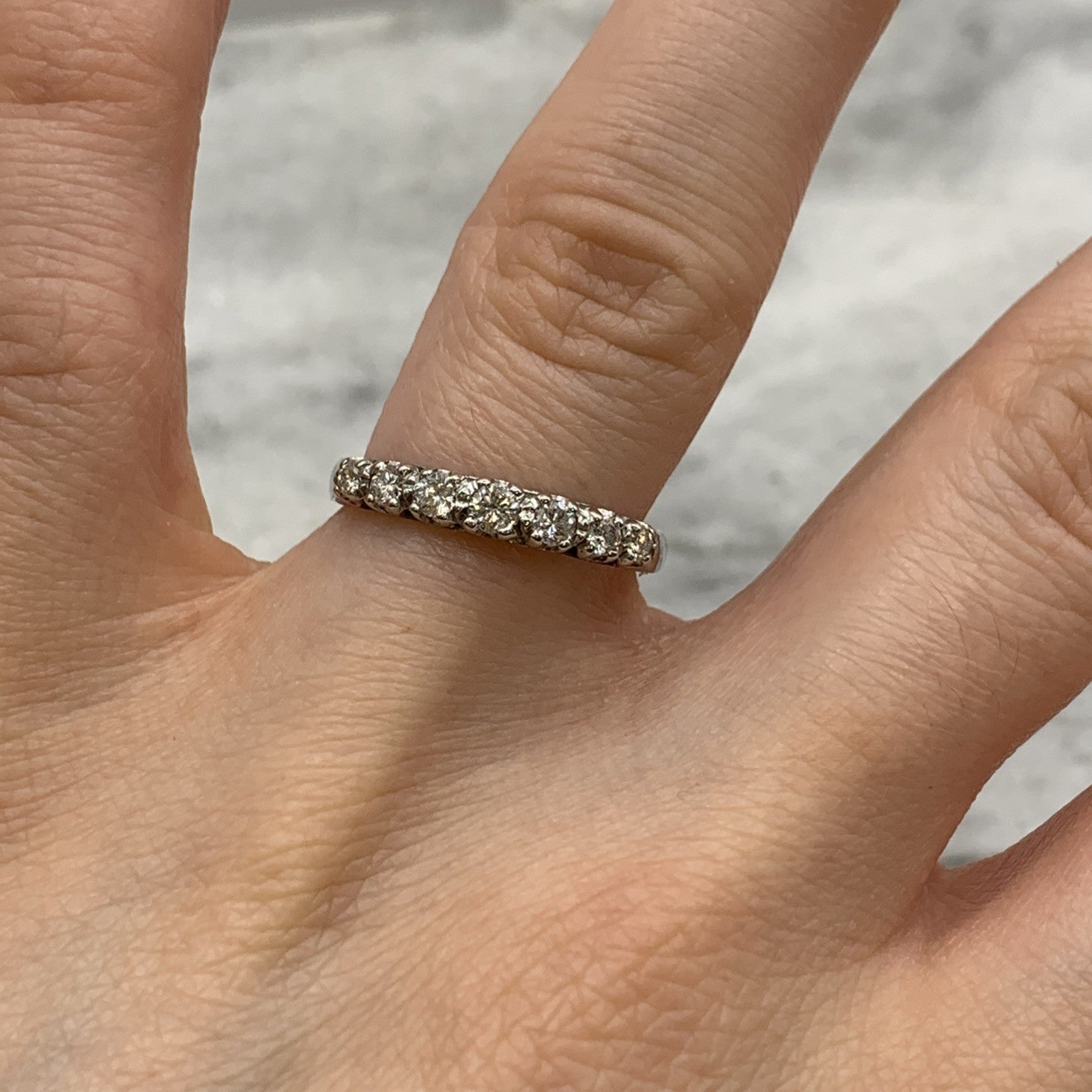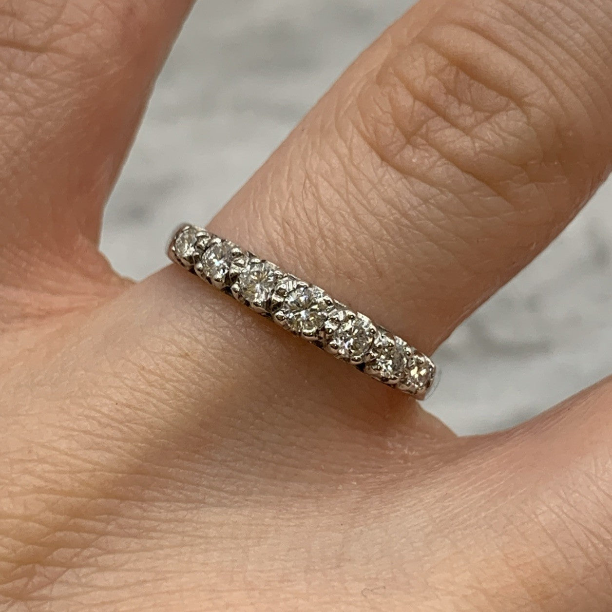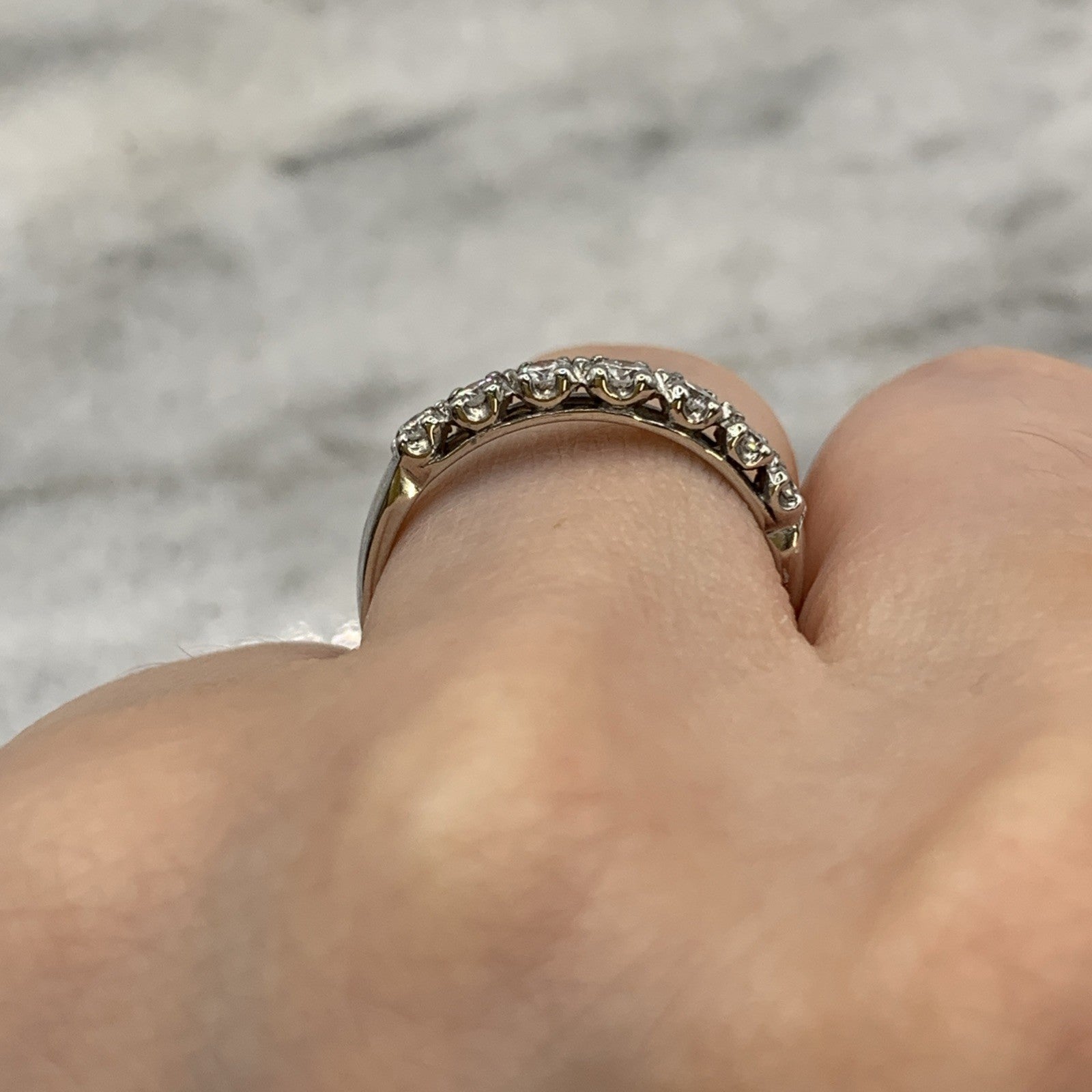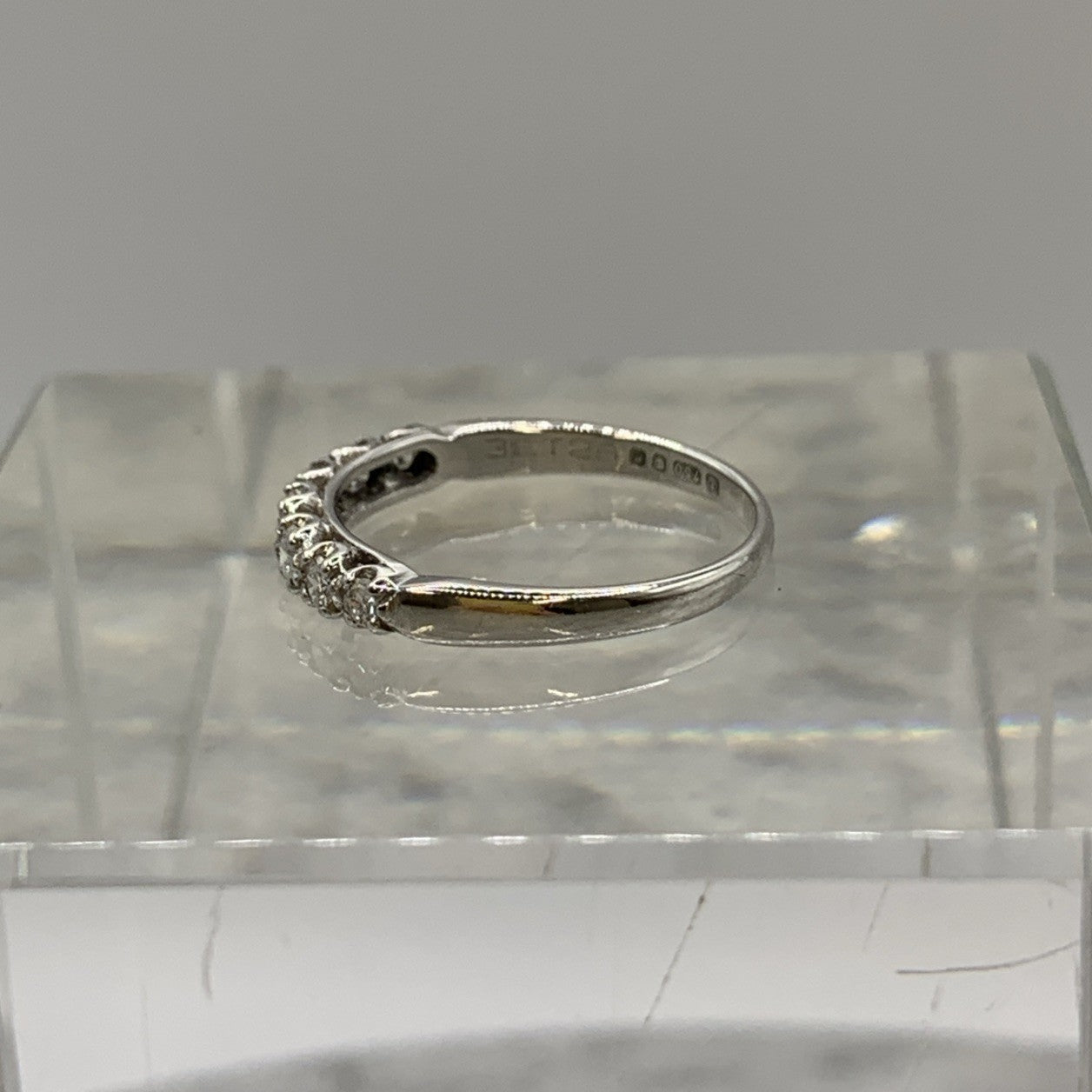 A beautiful 18ct white gold ring showcasing seven round cut diamonds.