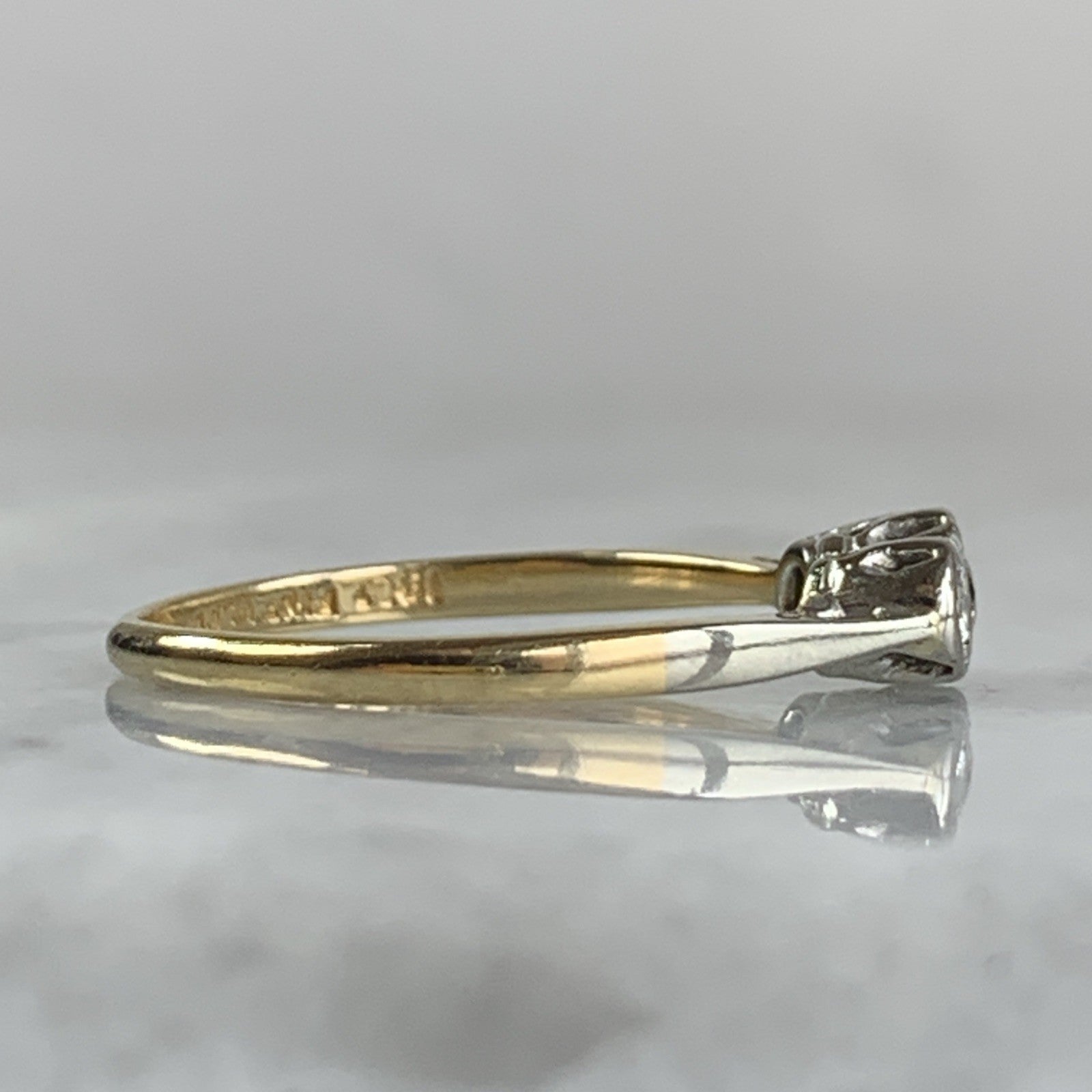 A beautiful gold ring featuring a trilogy of round cut diamonds in a platinum setting.
