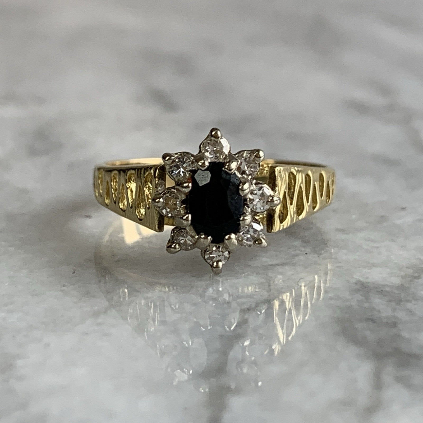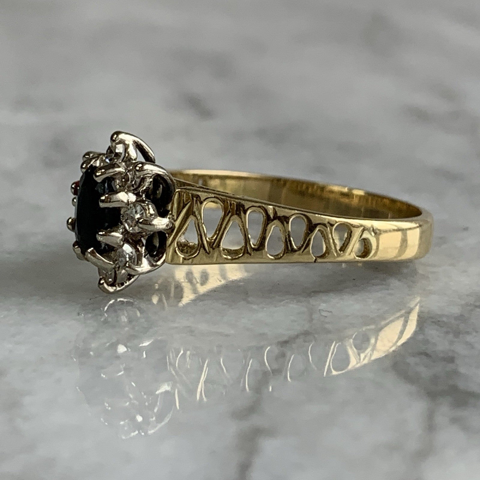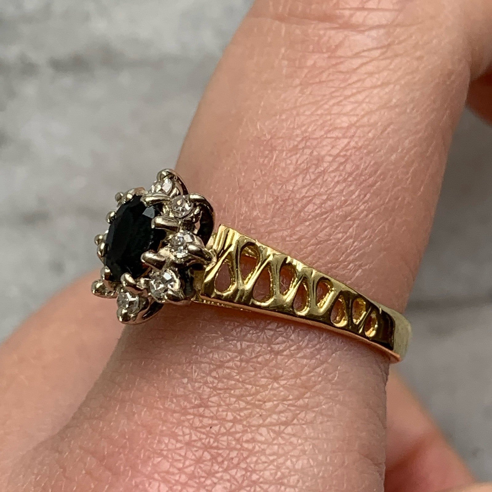 A gorgeous gold ring showcasing an oval cut sapphire accented by a halo of diamonds, upon antique style shoulders with cut out detailing.