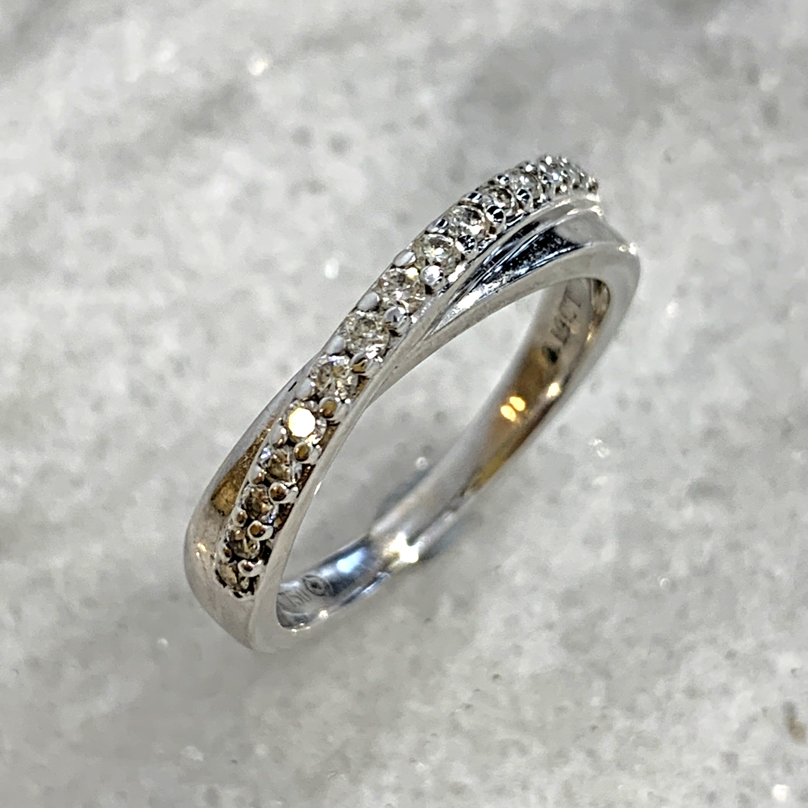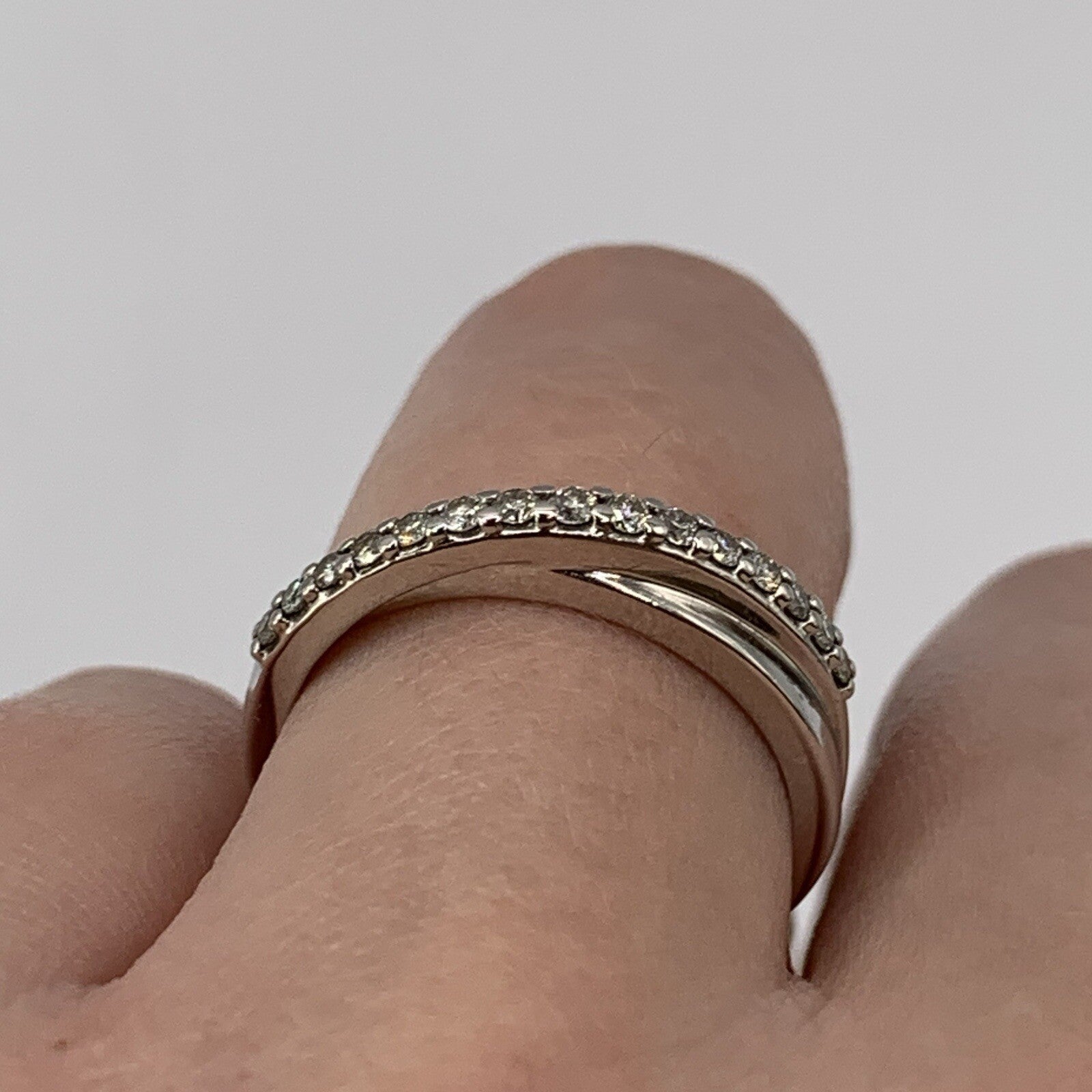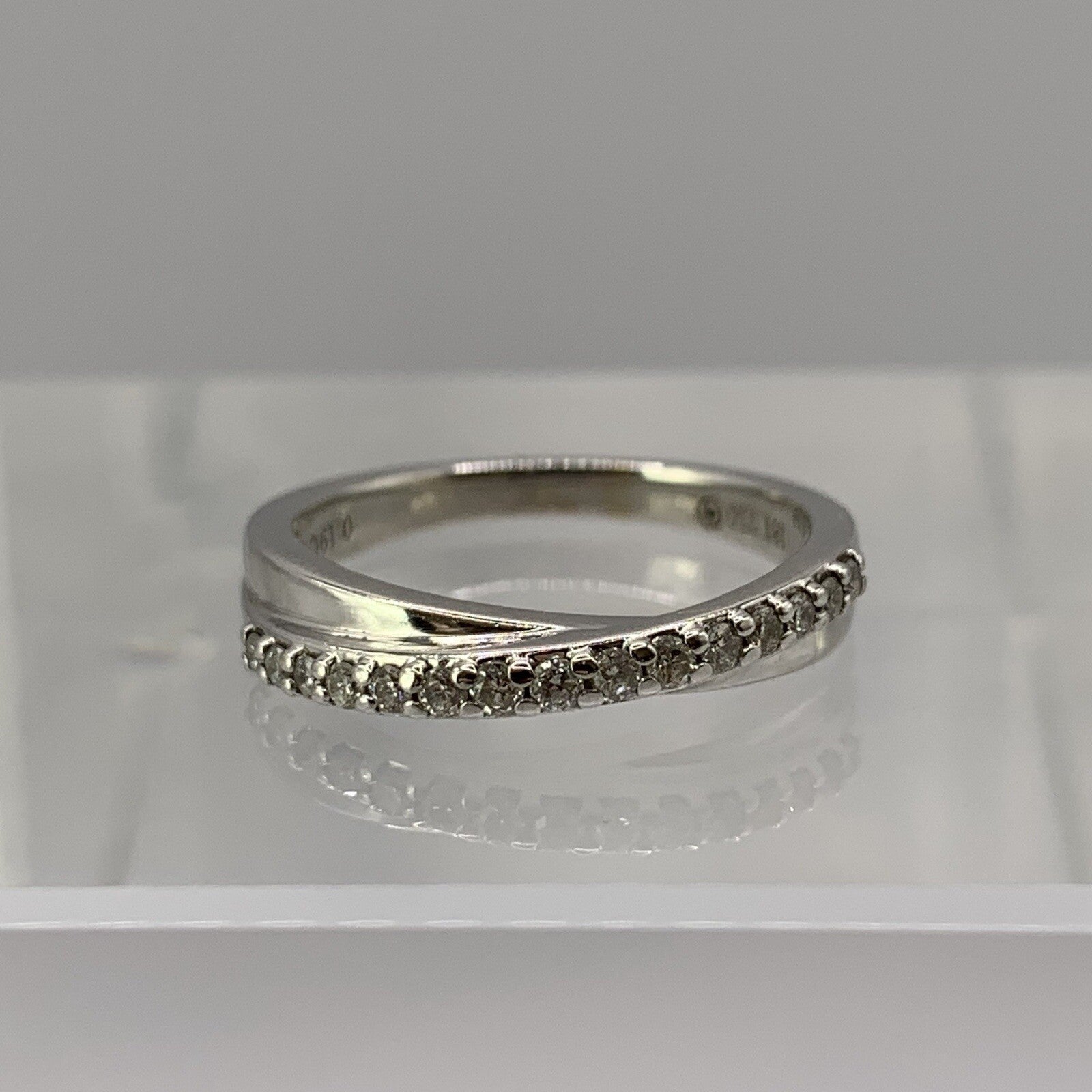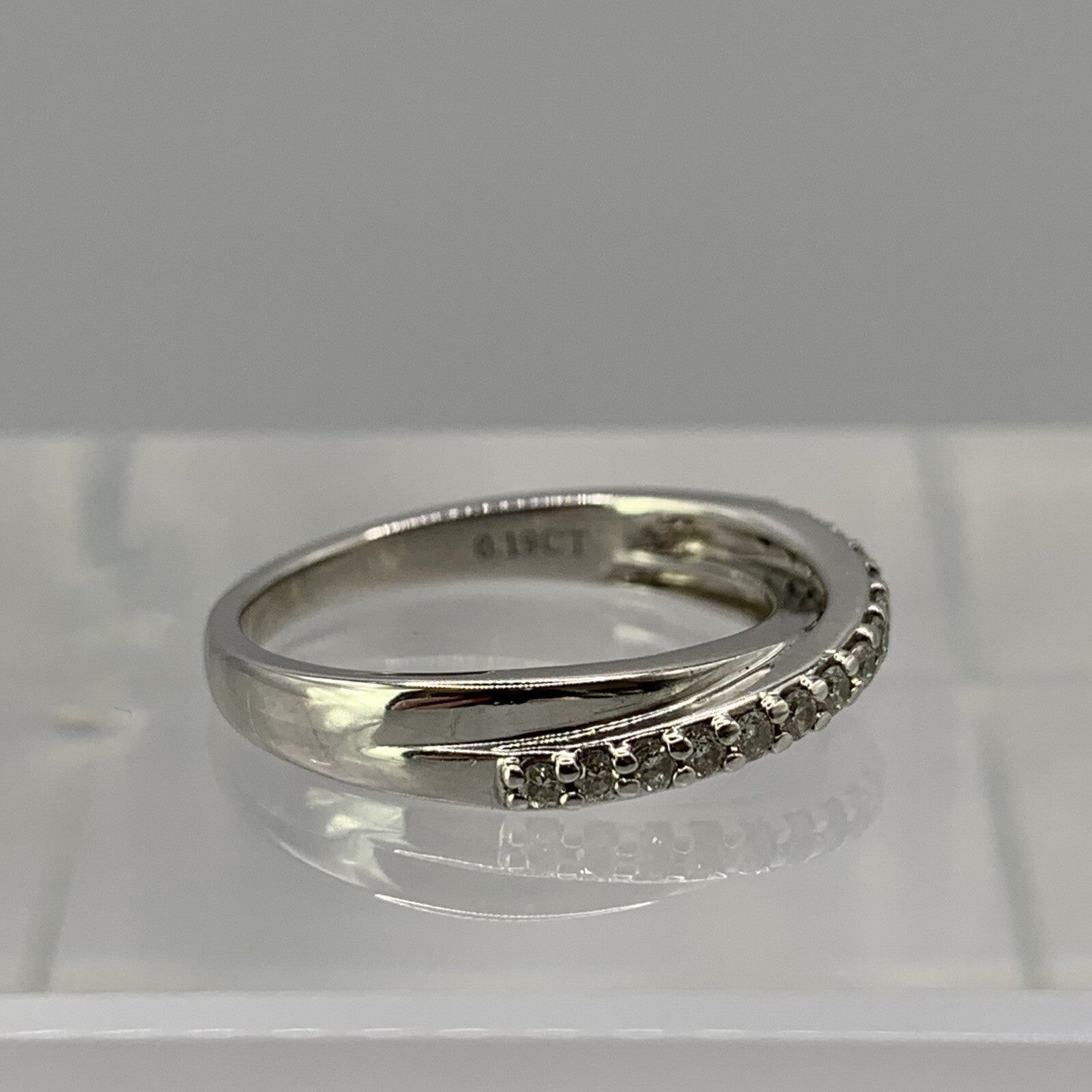 - A timeless white gold crossover style band ring featuring a row of diamonds amounting to .19ct.