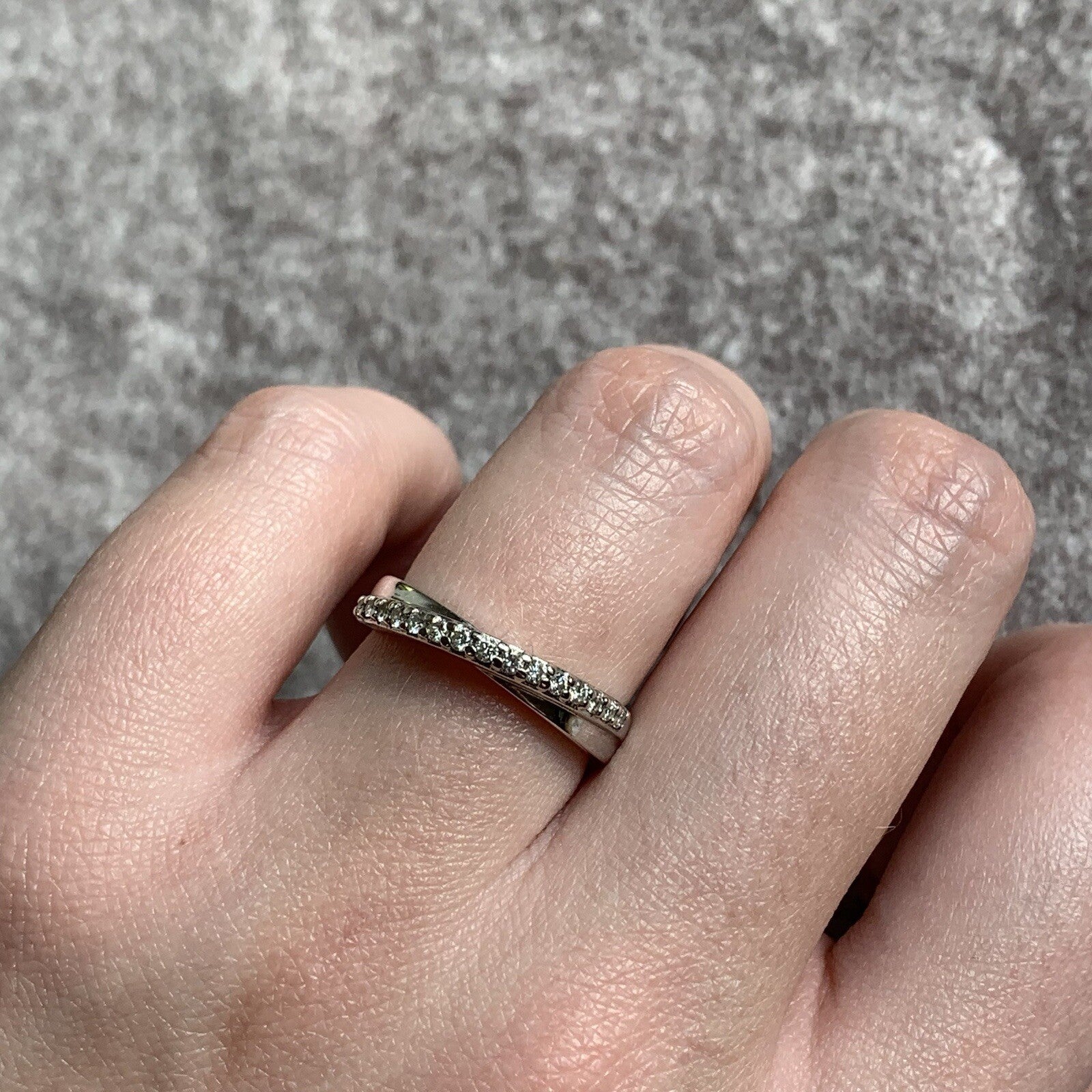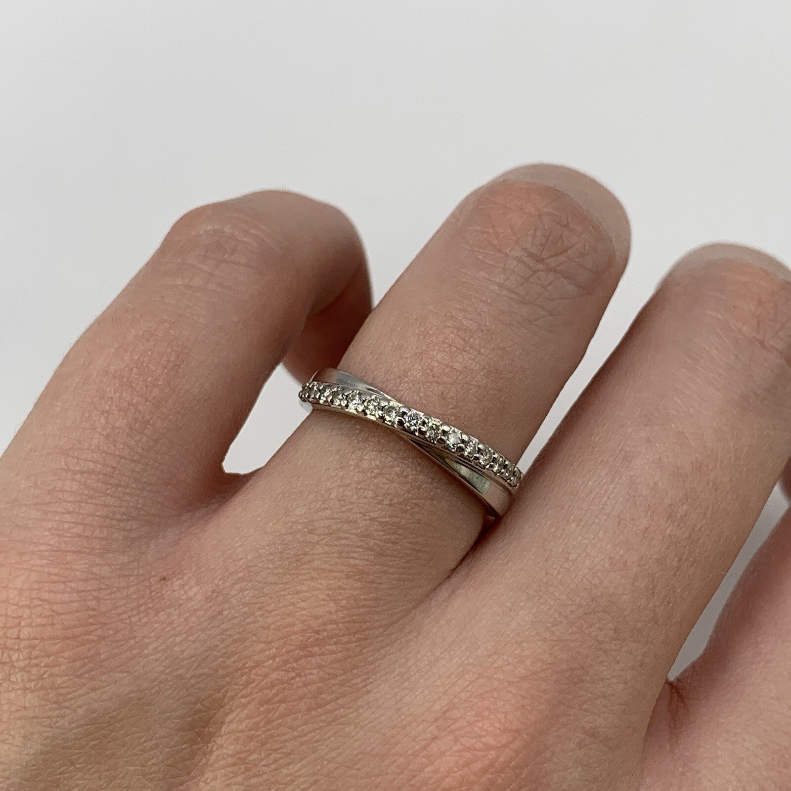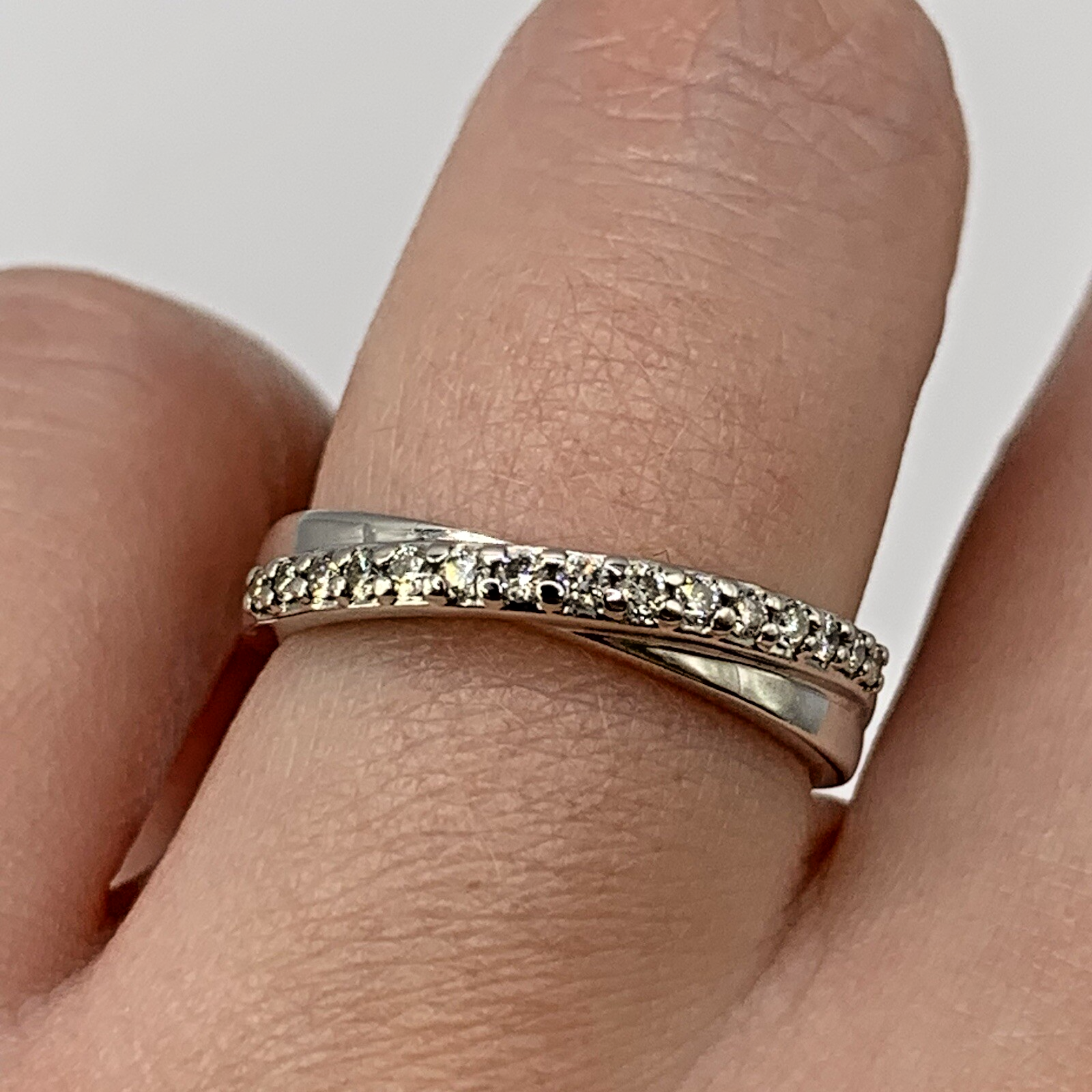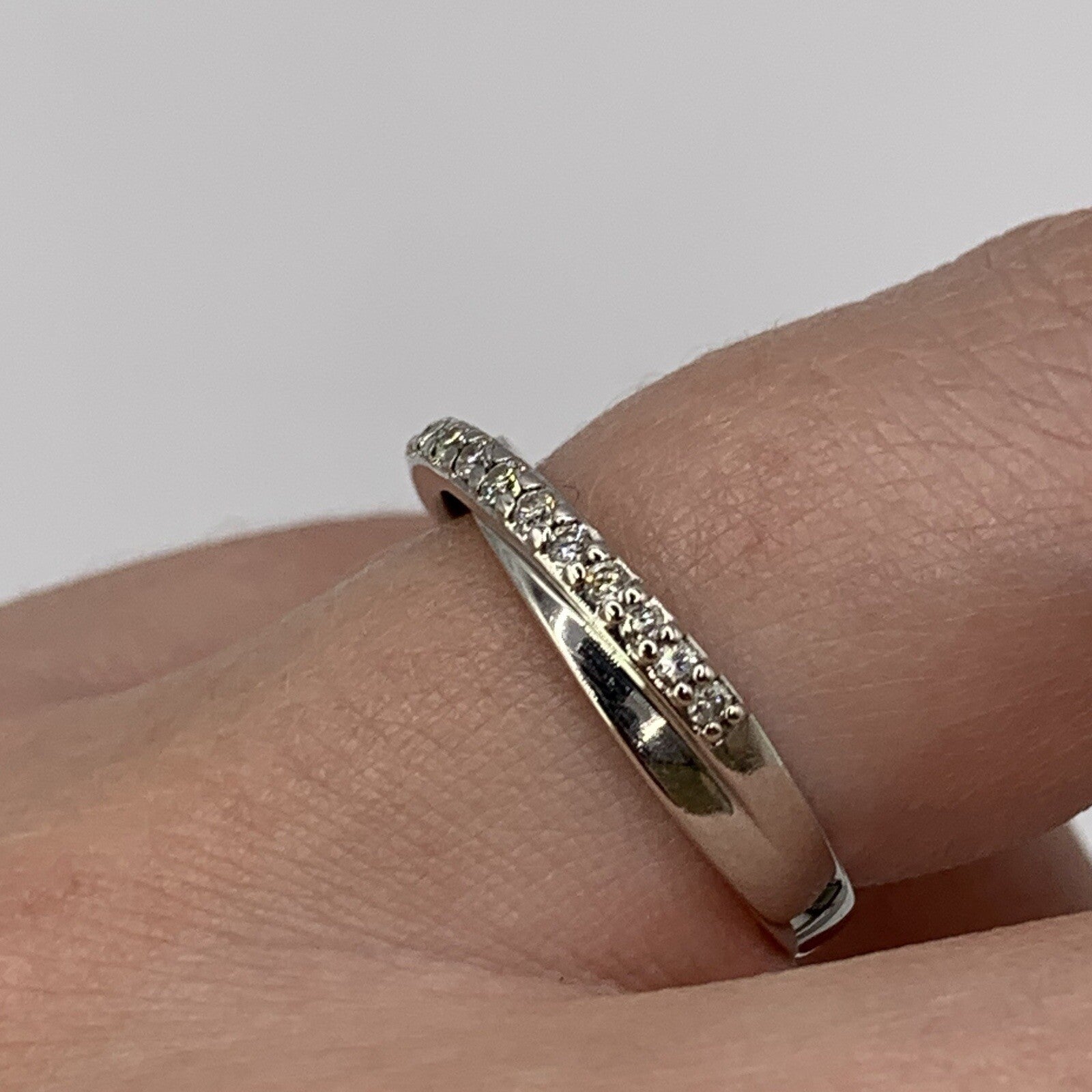 - A timeless white gold crossover style band ring featuring a row of diamonds amounting to .19ct.