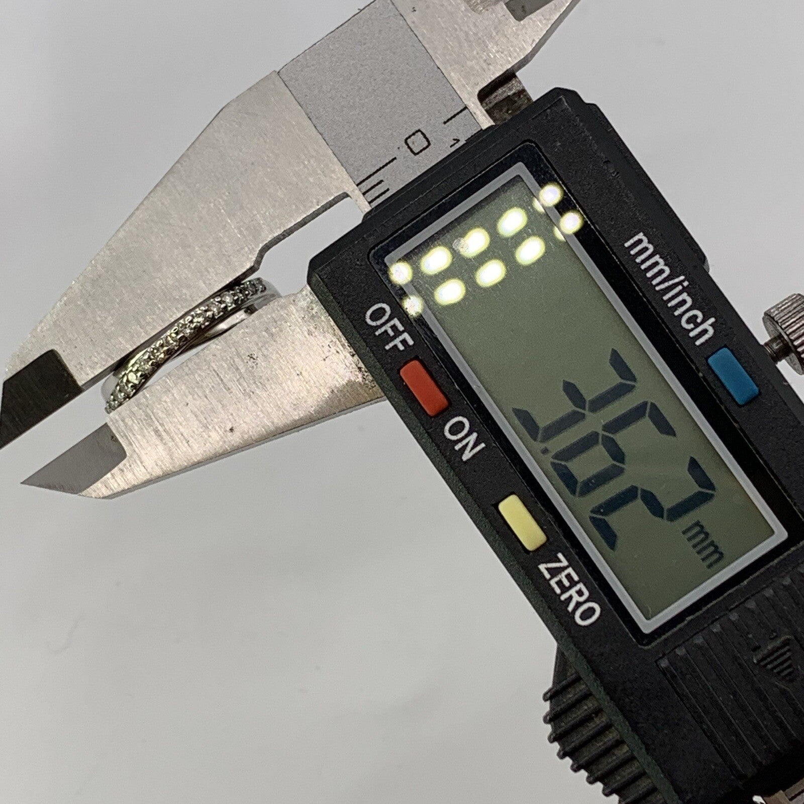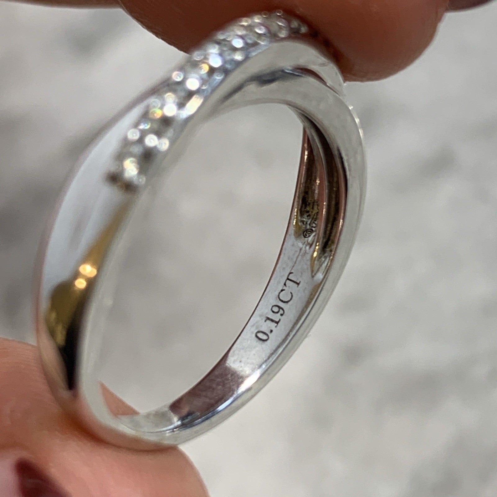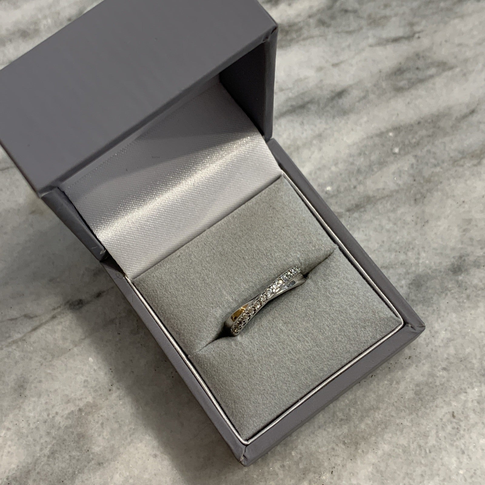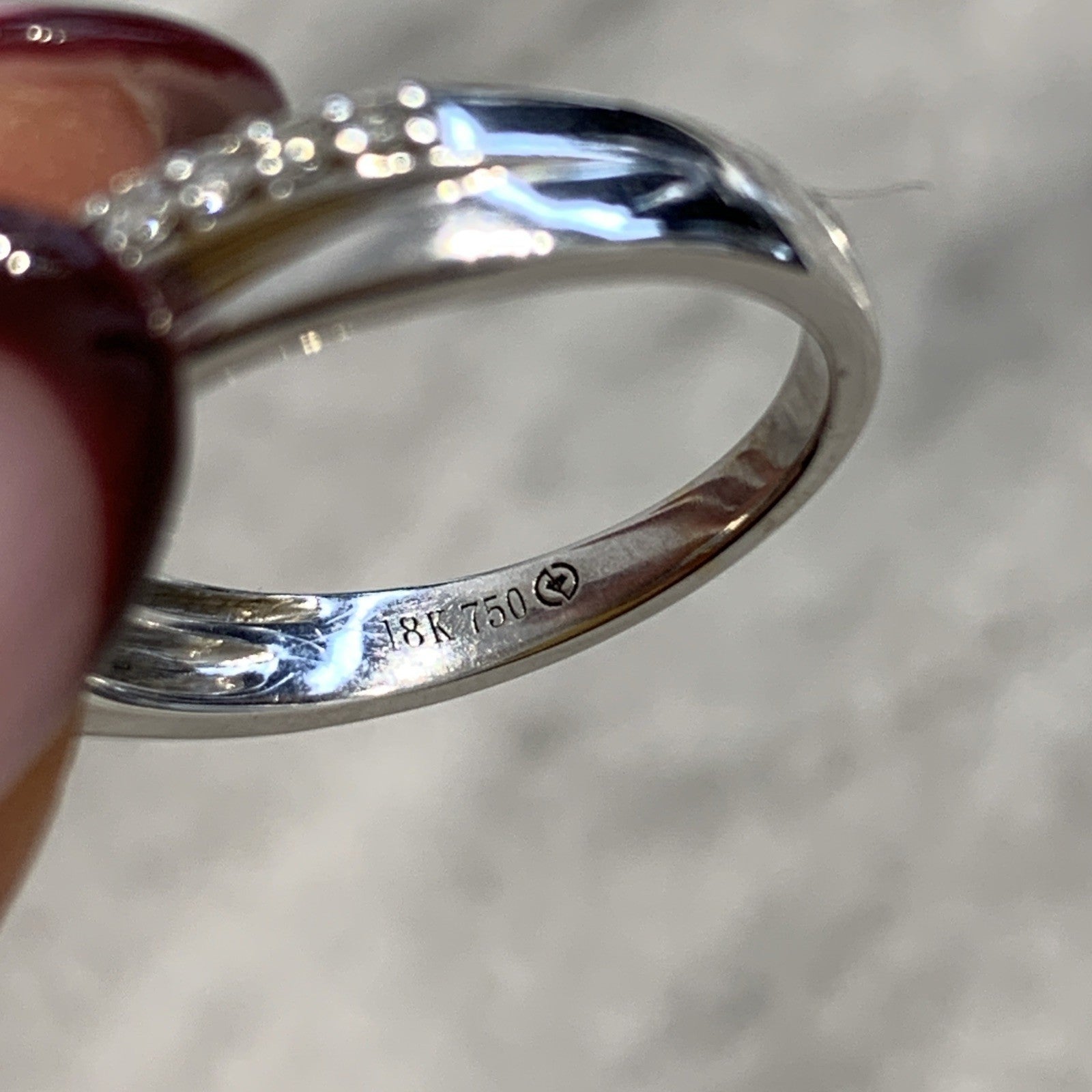 - A timeless white gold crossover style band ring featuring a row of diamonds amounting to .19ct.