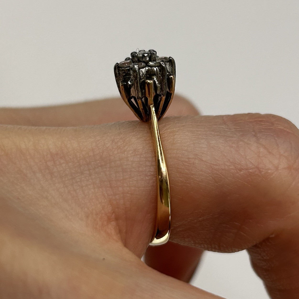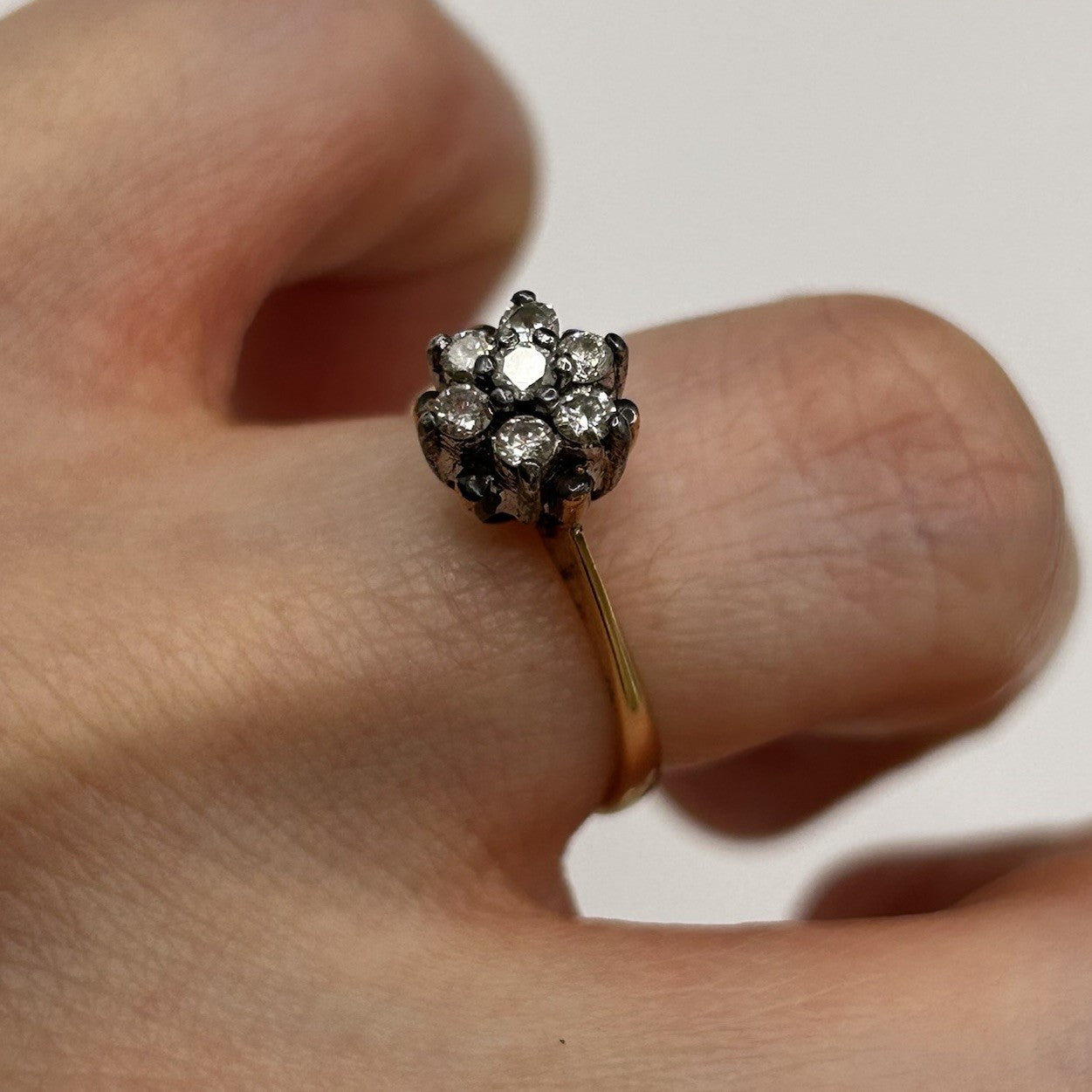 A beautiful antique gold ring showcasing a daisy flower style cluster of diamonds.