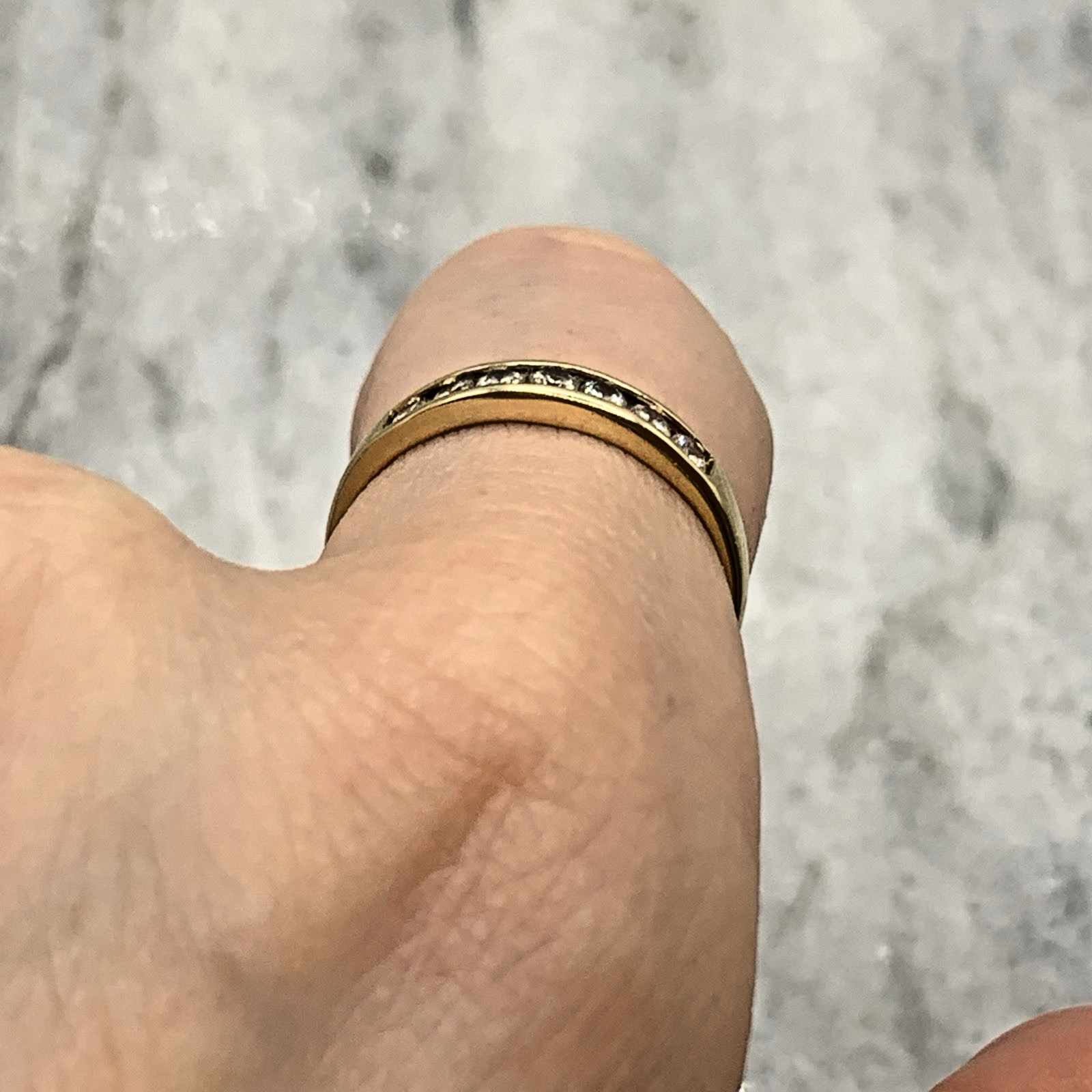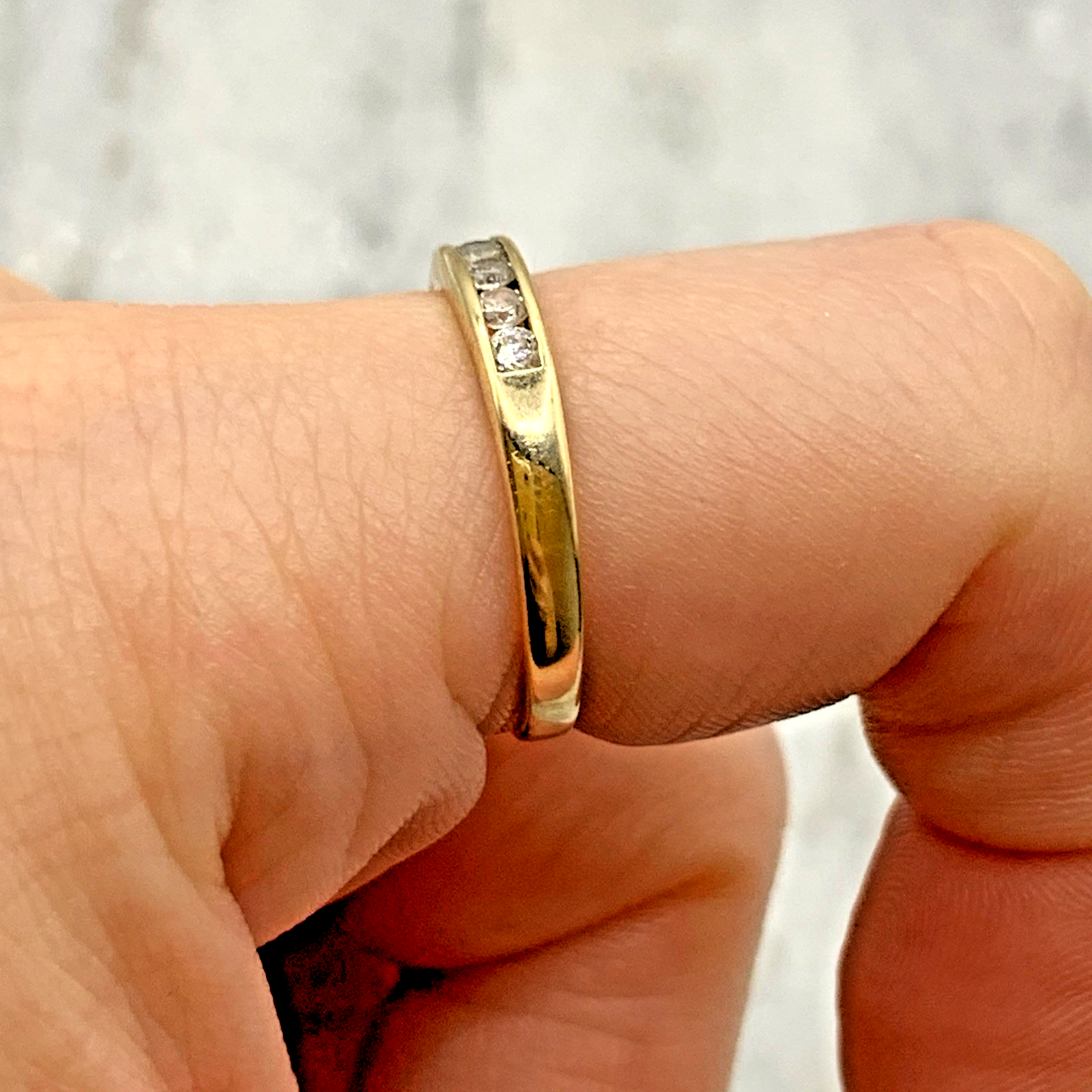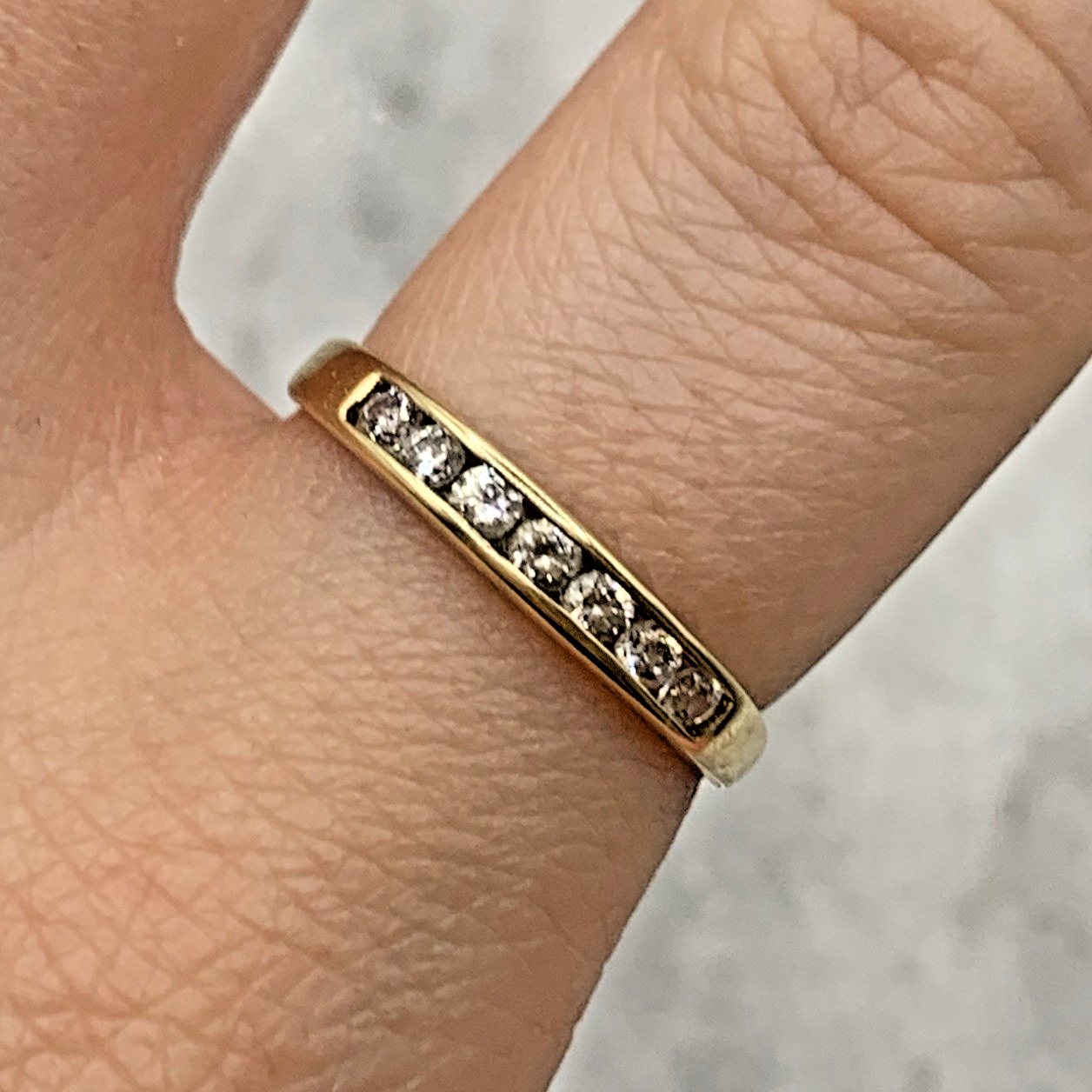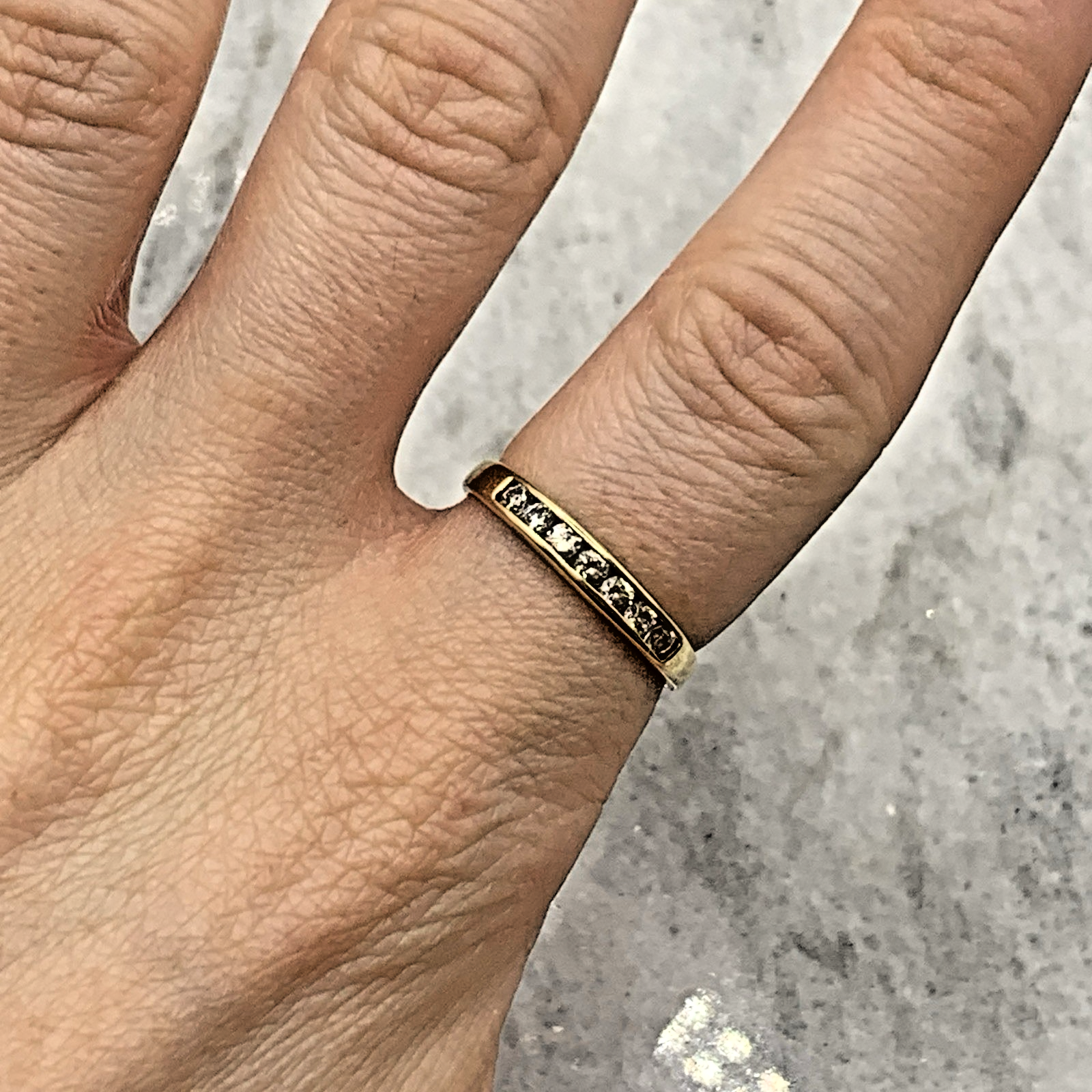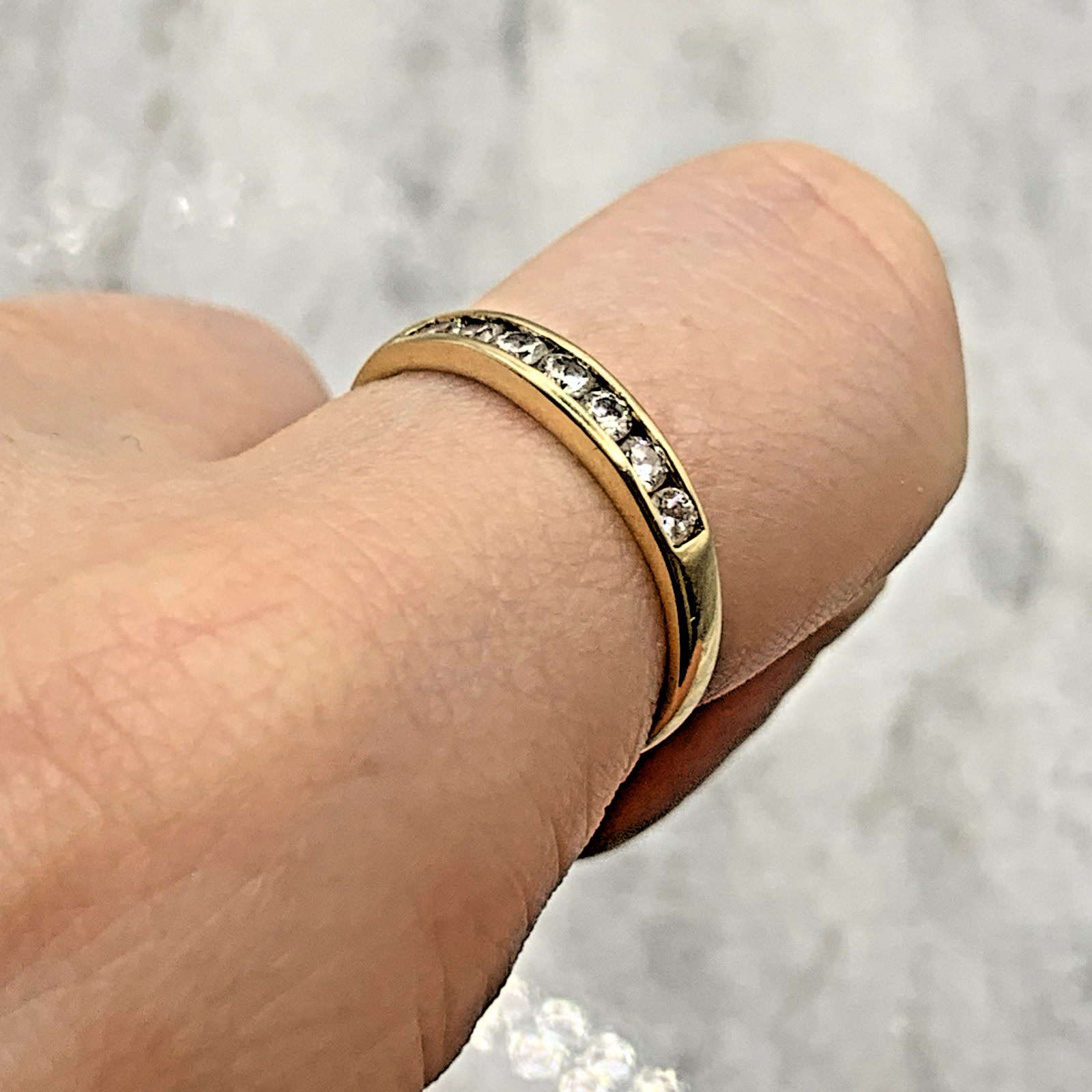 A lovely gold band ring featuring a channel of cubic zirconia gemstones.