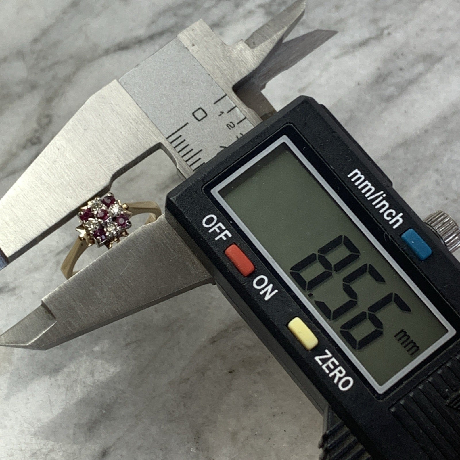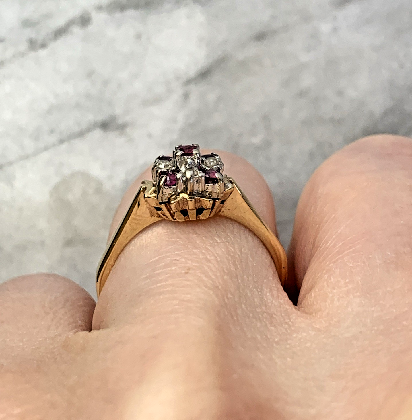 A beautiful gold ring featuring a cluster of round cut rubies and diamonds.