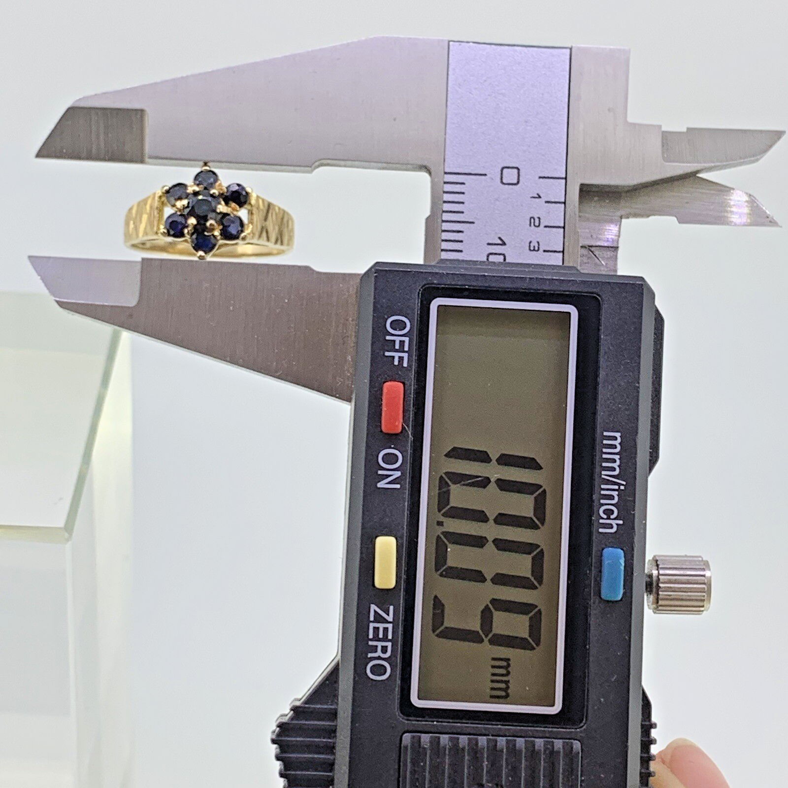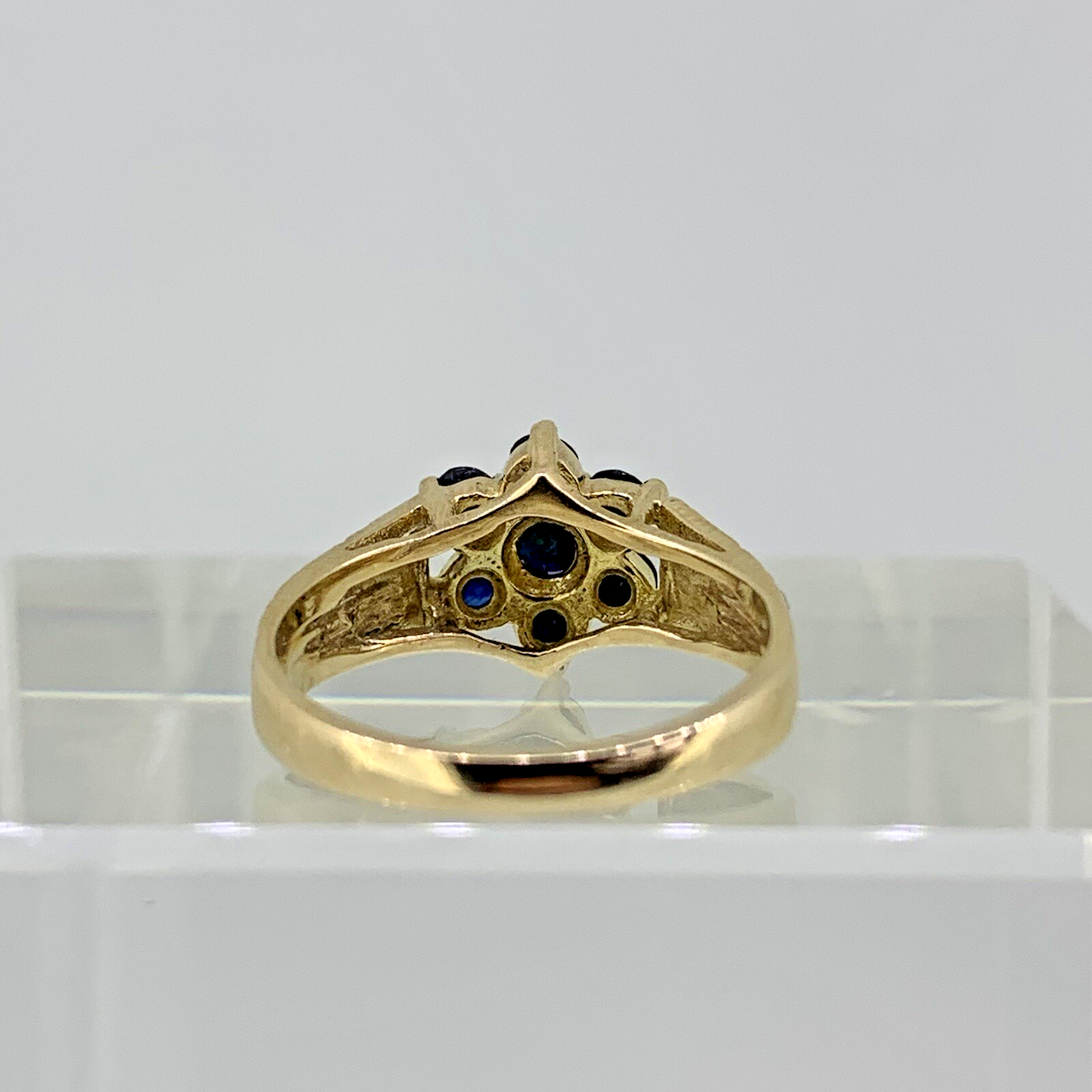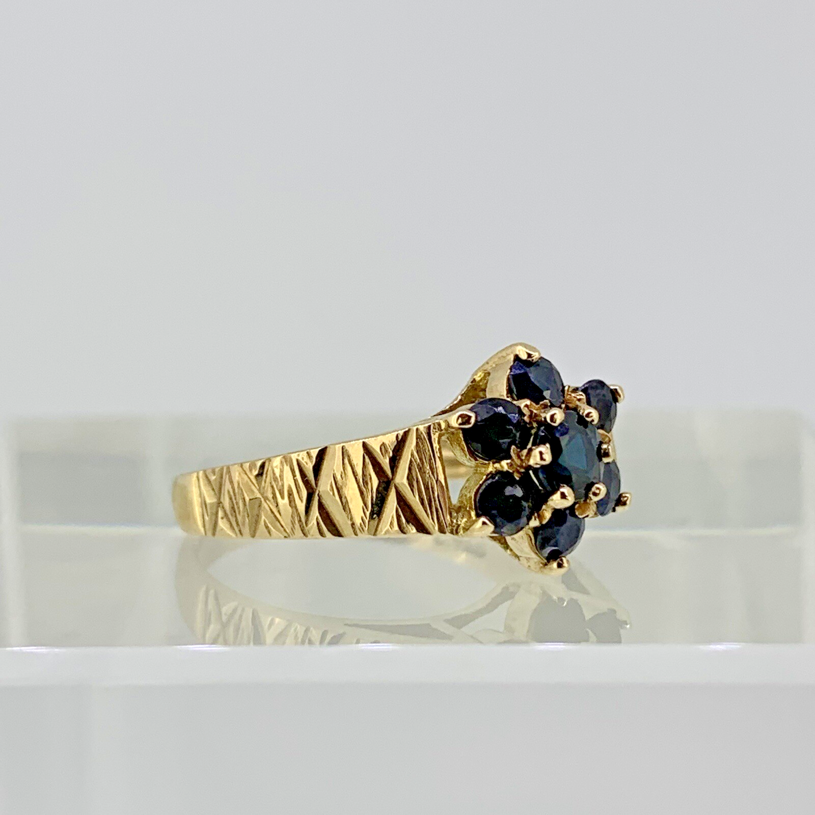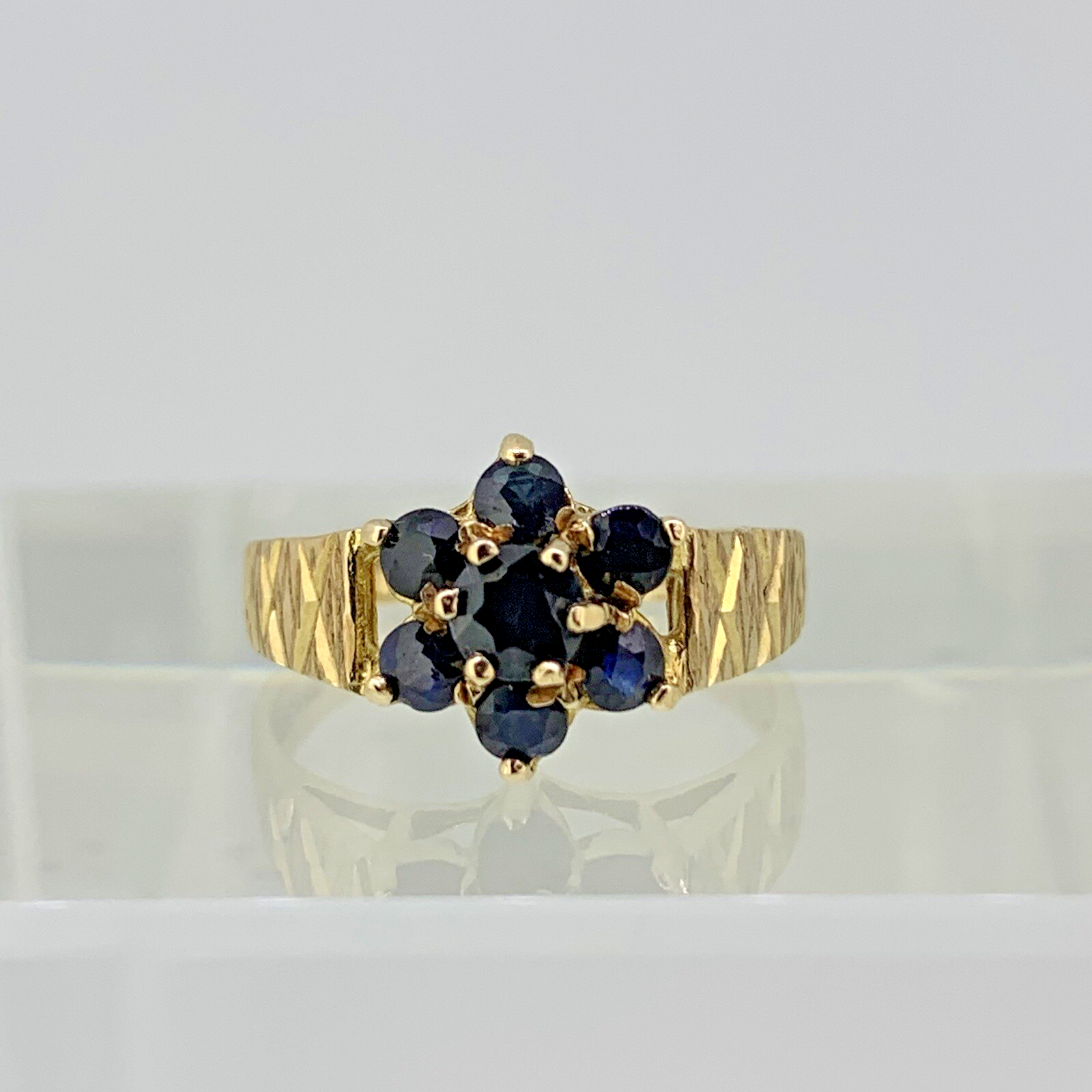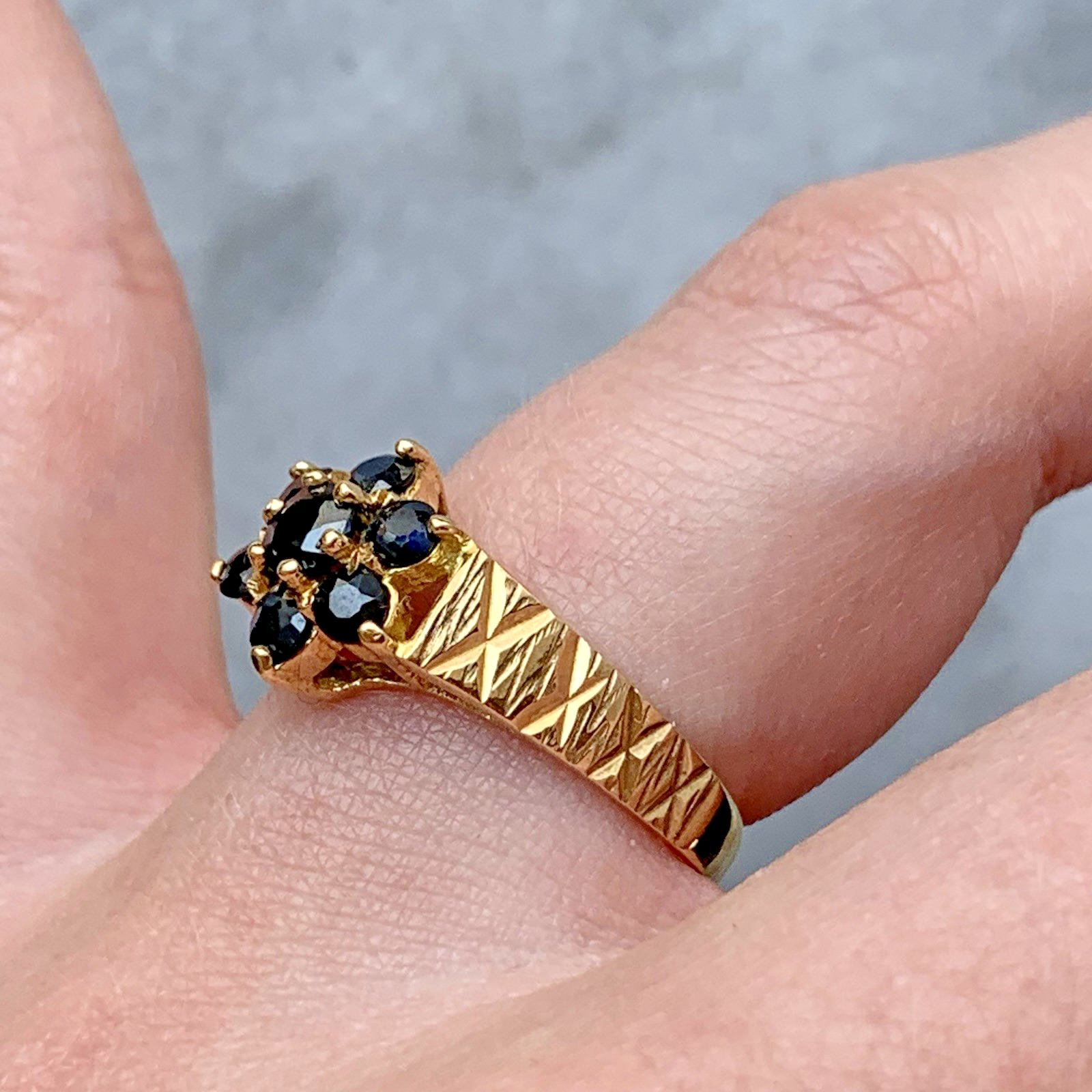 9ct Gold Ring Sapphire Daisy Flower Cluster Etched Shoulder Yellow Gold - Size L