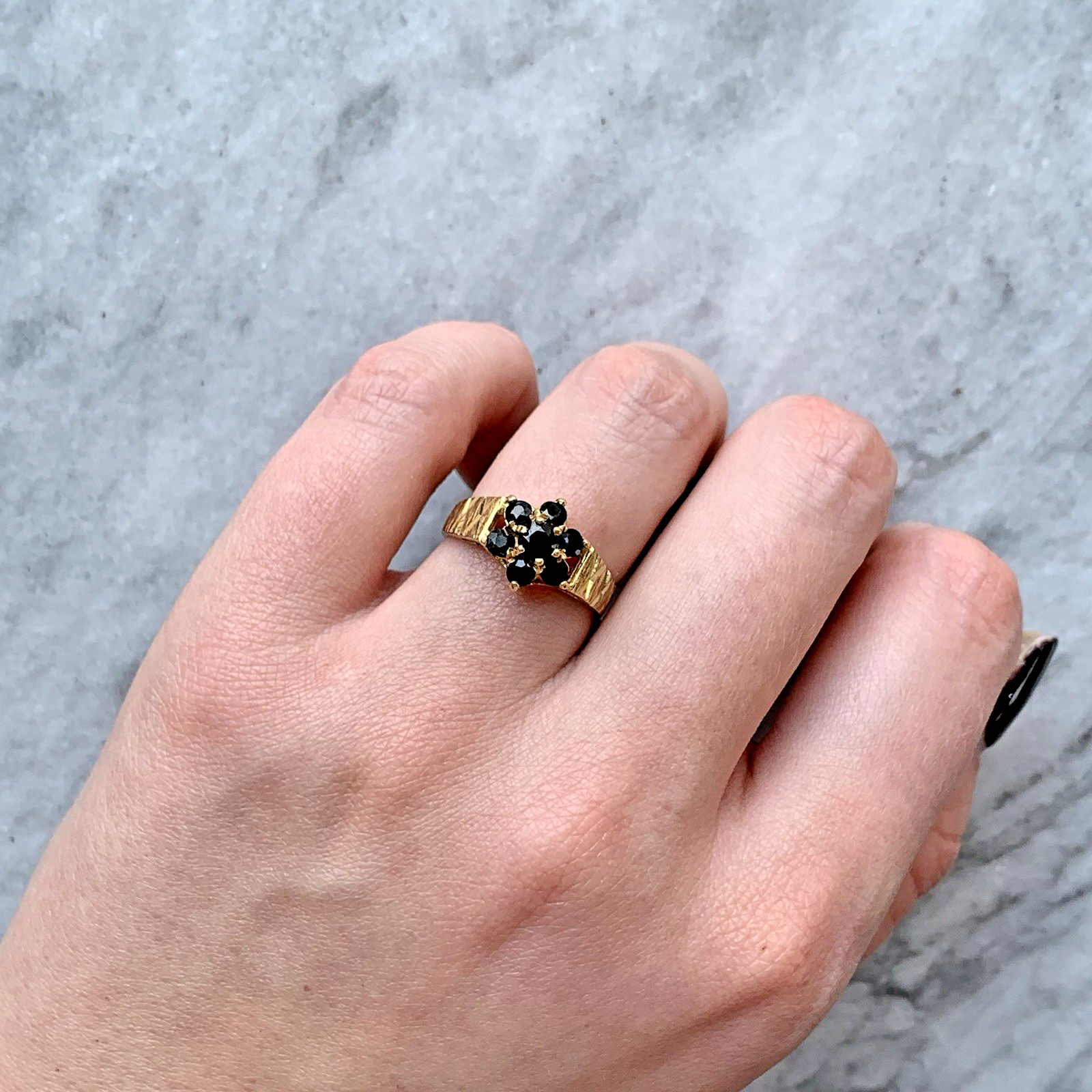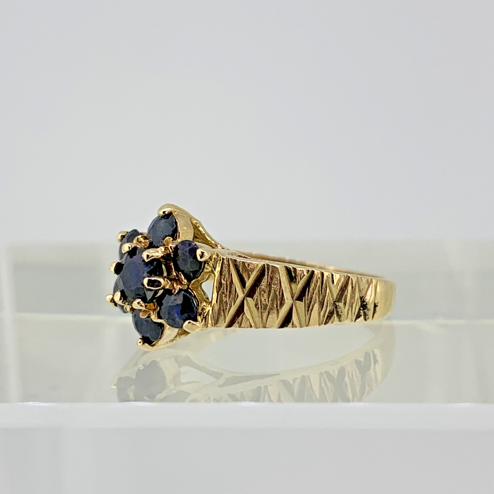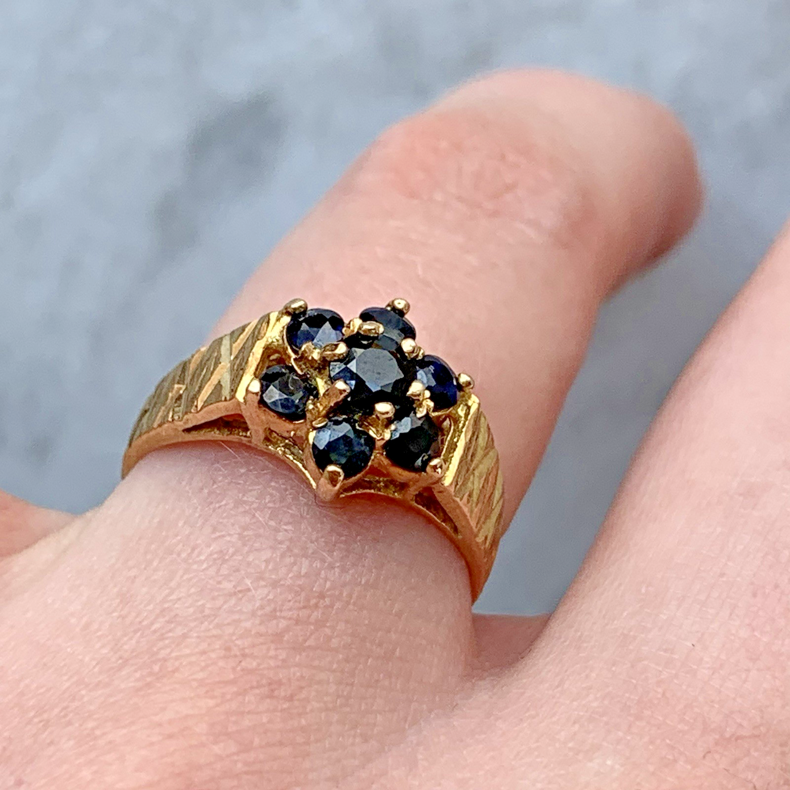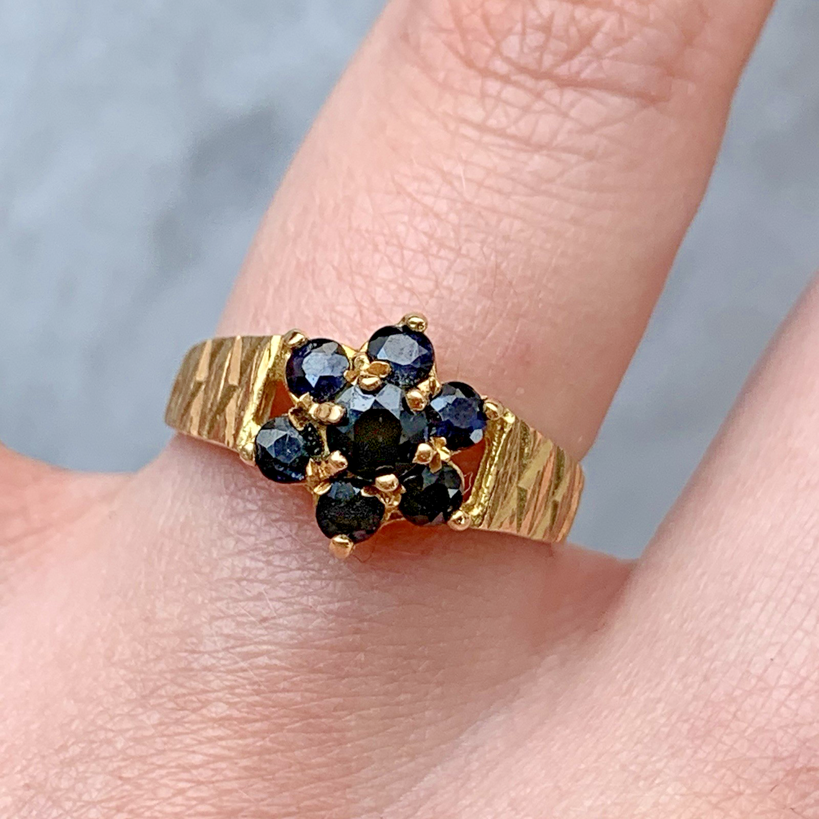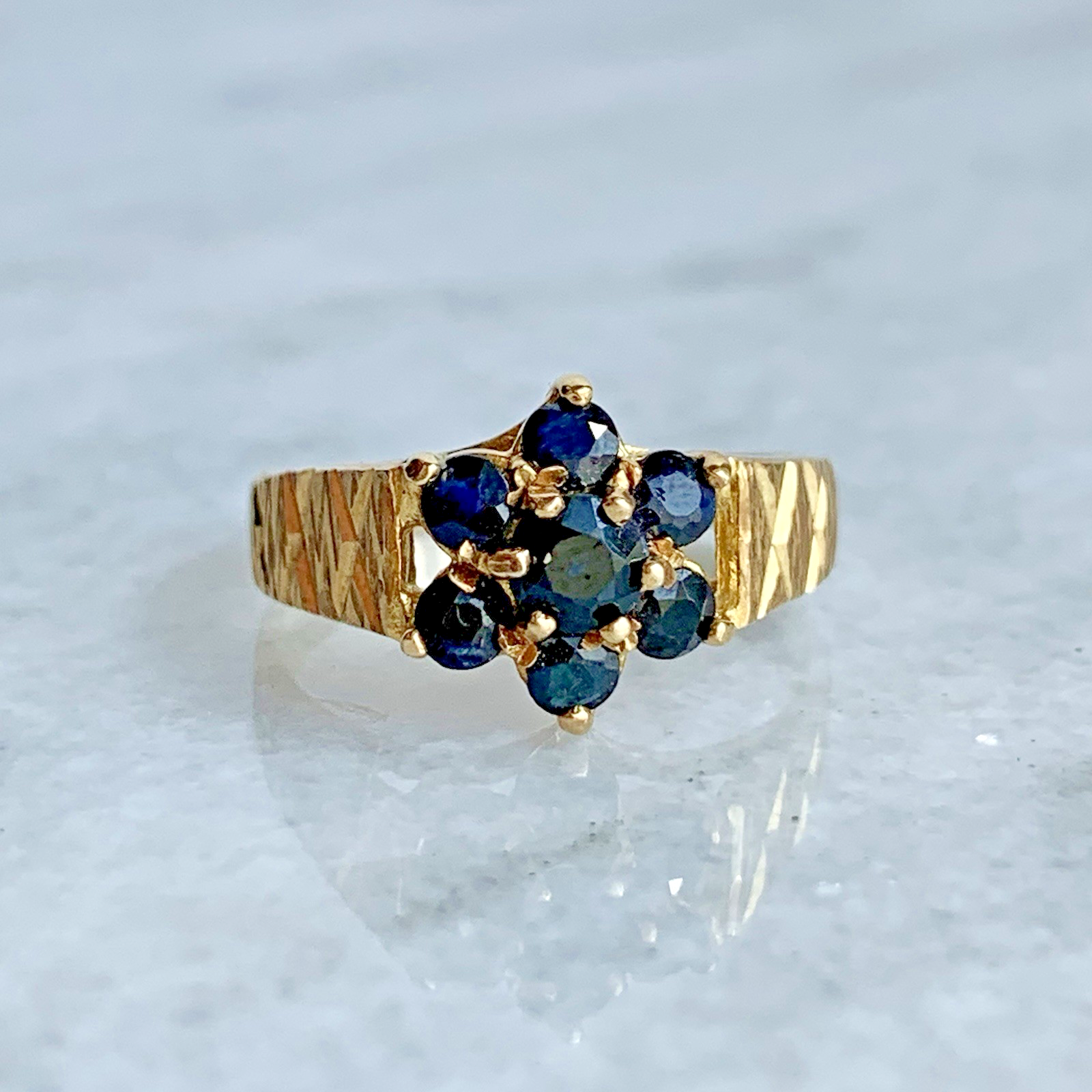 A gorgeous ring featuring a daisy-flower cluster of natural sapphires with textured etched shoulders.