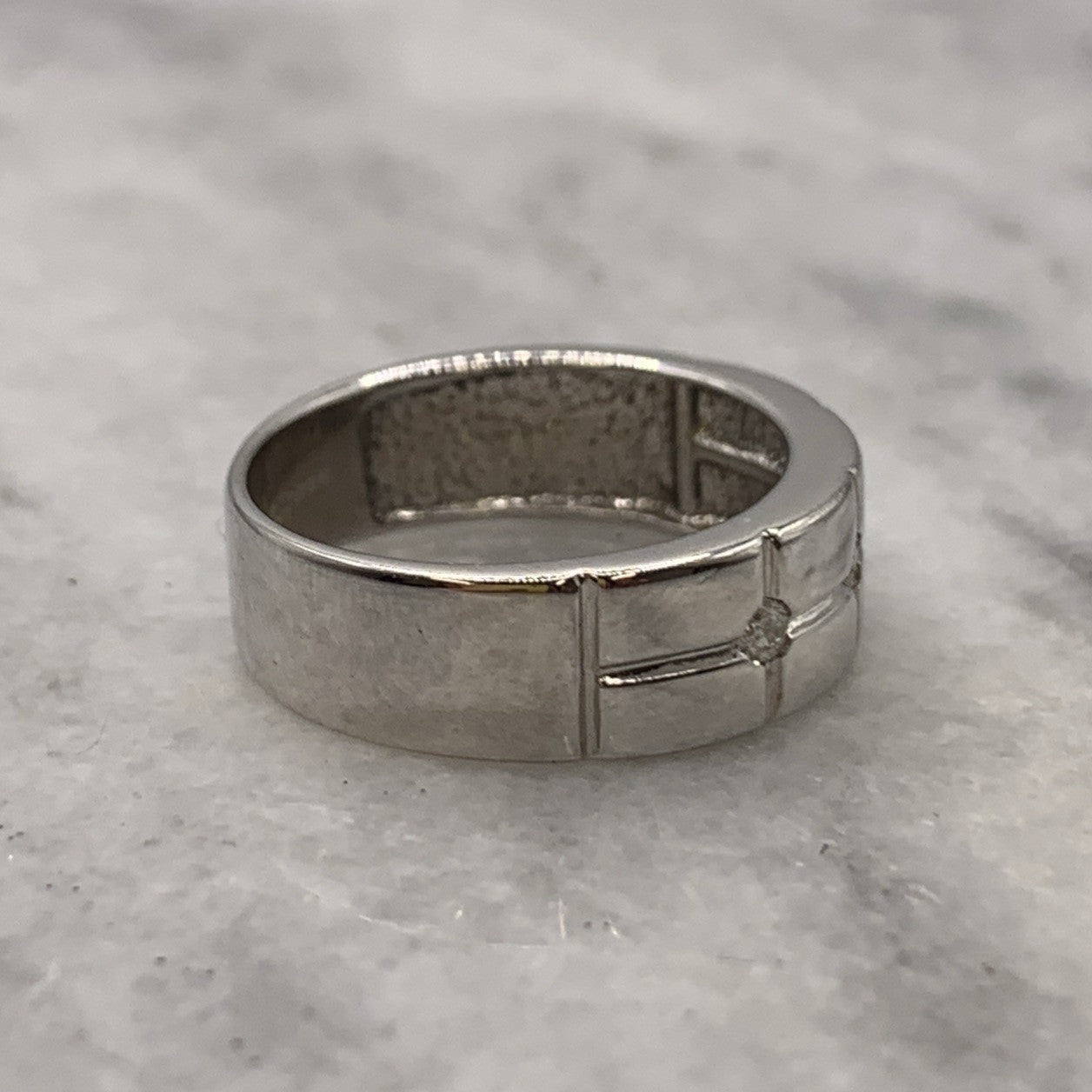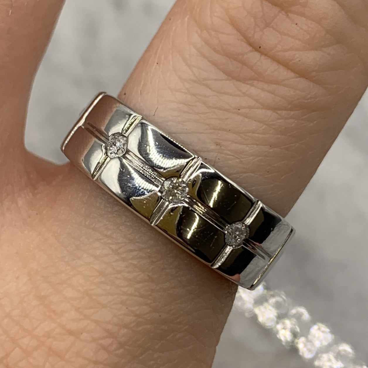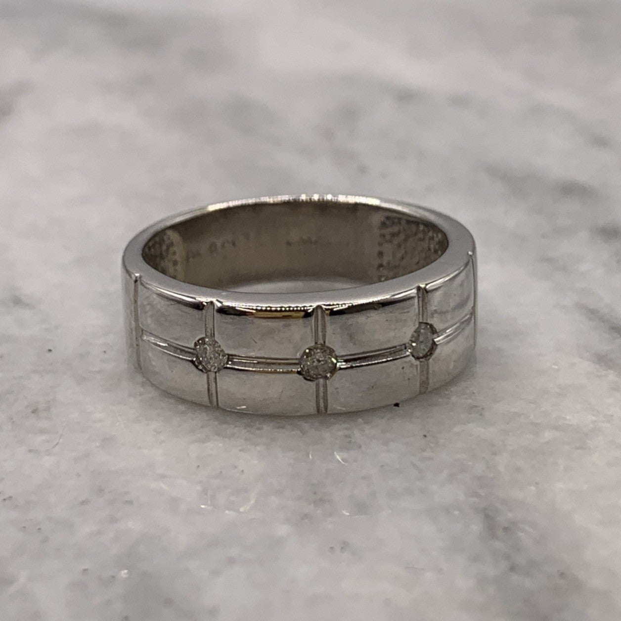 A charming white gold band ring featuring a trilogy of flush set diamonds.