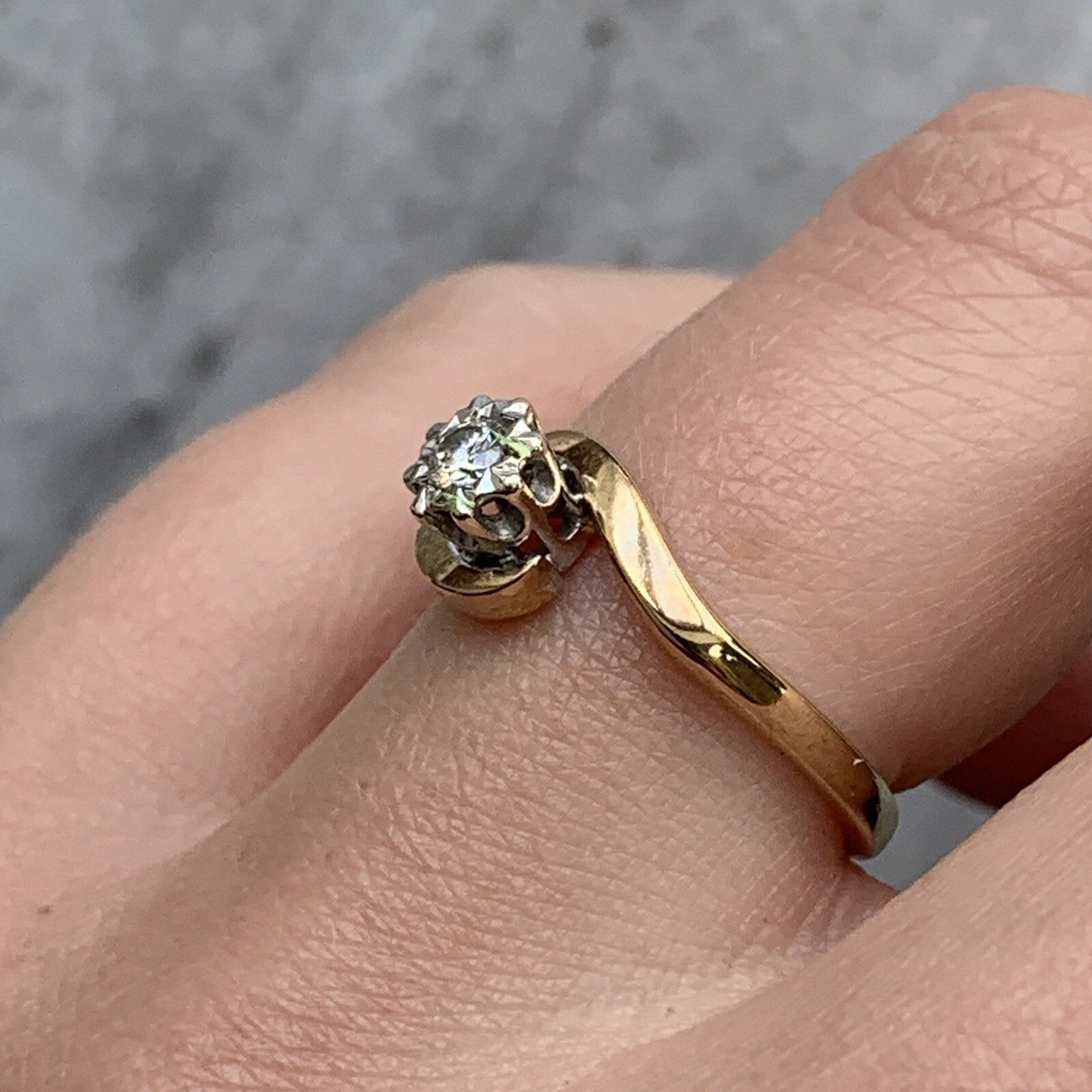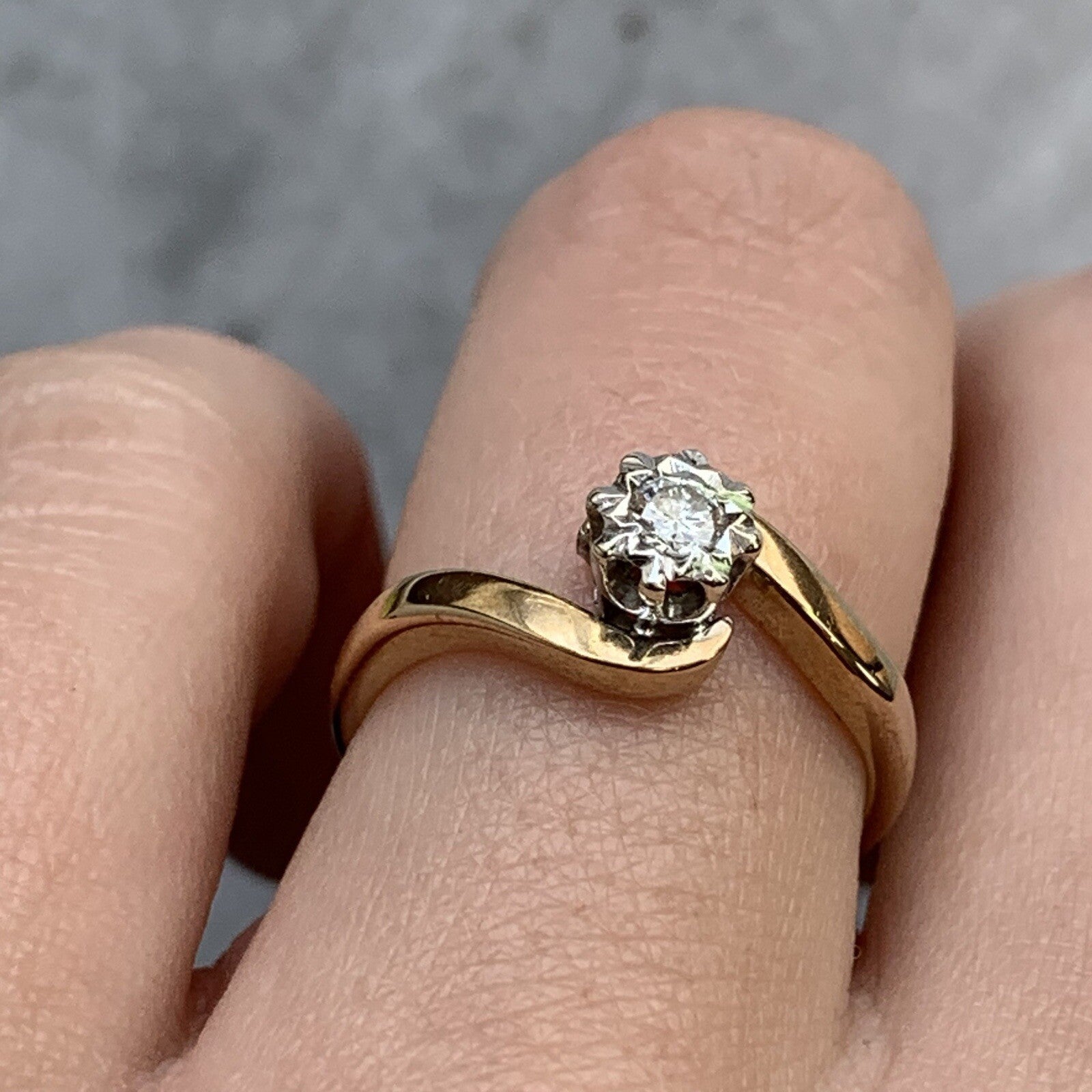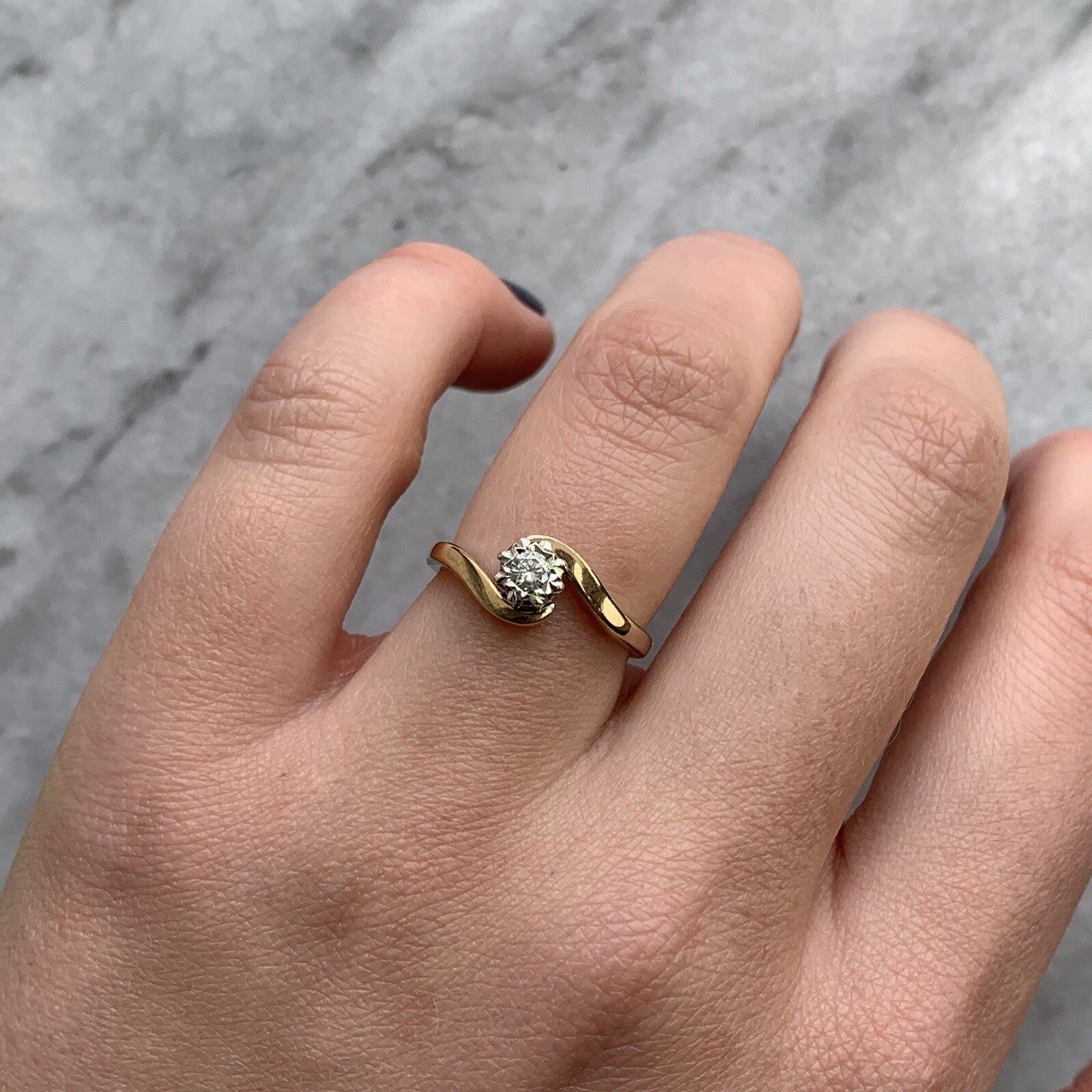 A beautiful bypass twist ring showcasing a diamond in a illusion setting. Diamond amounting to .10ct.