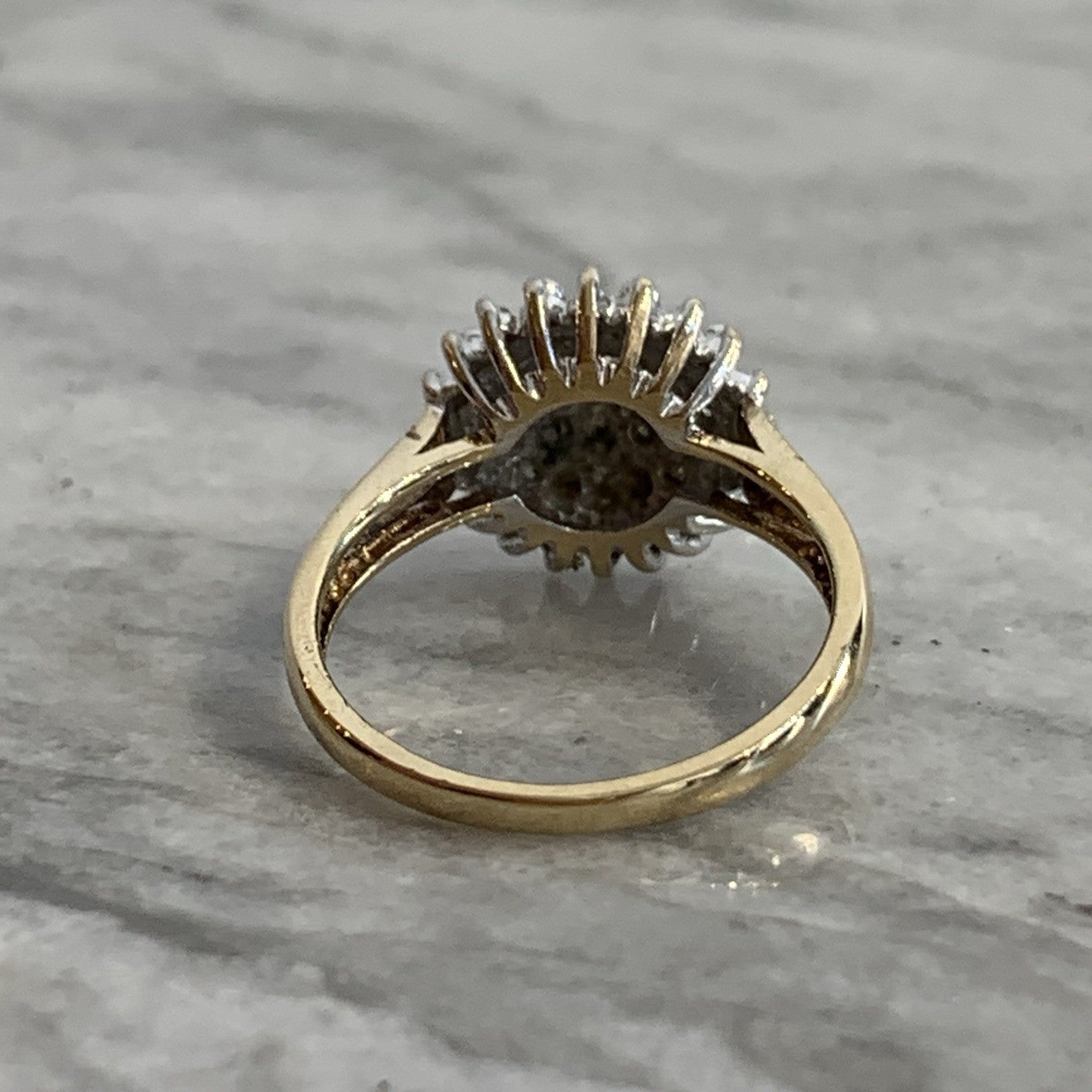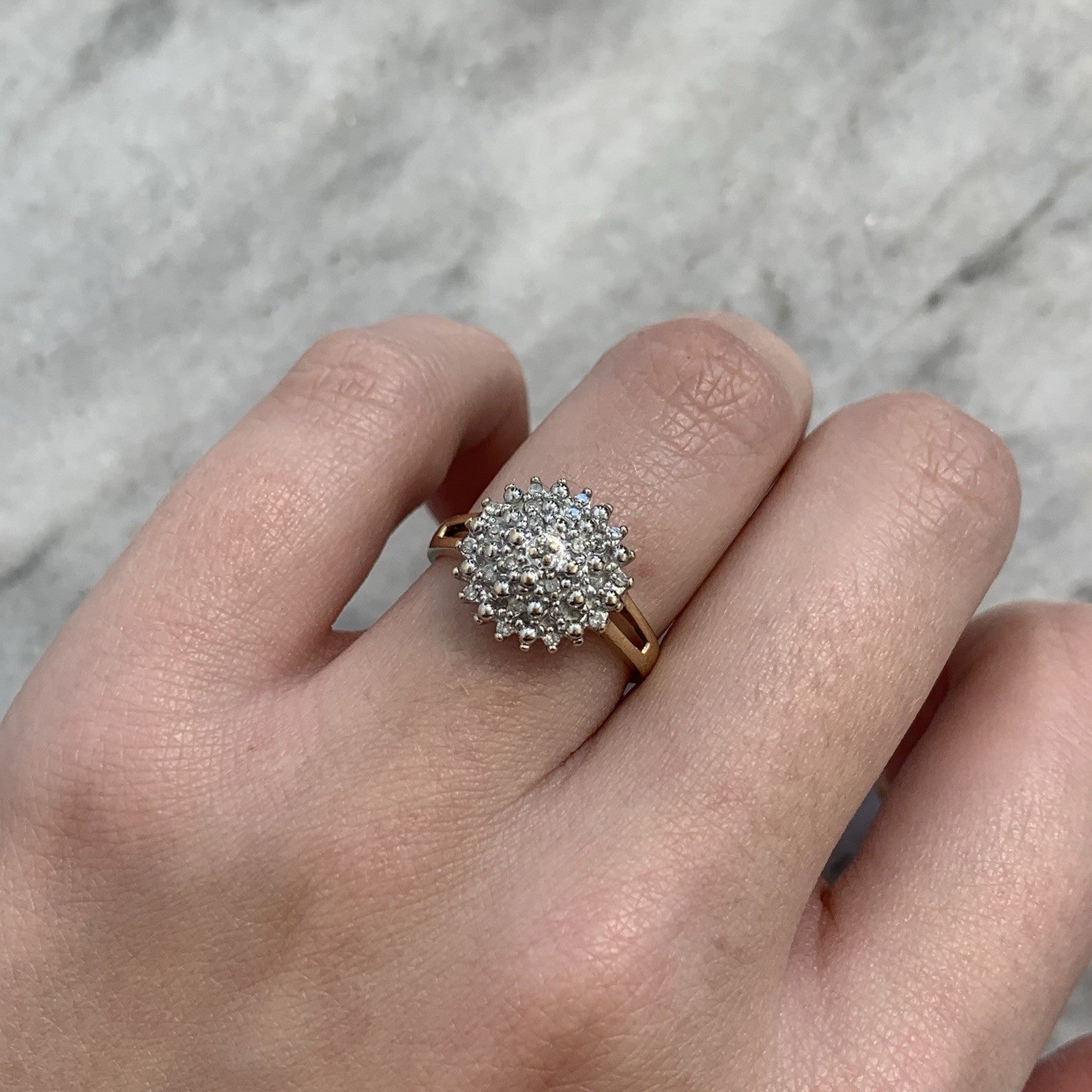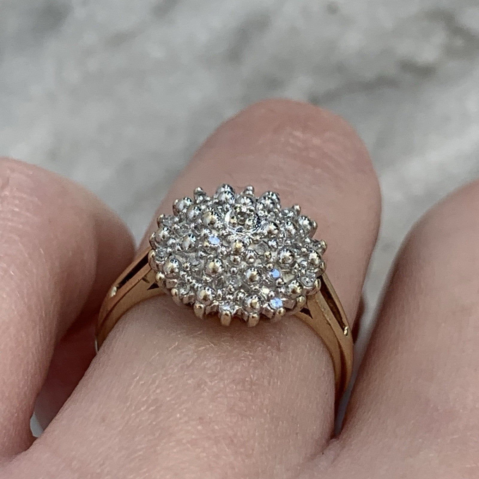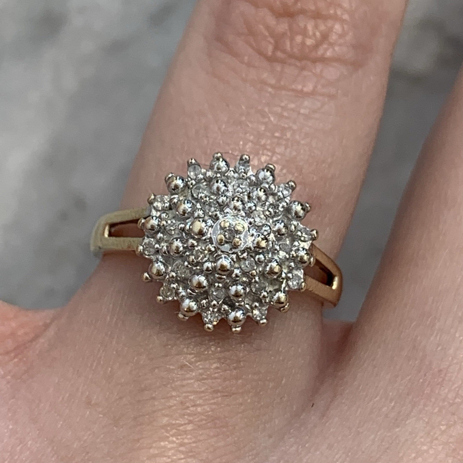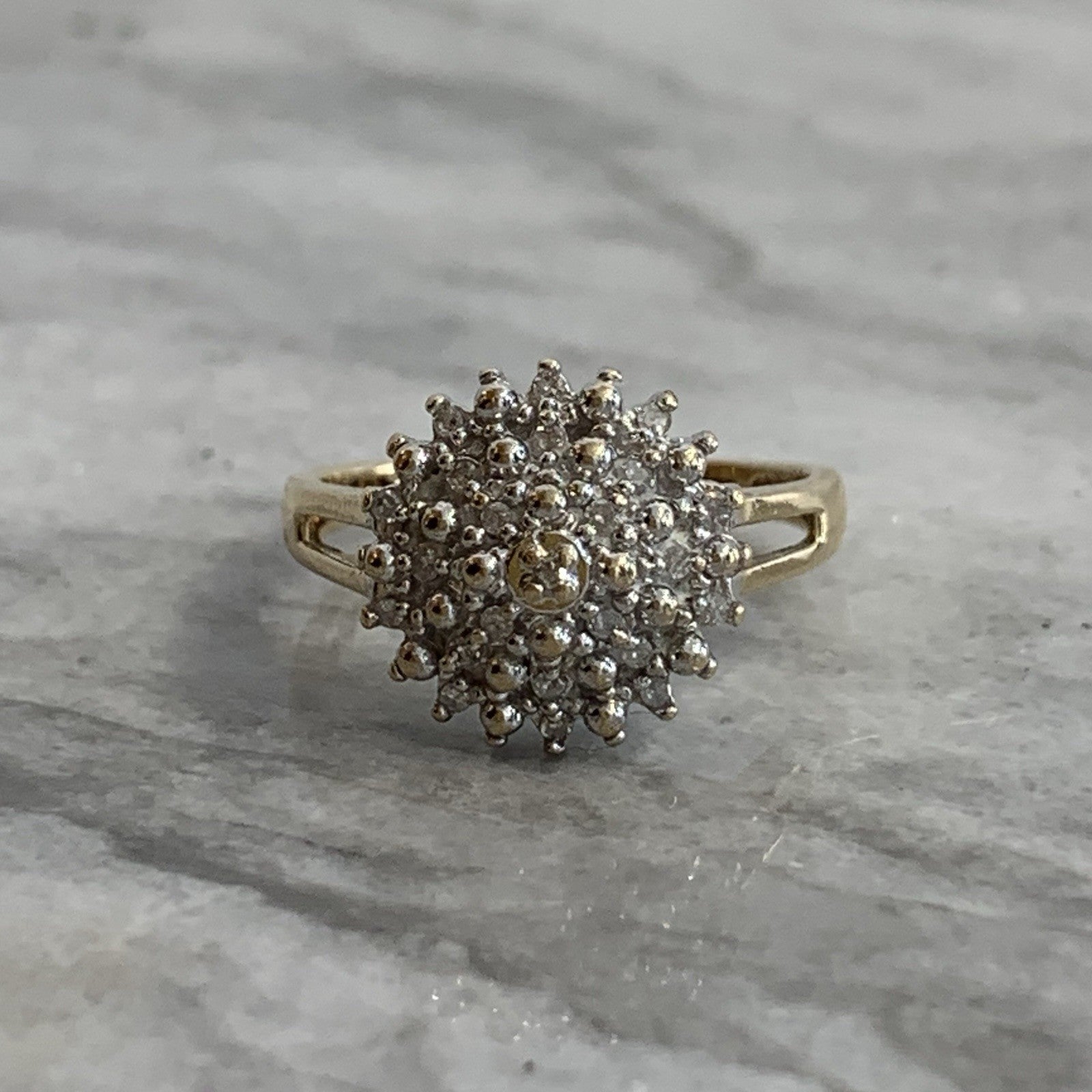 A stunning diamond cluster set ring in yellow gold. Diamond carat weight .10ct combined.