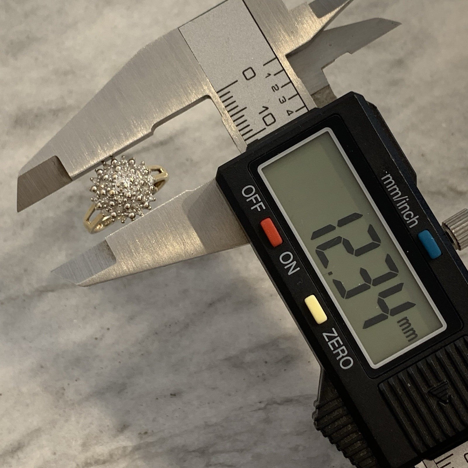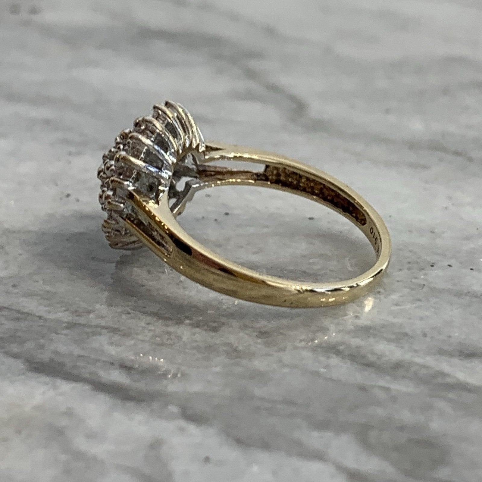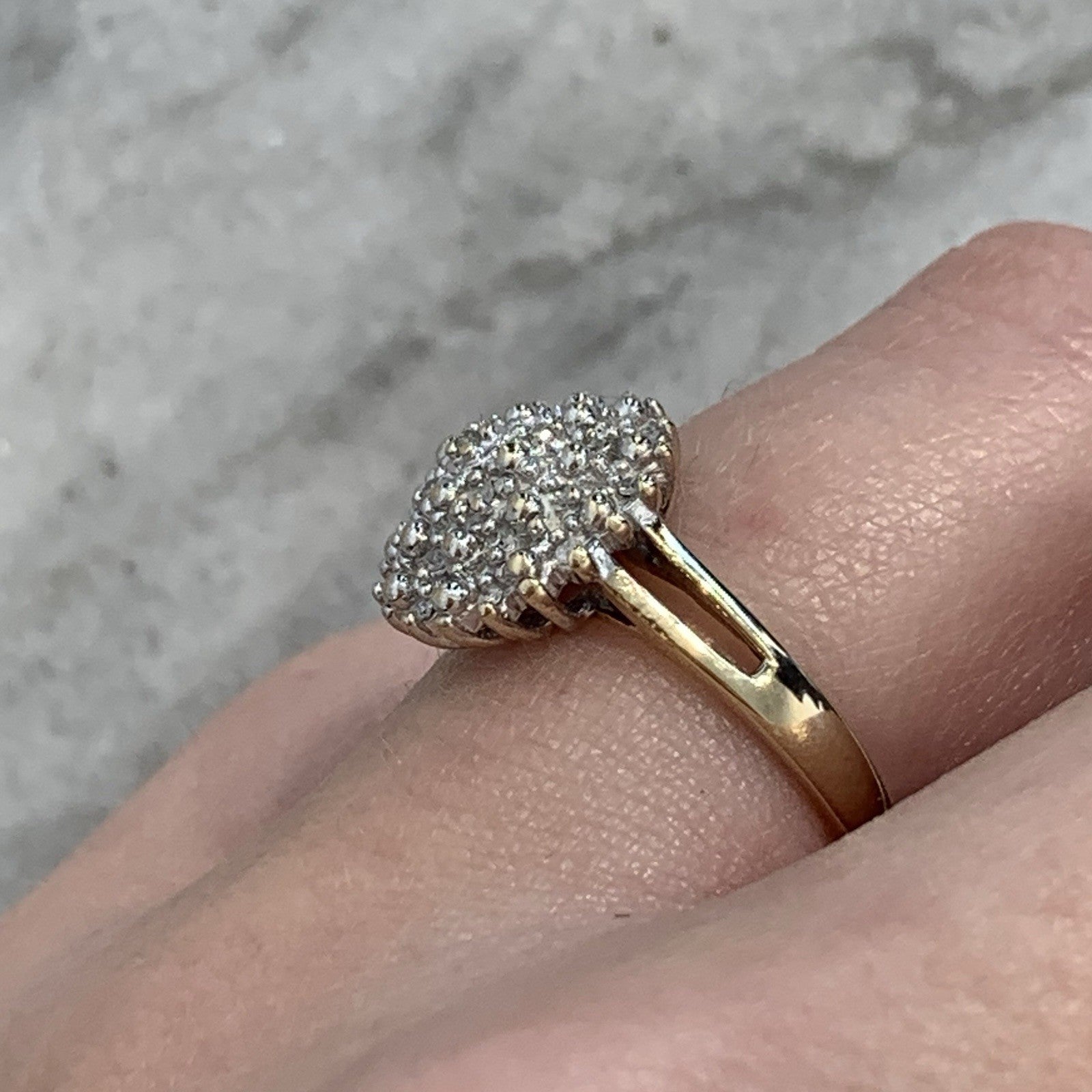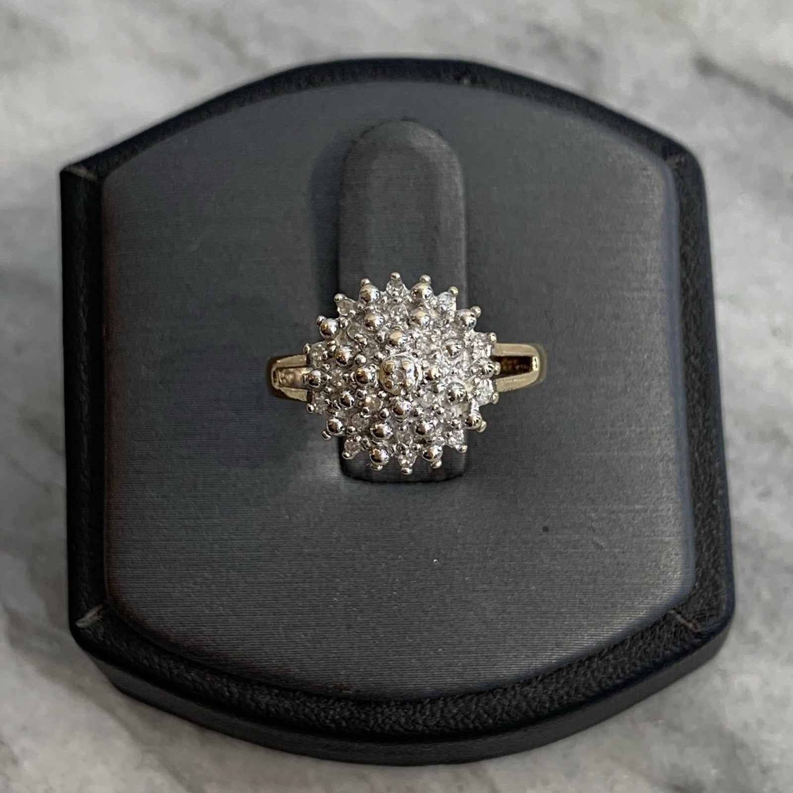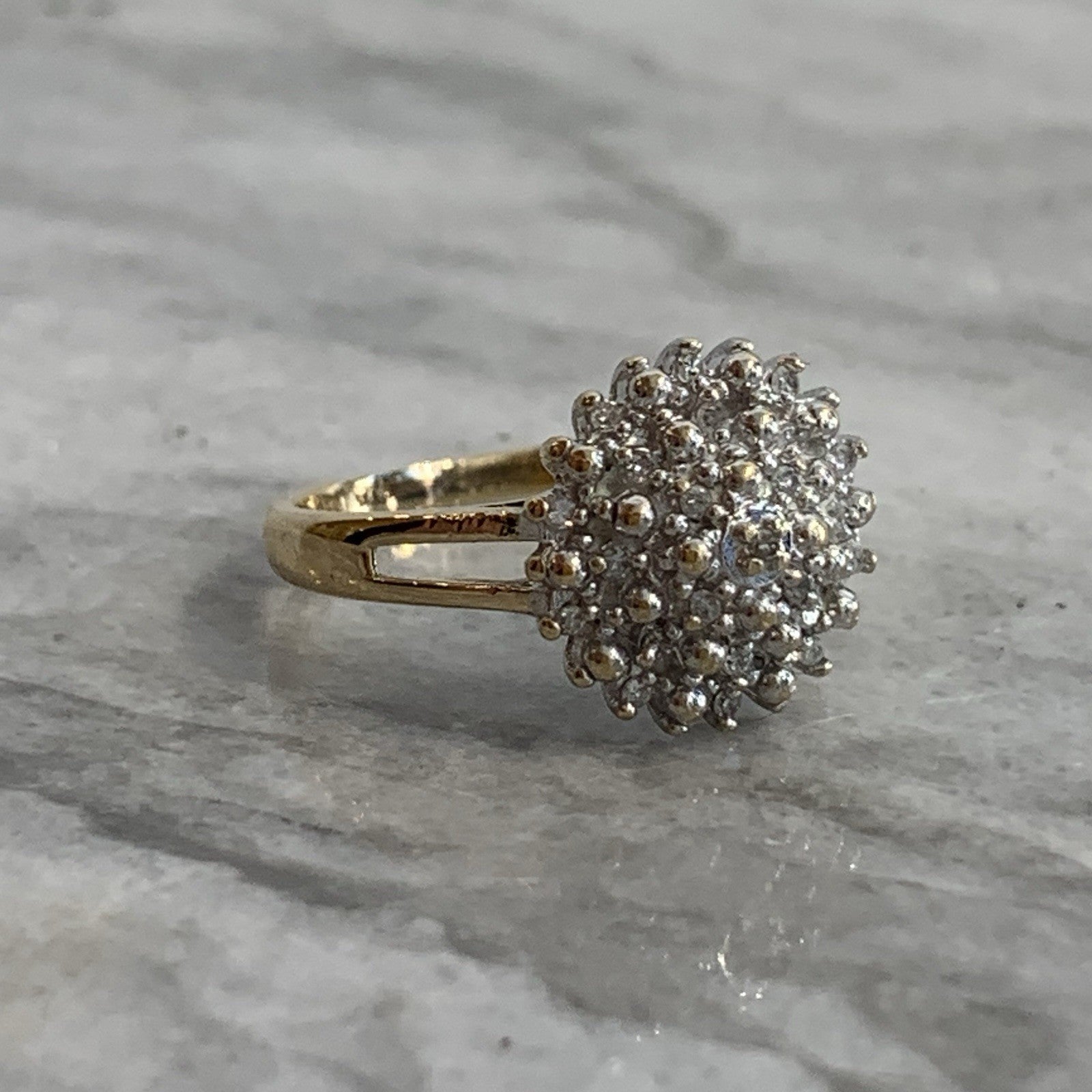 A stunning diamond cluster set ring in yellow gold. Diamond carat weight .10ct combined.
