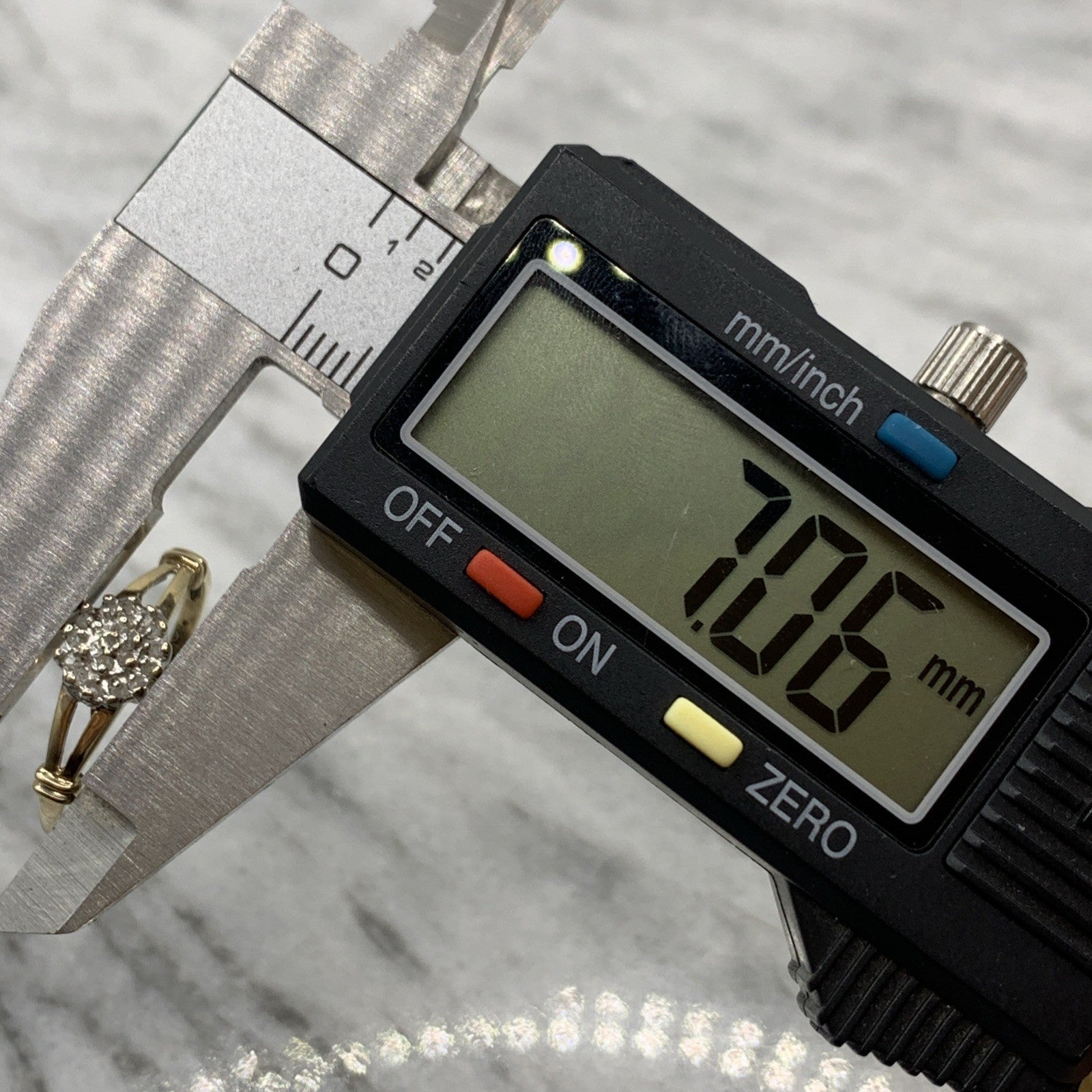 A beautiful gold ring showcasing a round cluster of petite diamonds upon split detail shoulders.