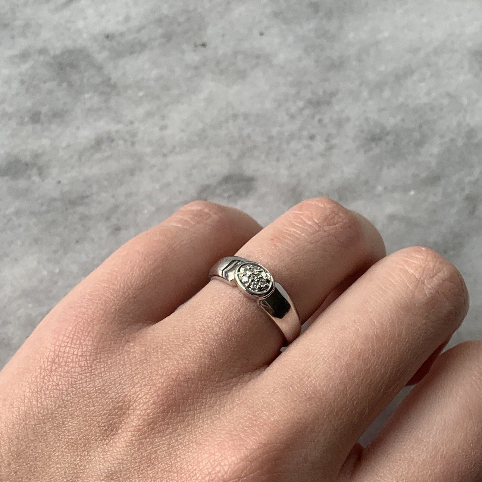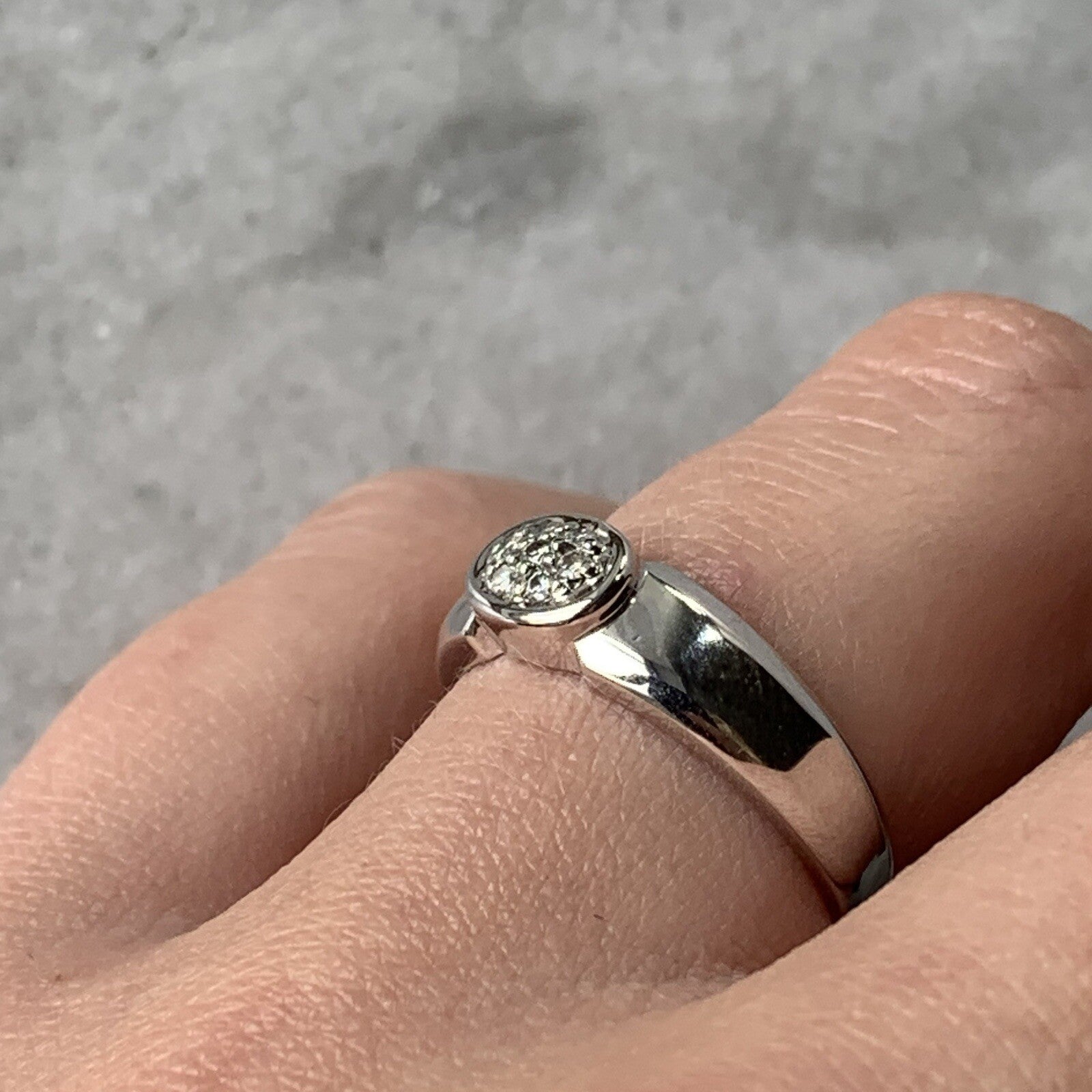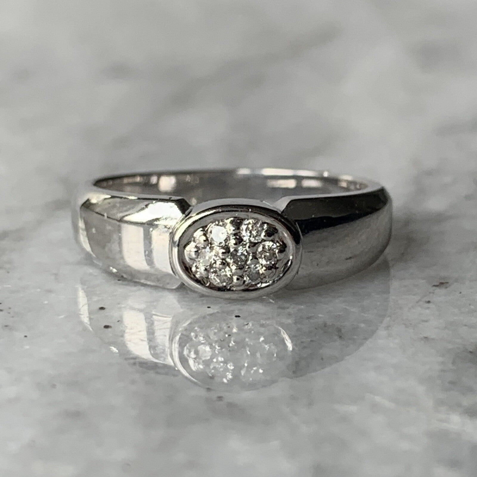 A charming white gold band ring showcasing a pave set cluster of petite diamonds.