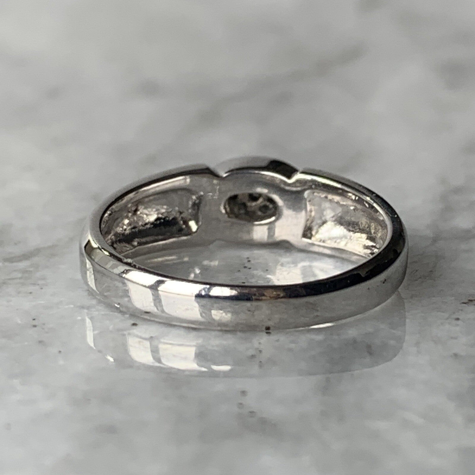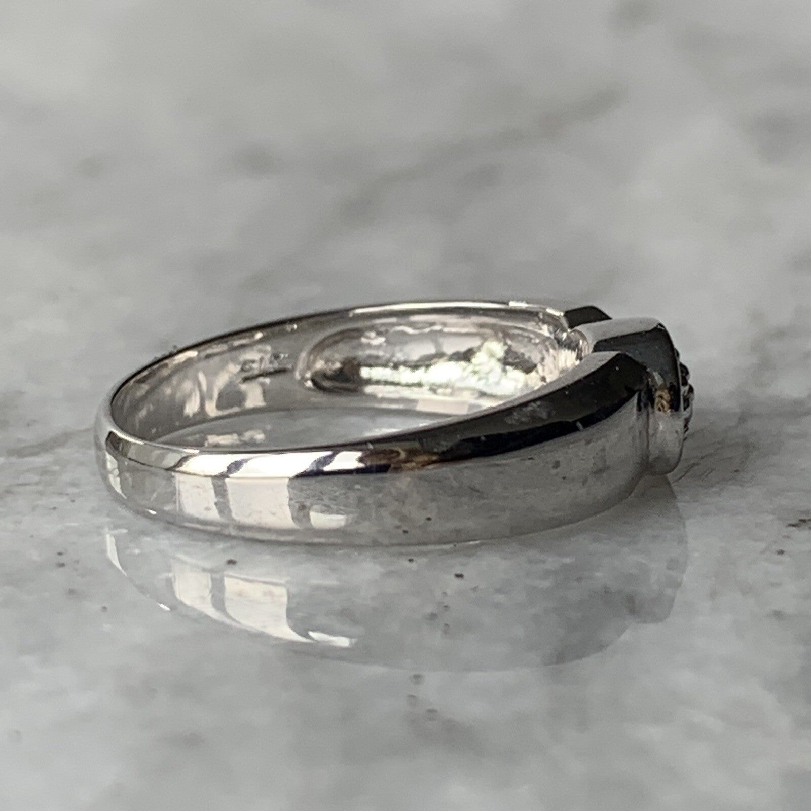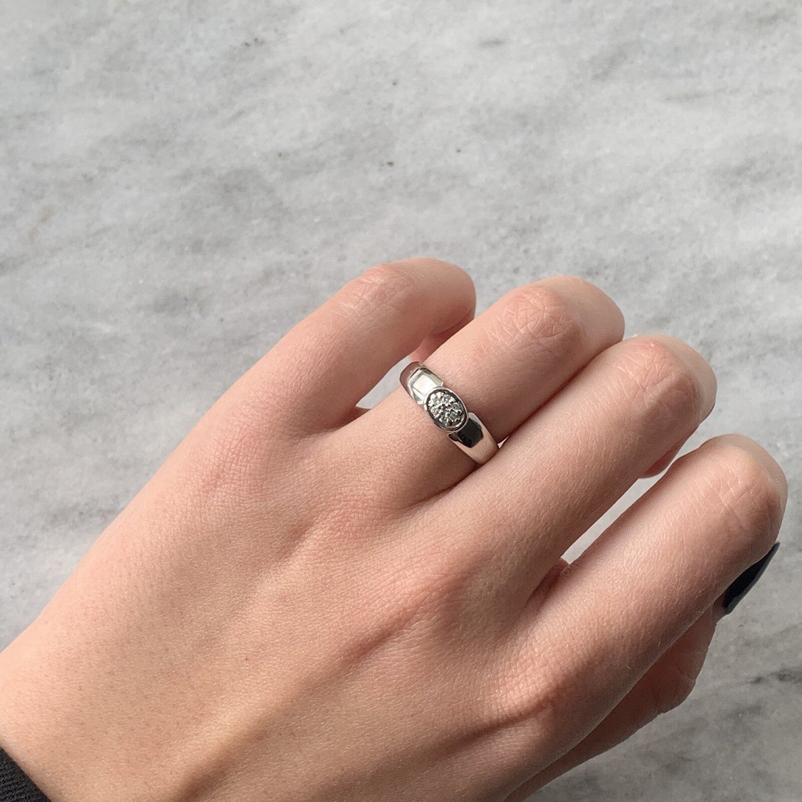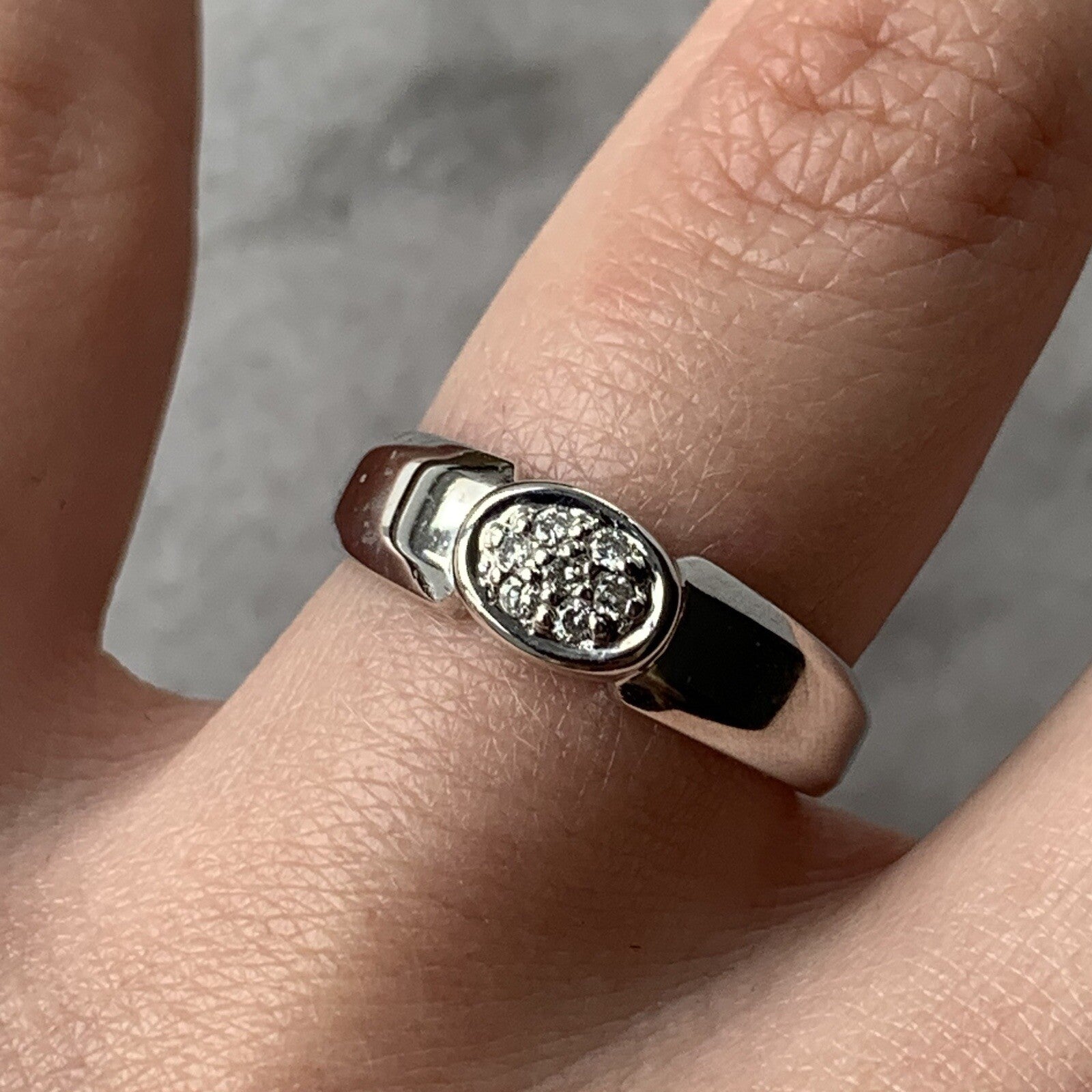 A charming white gold band ring showcasing a pave set cluster of petite diamonds.