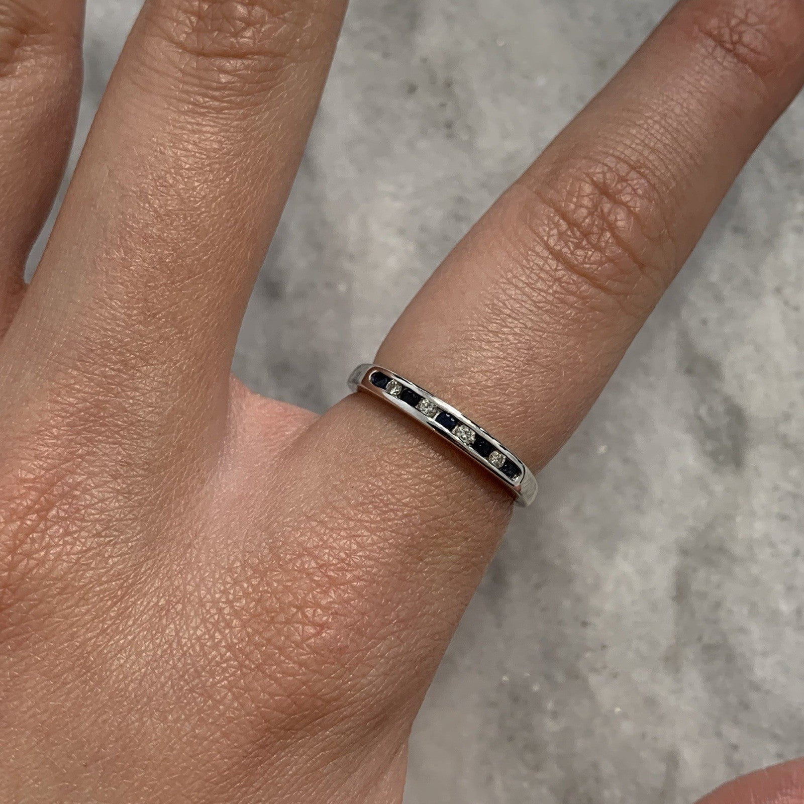 An elegant white gold channel set band ring featuring diamonds and sapphires.