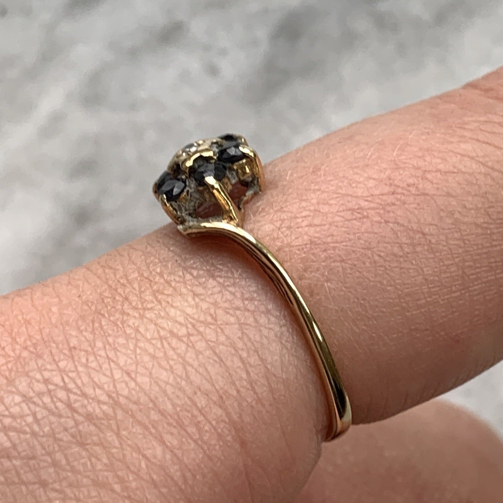 A beautiful ring featuring a central diamond surrounded by sapphires to create a daisy, upon bypass shoulders.