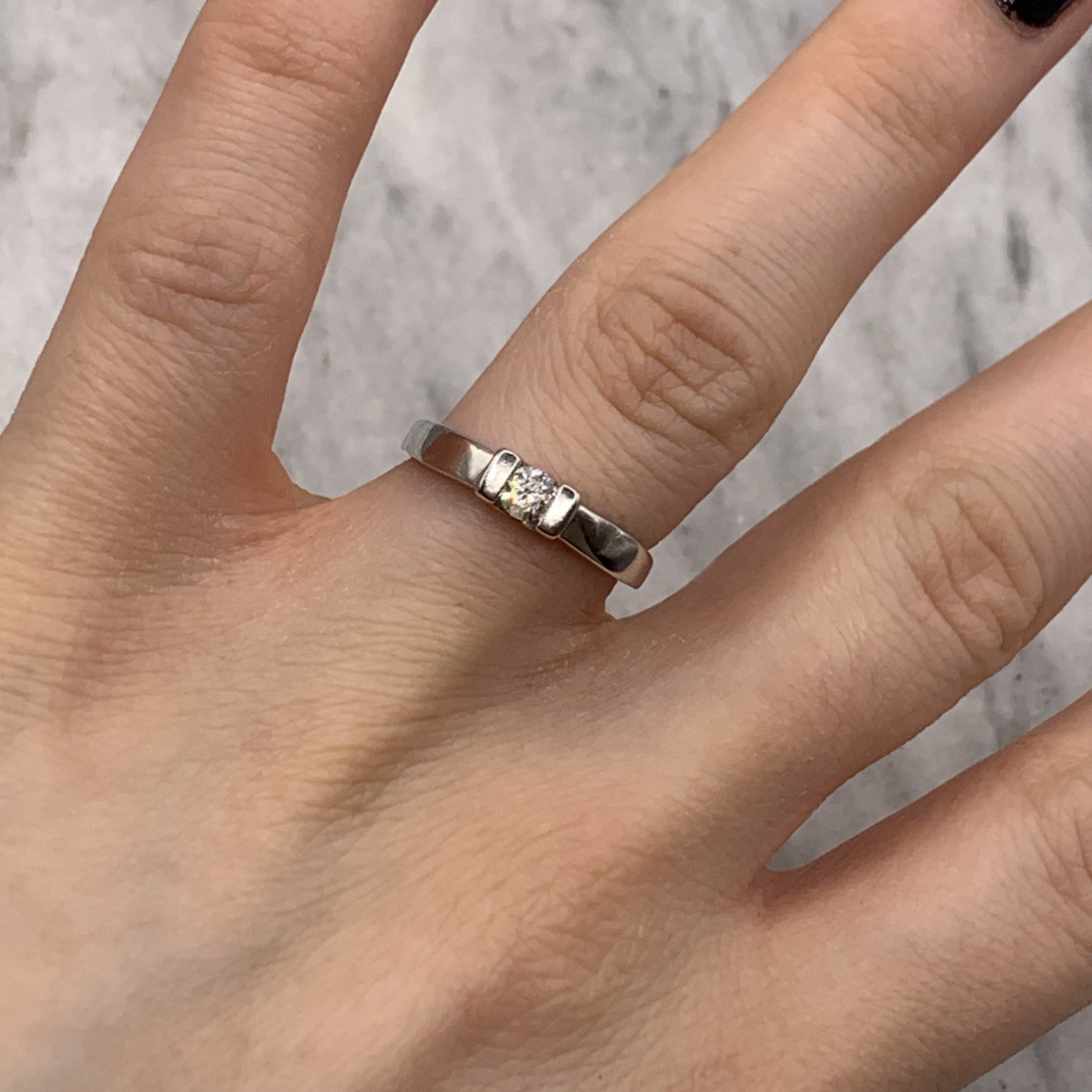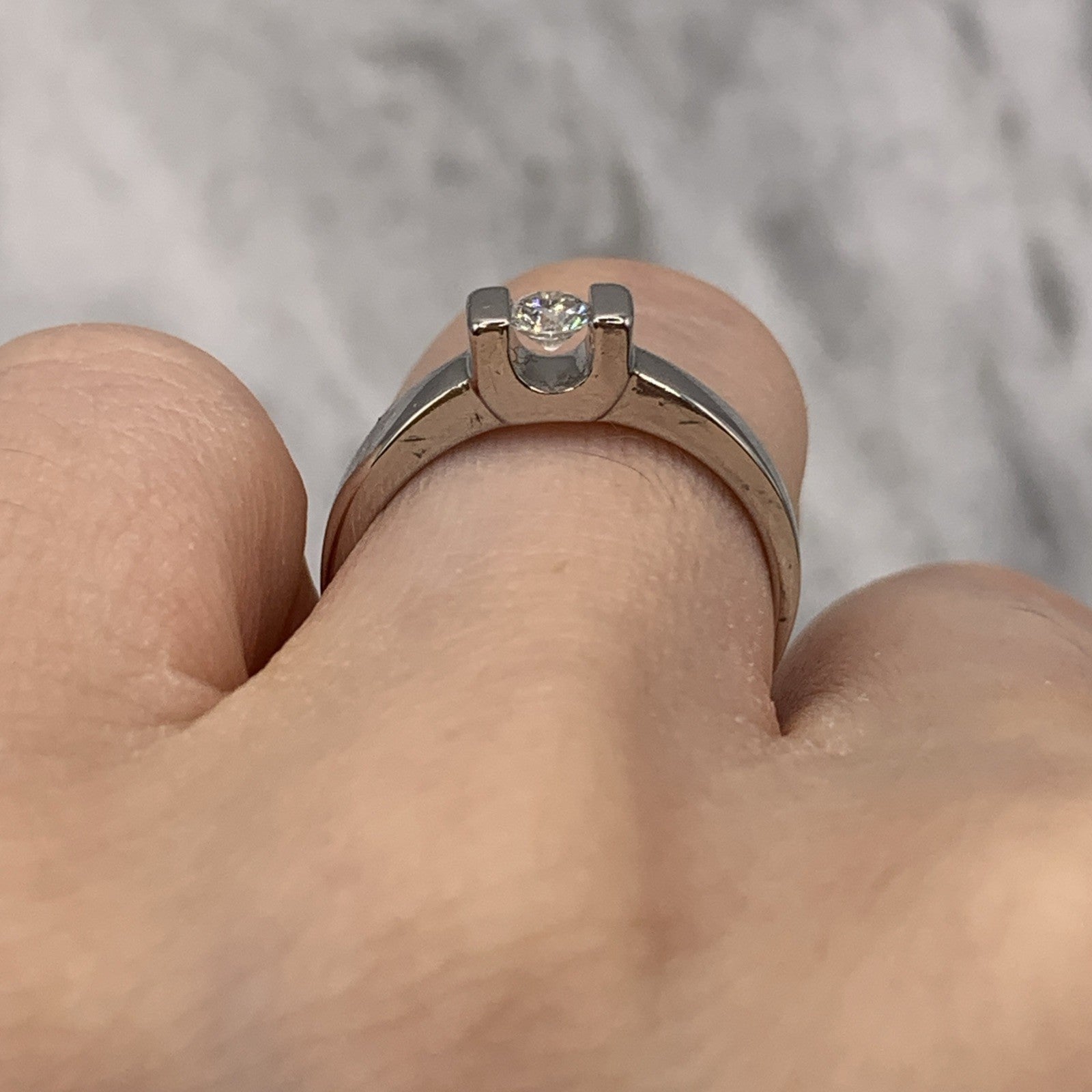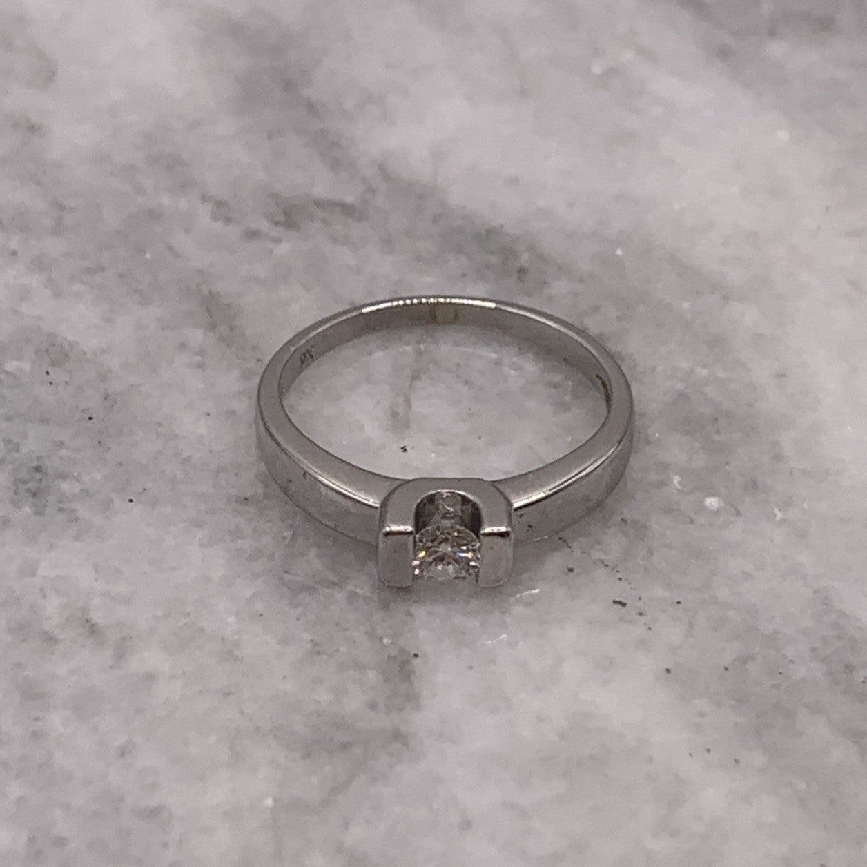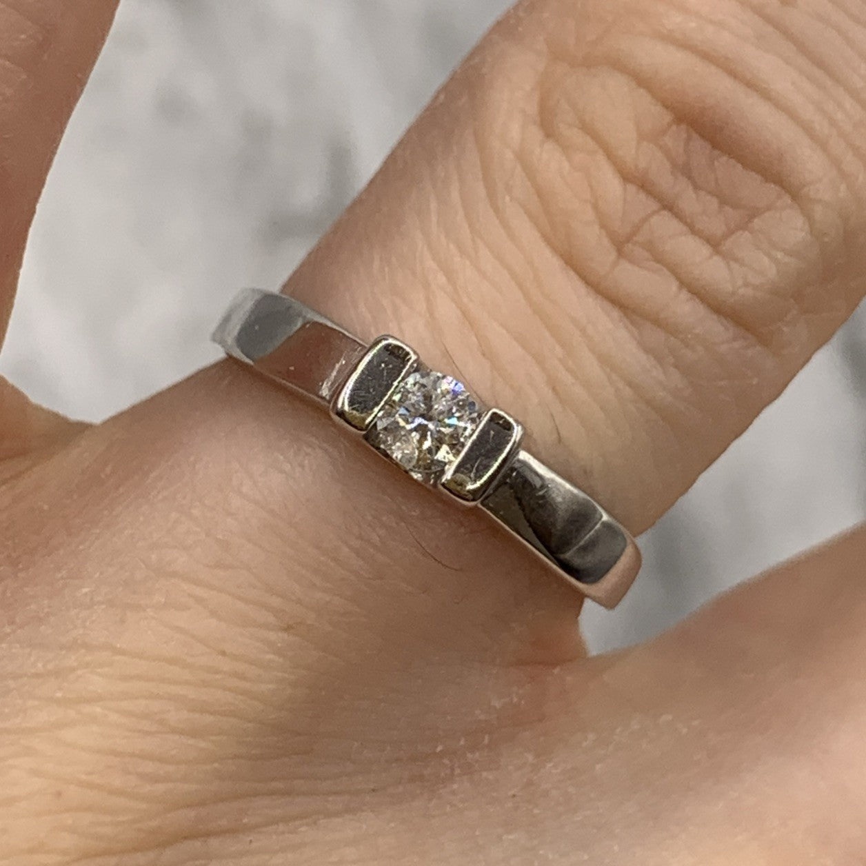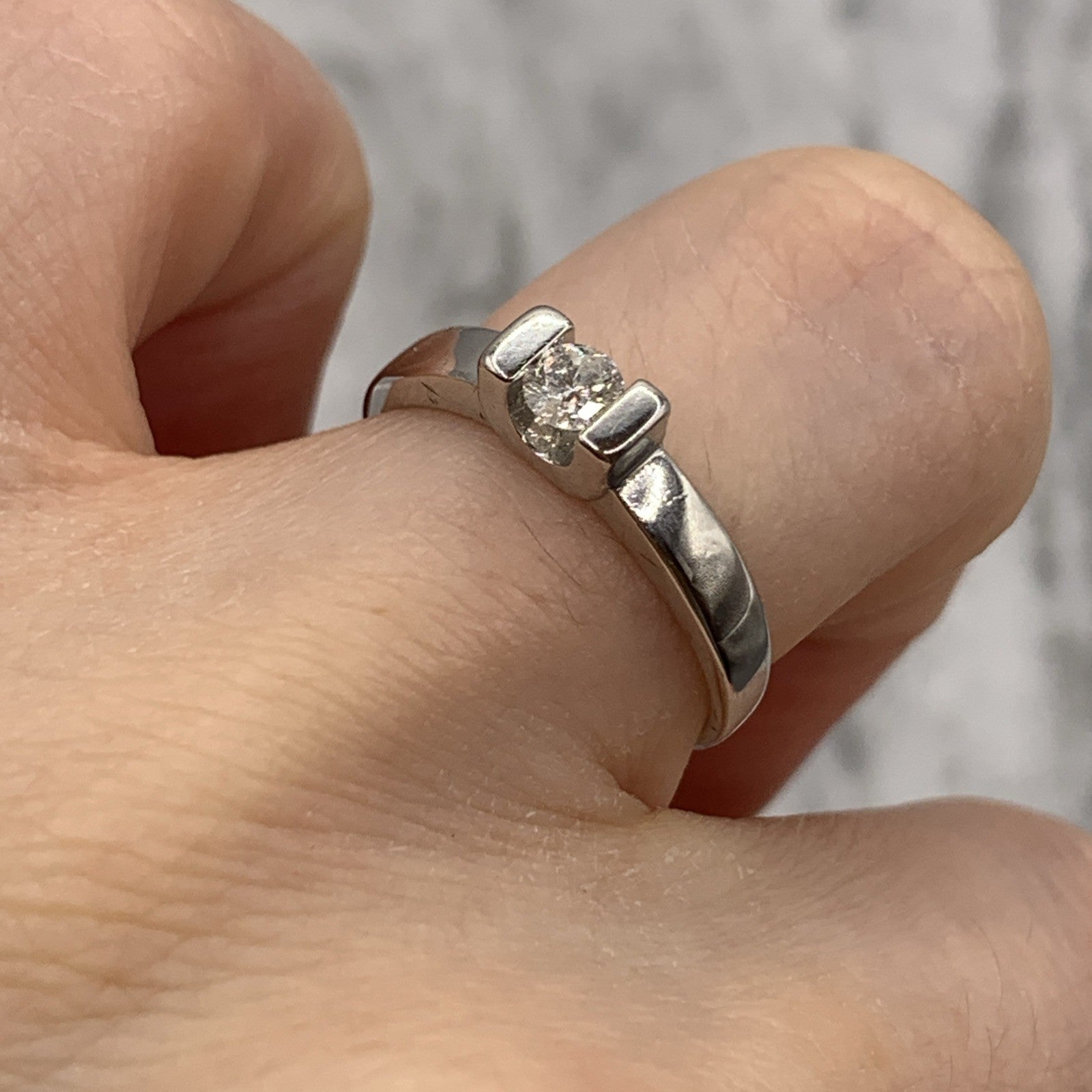 A stunning white gold ring showcasing a solitaire diamond in a bar setting.