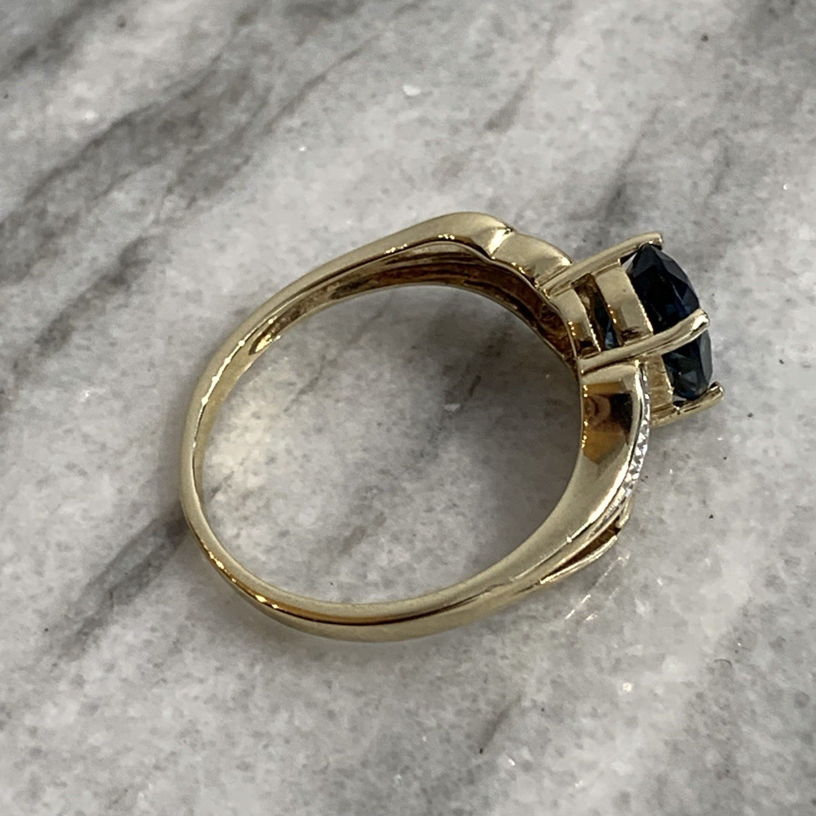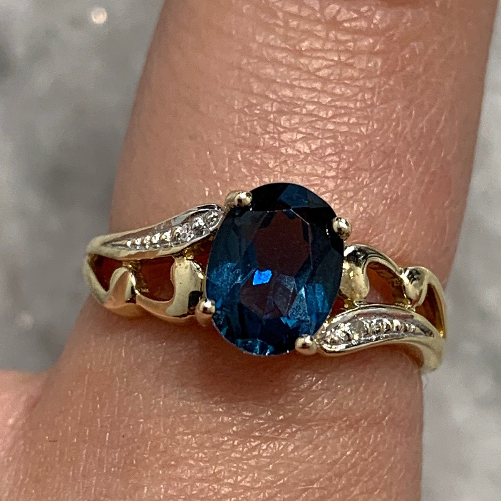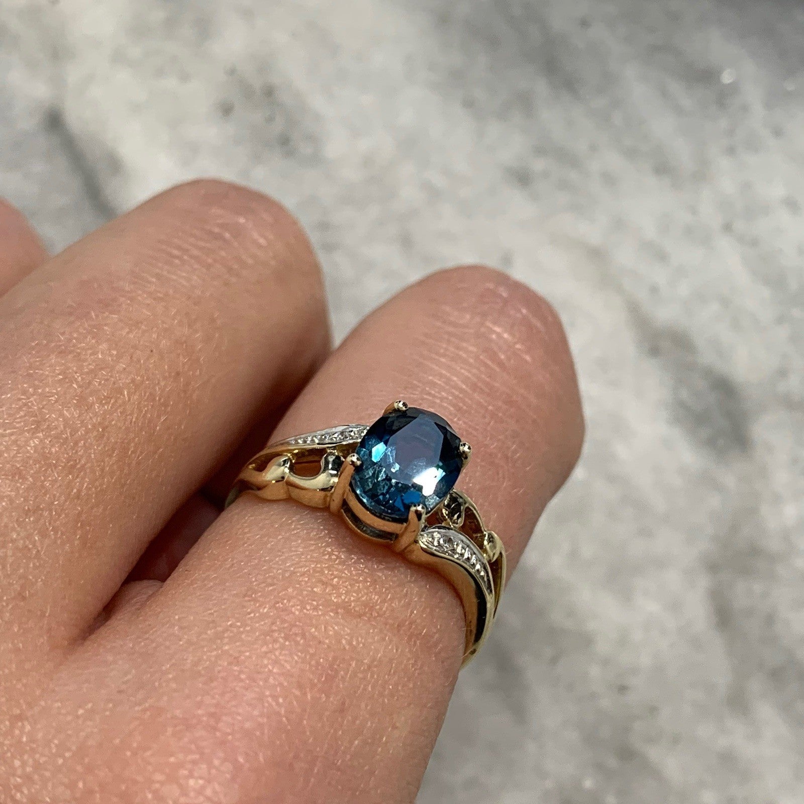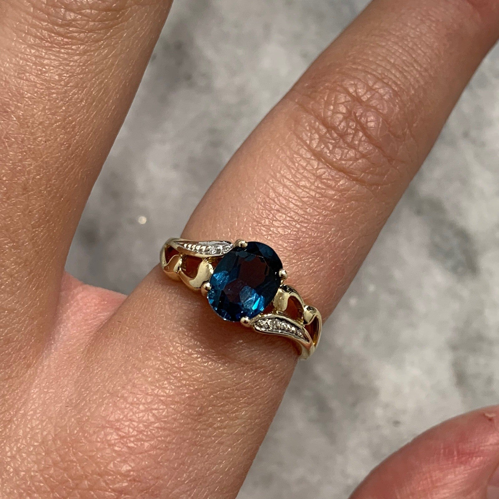 An elegant yellow gold ring showcasing a stunning oval cut London blue topaz, featuring a fancy open shoulder design with a petite diamond to each side.