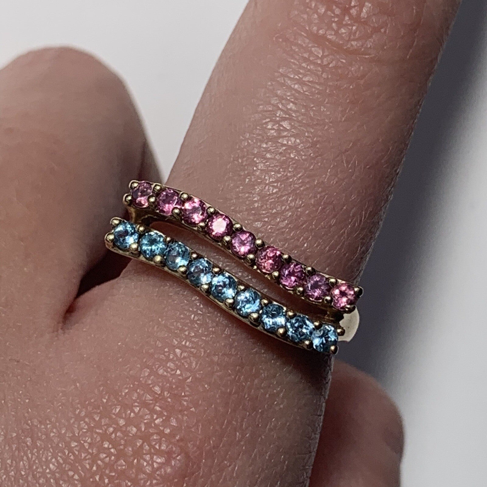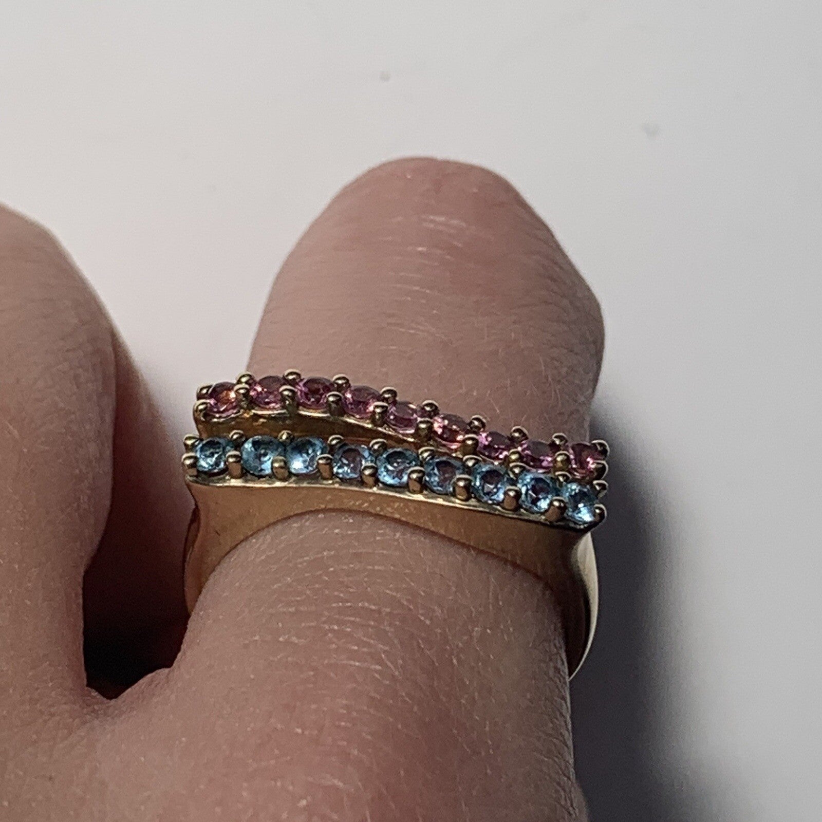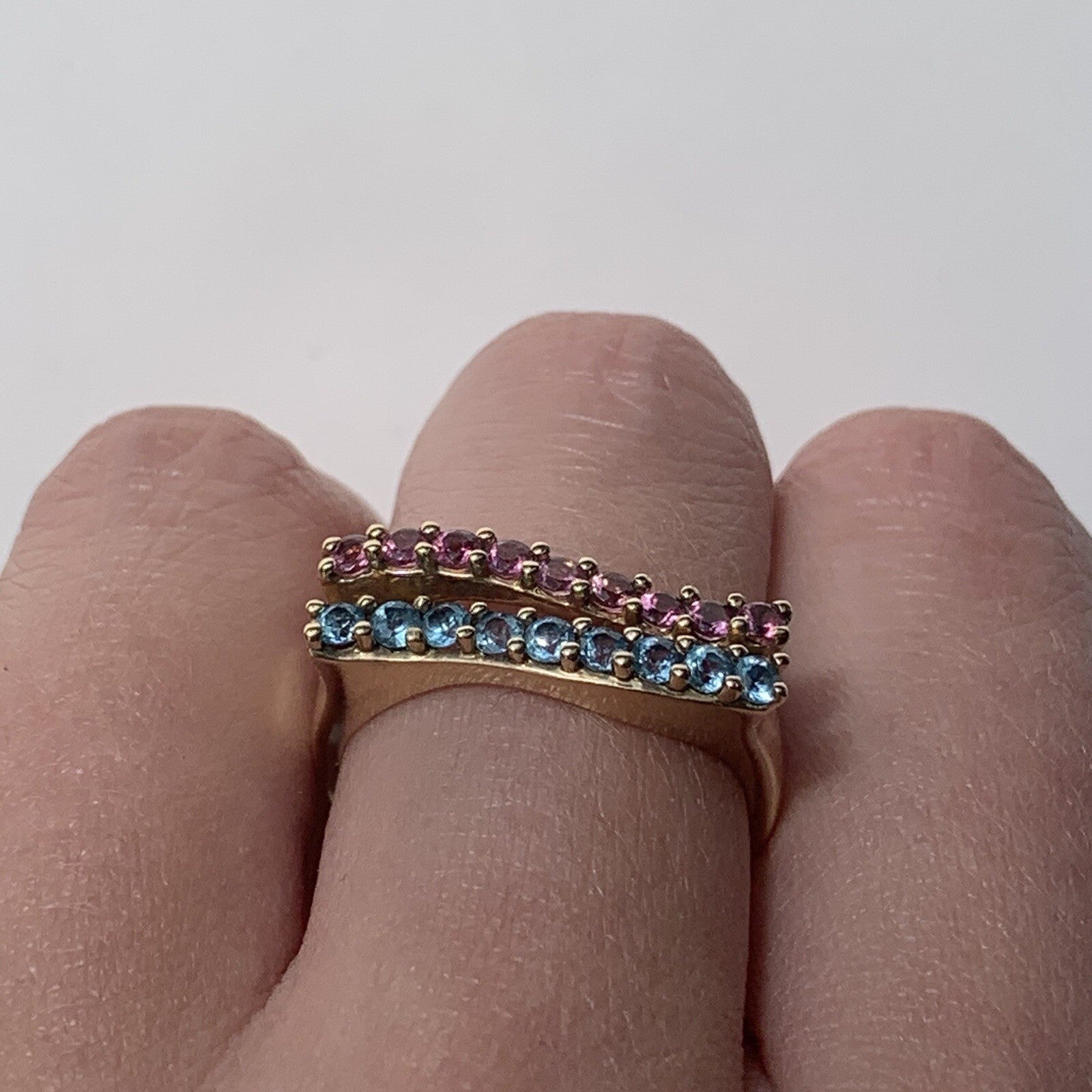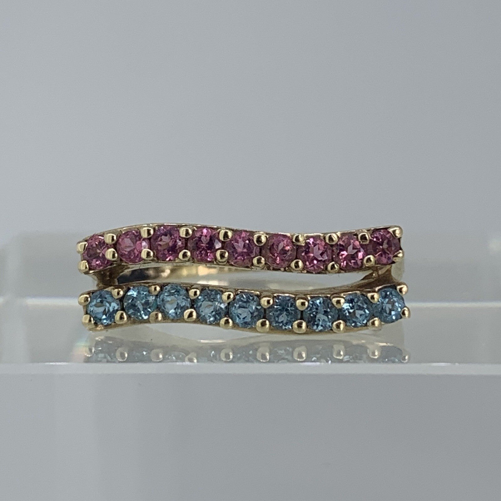 Rhodolite Garnet & Blue Topaz Unique Wave Ring 9ct 375 Yellow Gold - Size Q