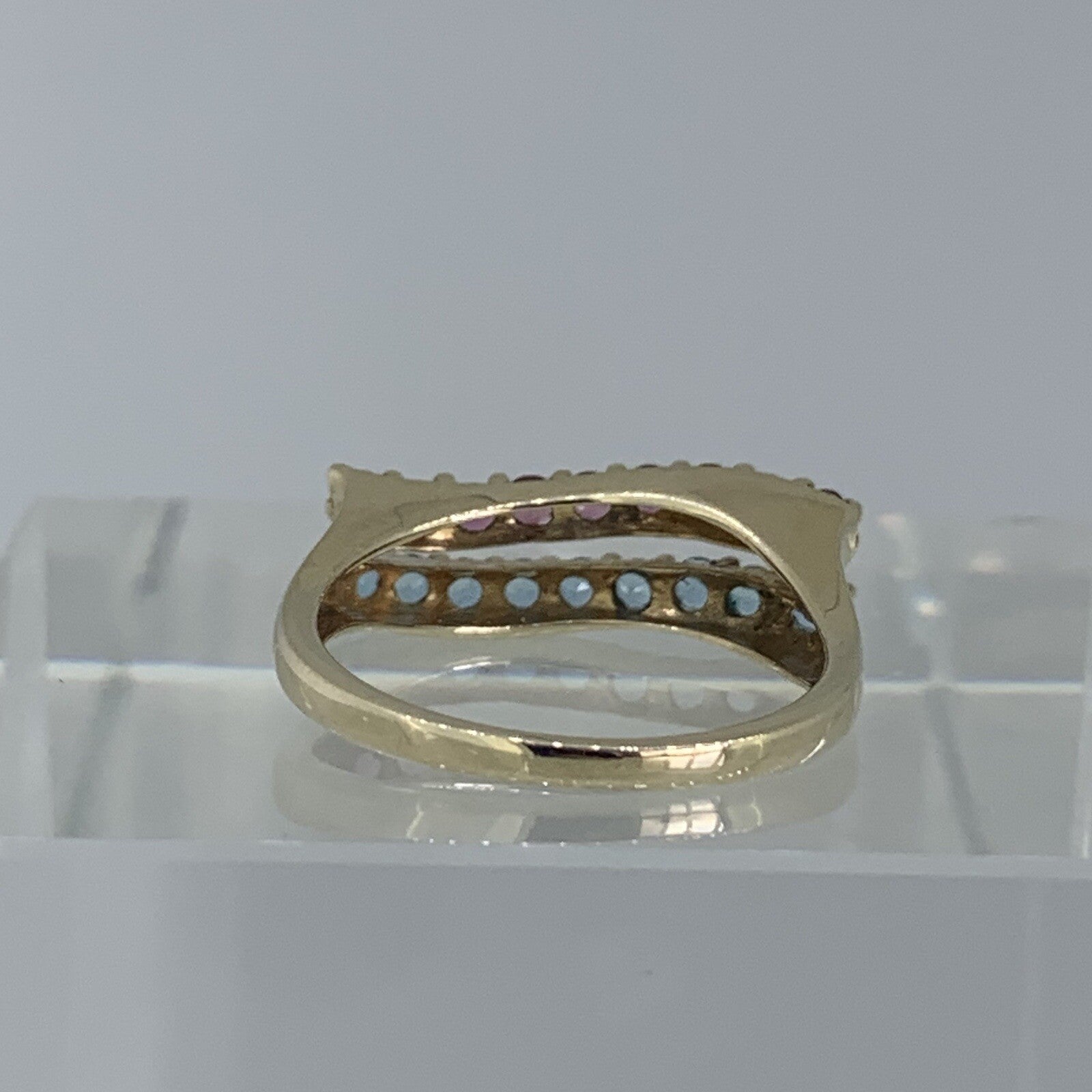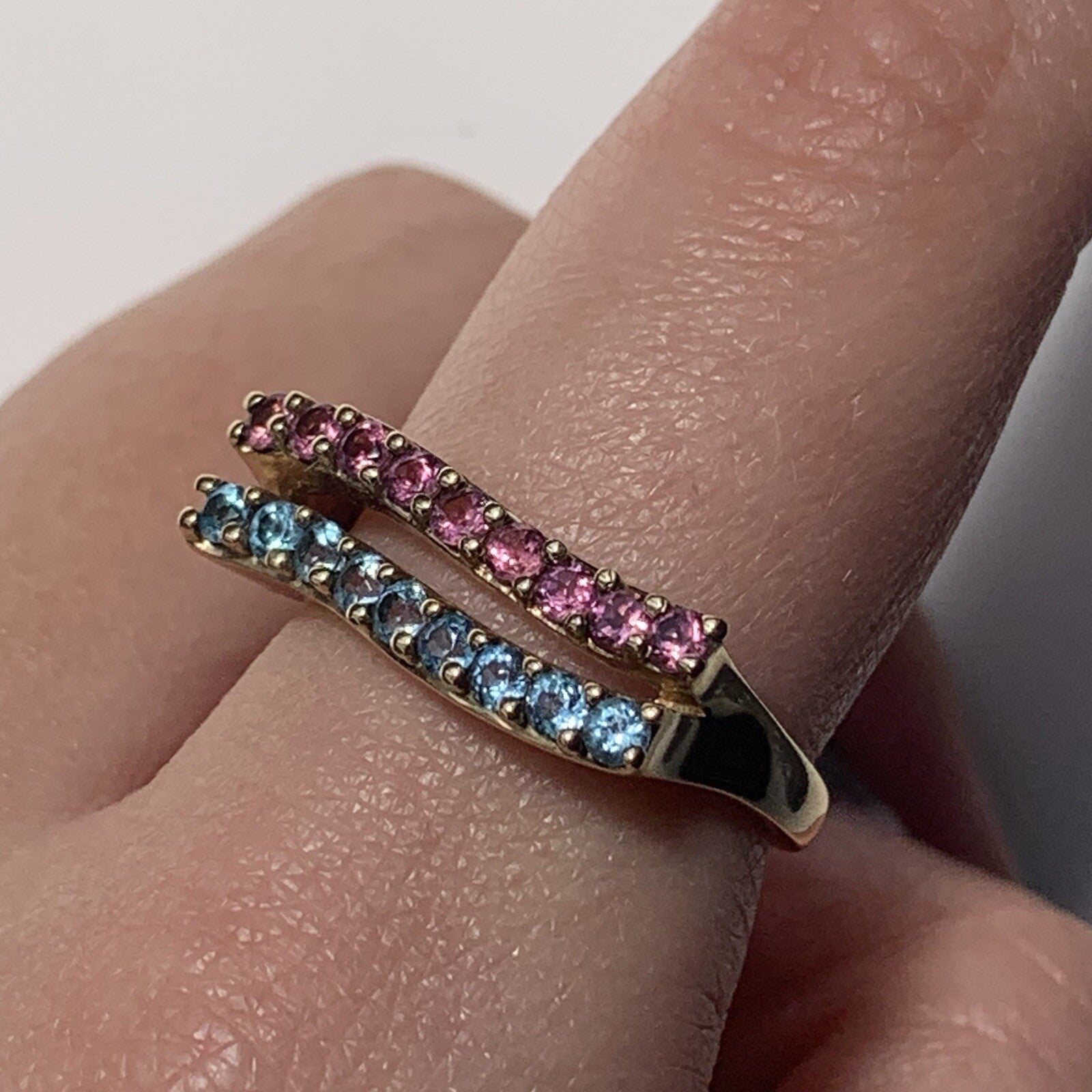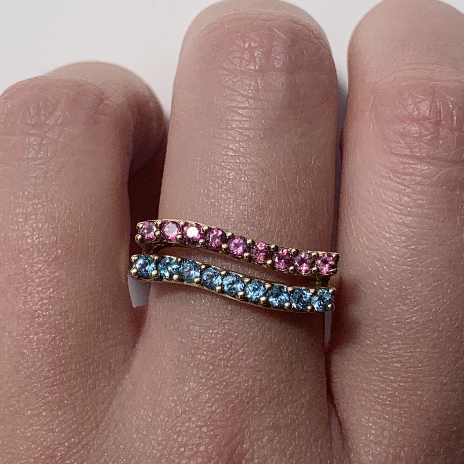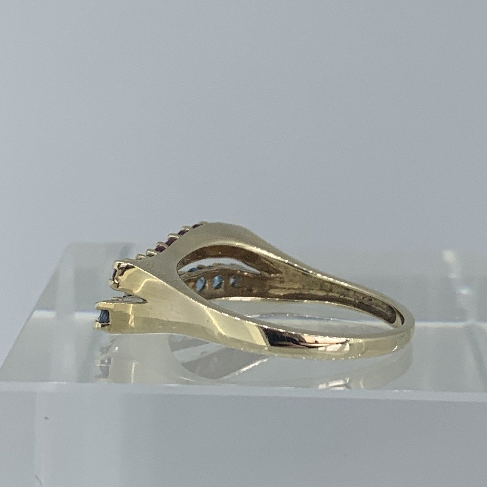 Rhodolite Garnet & Blue Topaz Unique Wave Ring 9ct 375 Yellow Gold - Size Q