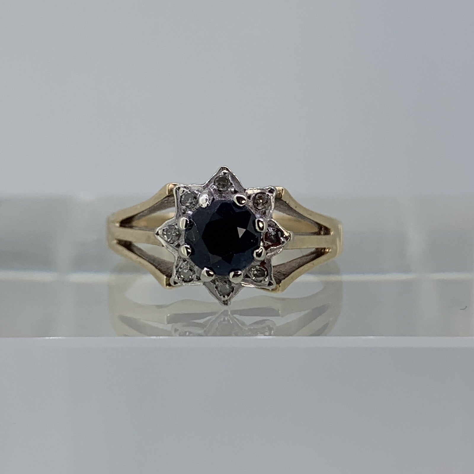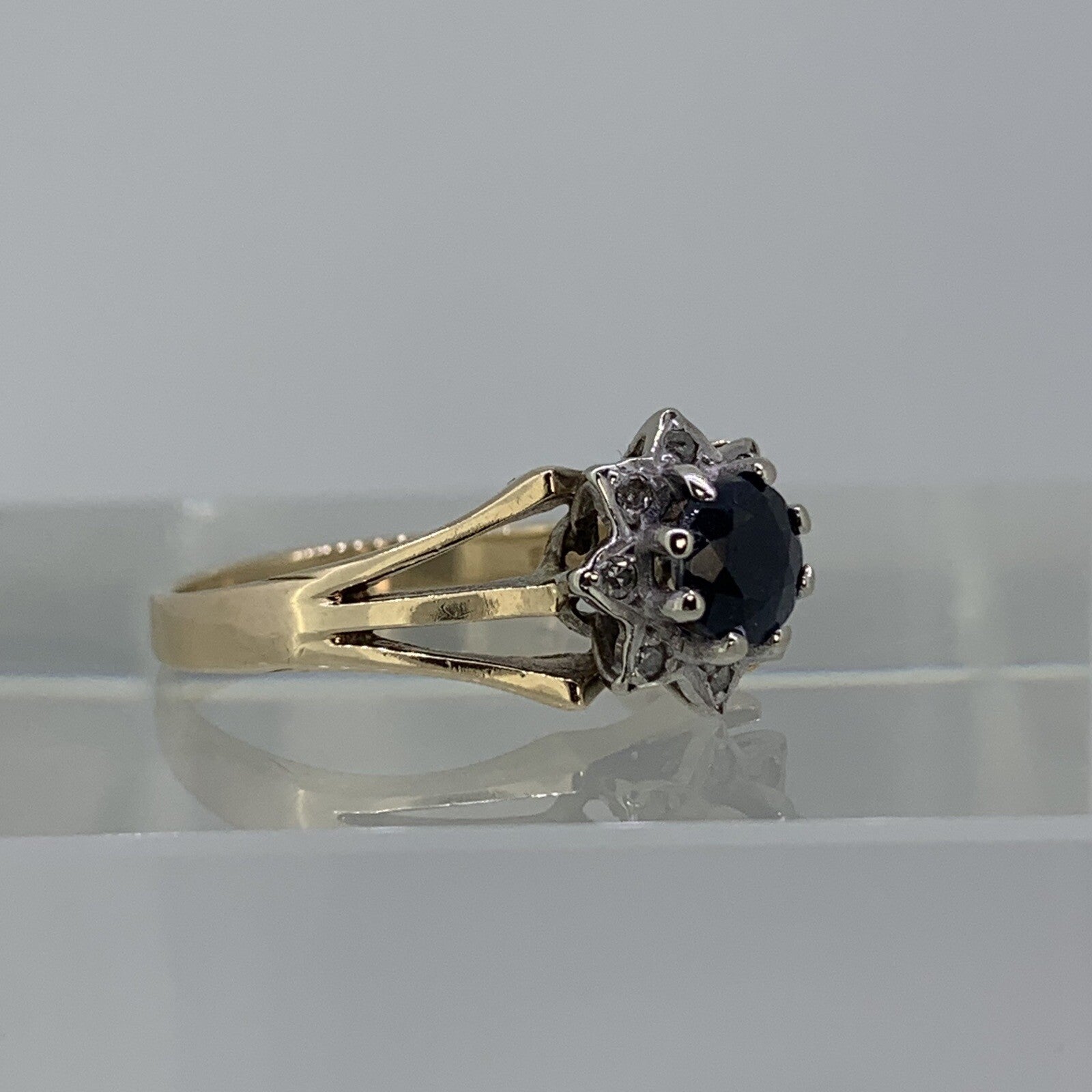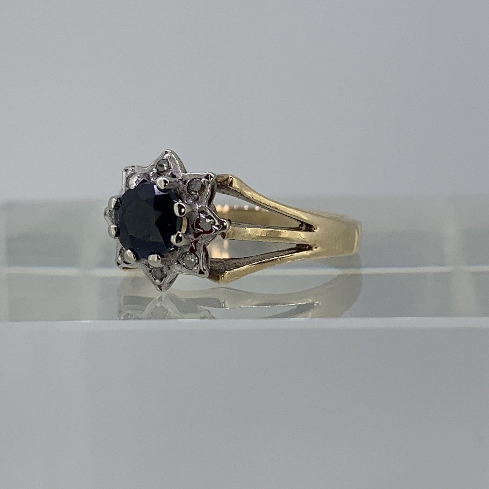 Sapphire & Diamond Daisy Open Shoulder Ring 9ct 9K Yellow Gold - Size M 1/2