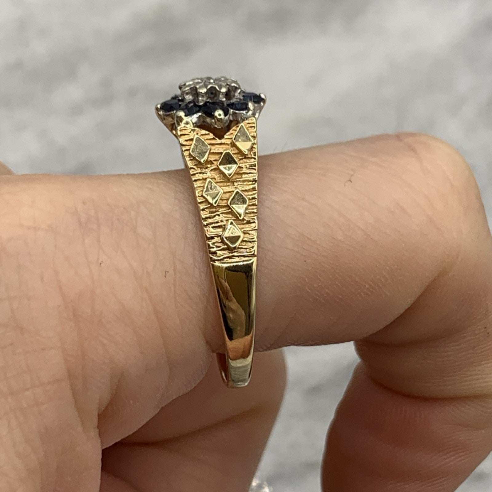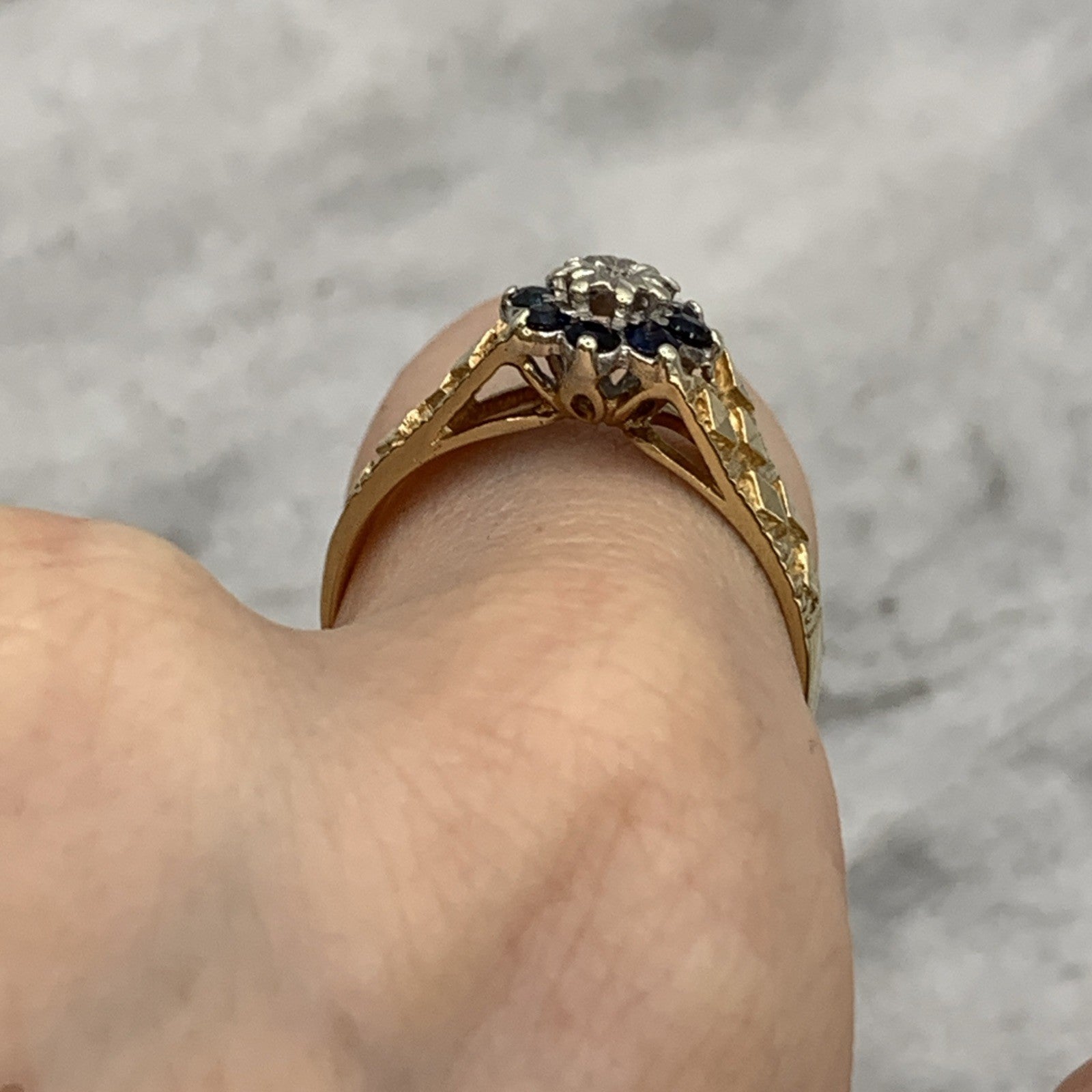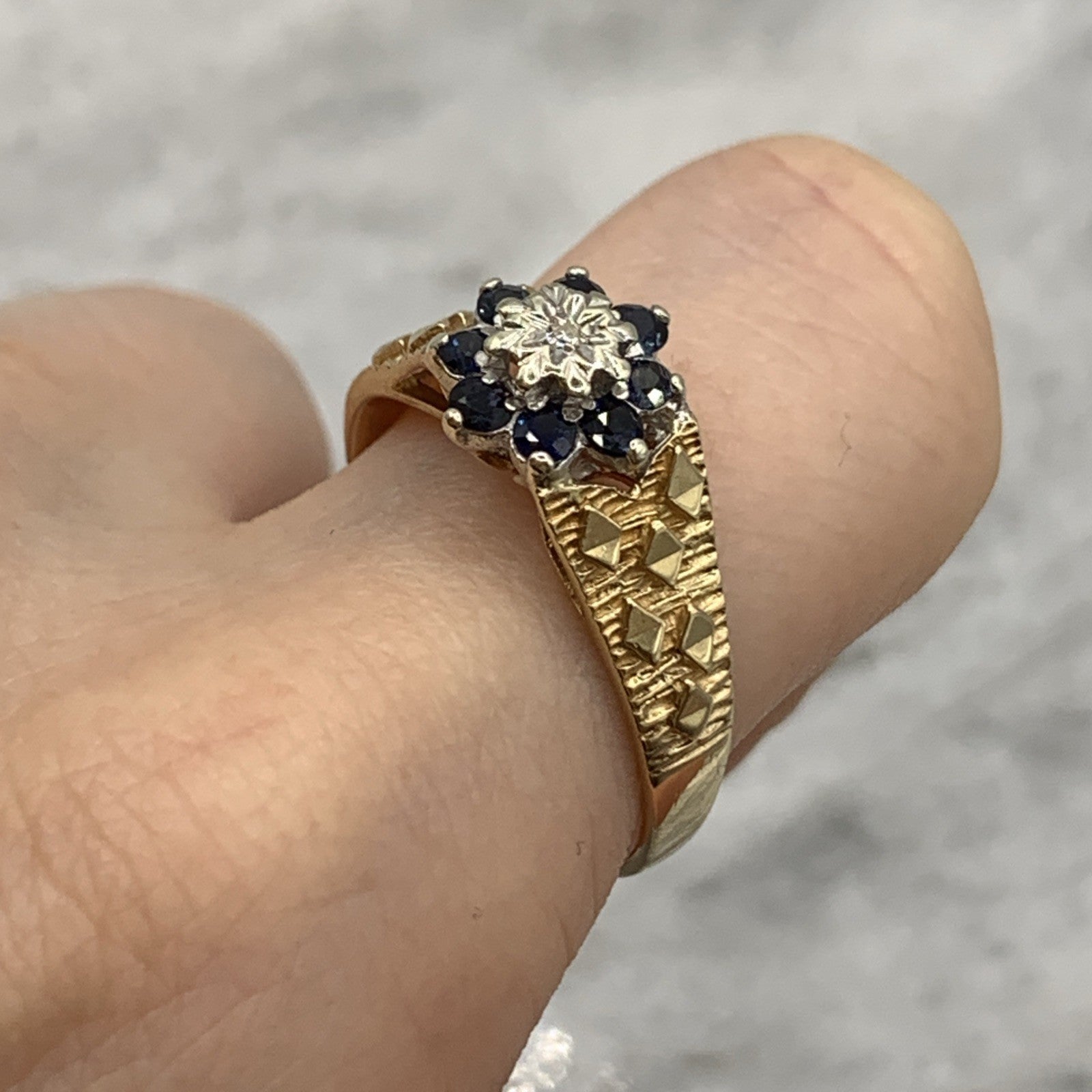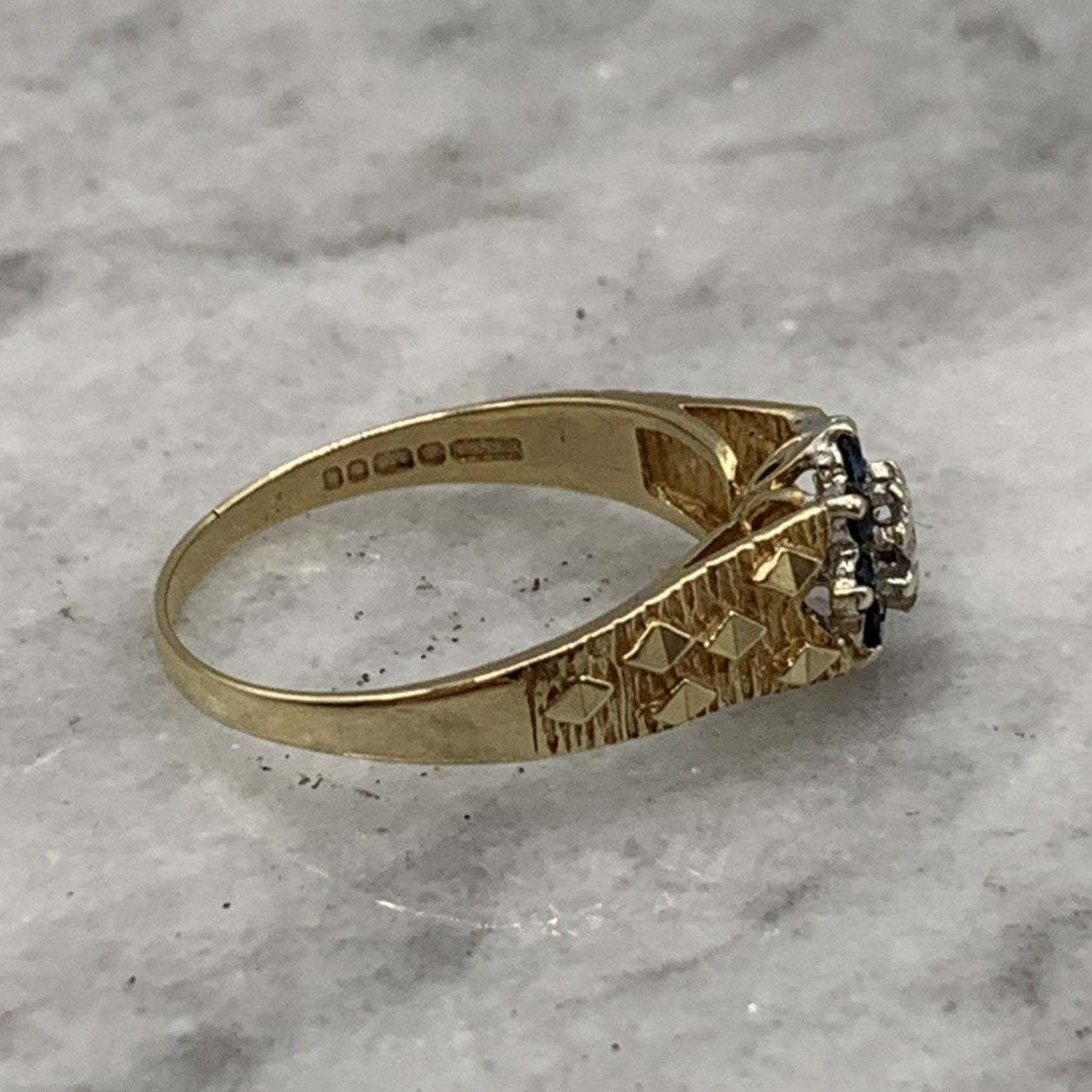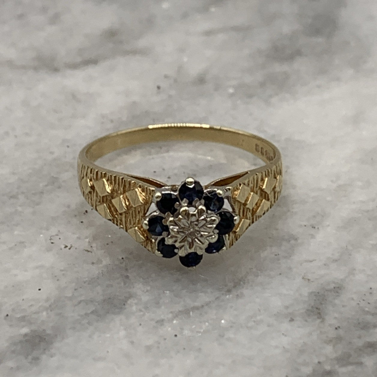 Sapphire & Diamond Flower Textured Ring 9ct 9k 375 Yellow Gold - Size V 1/2
