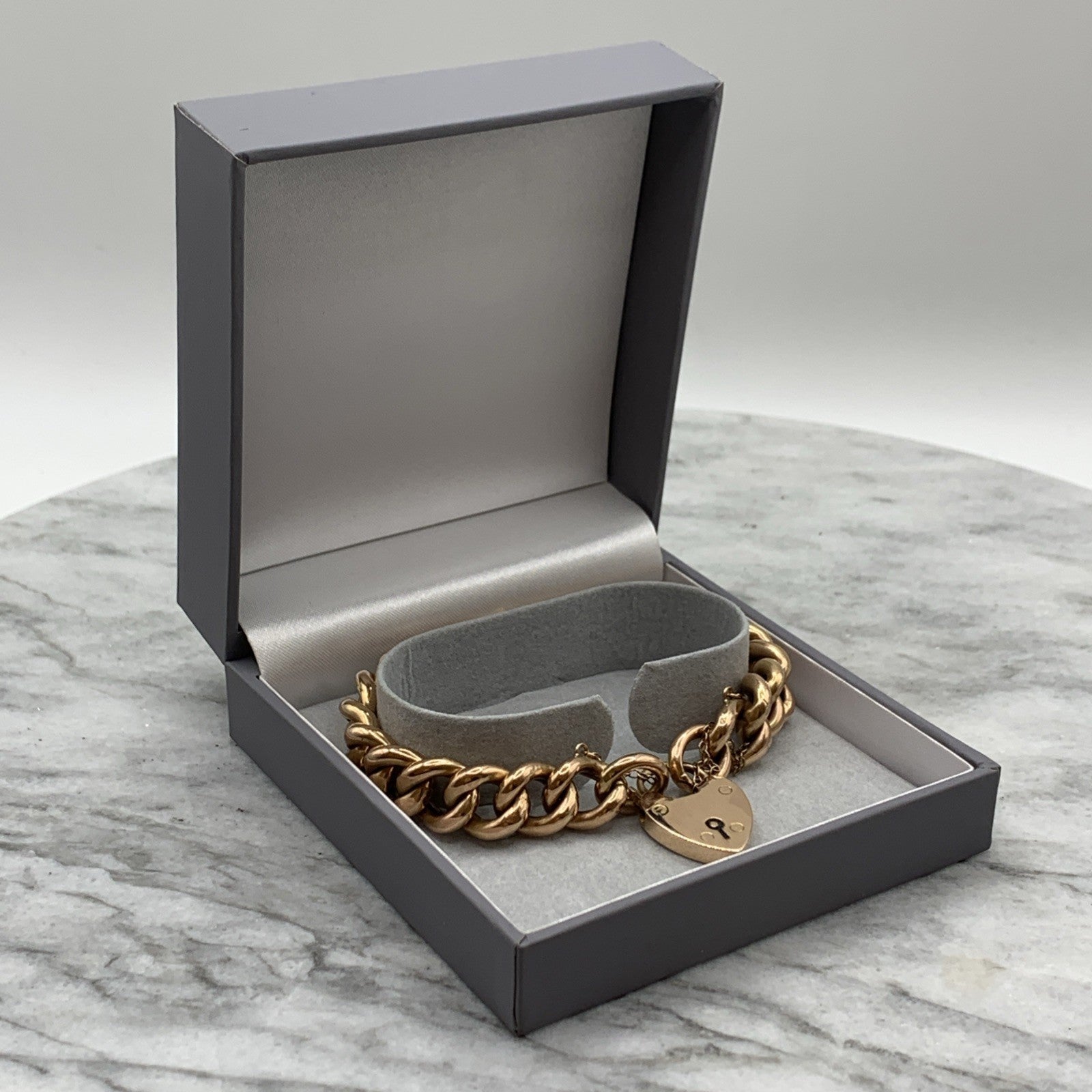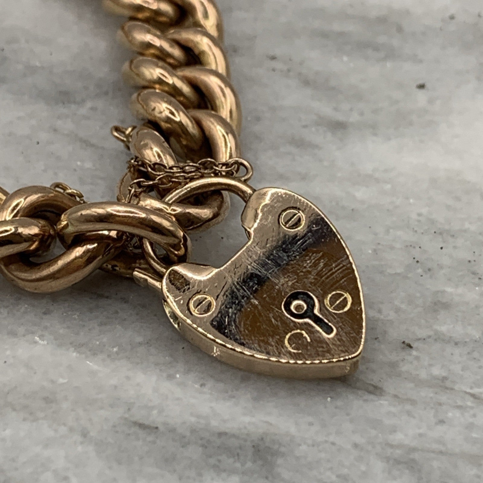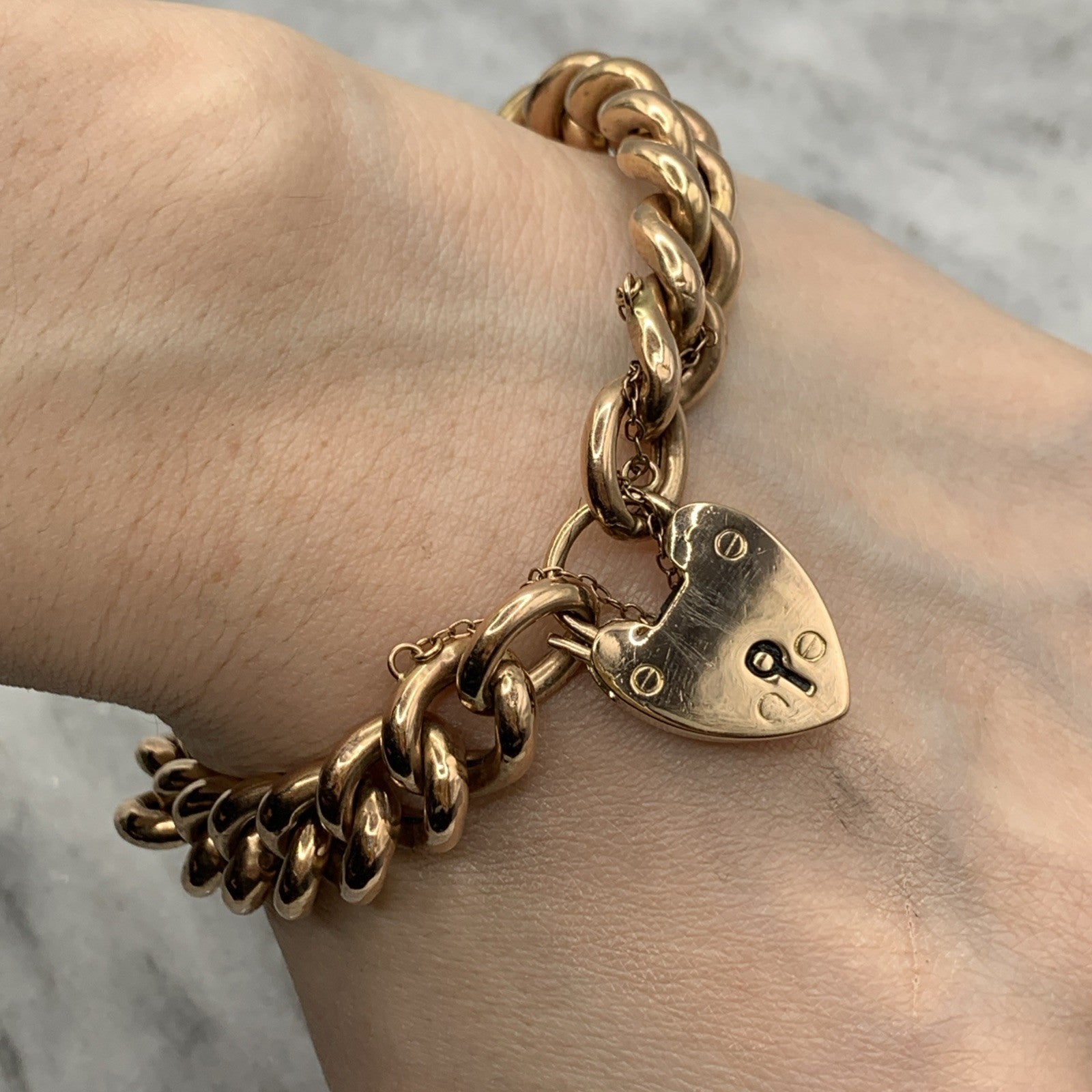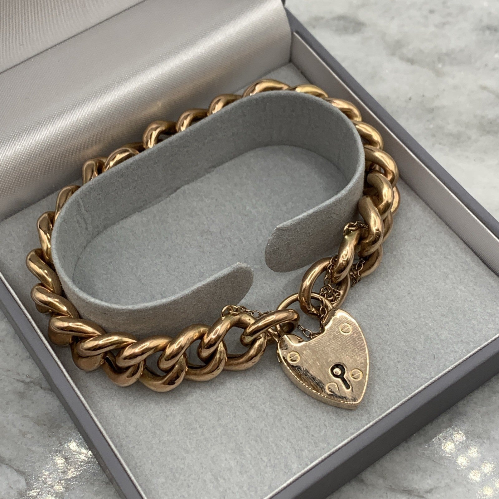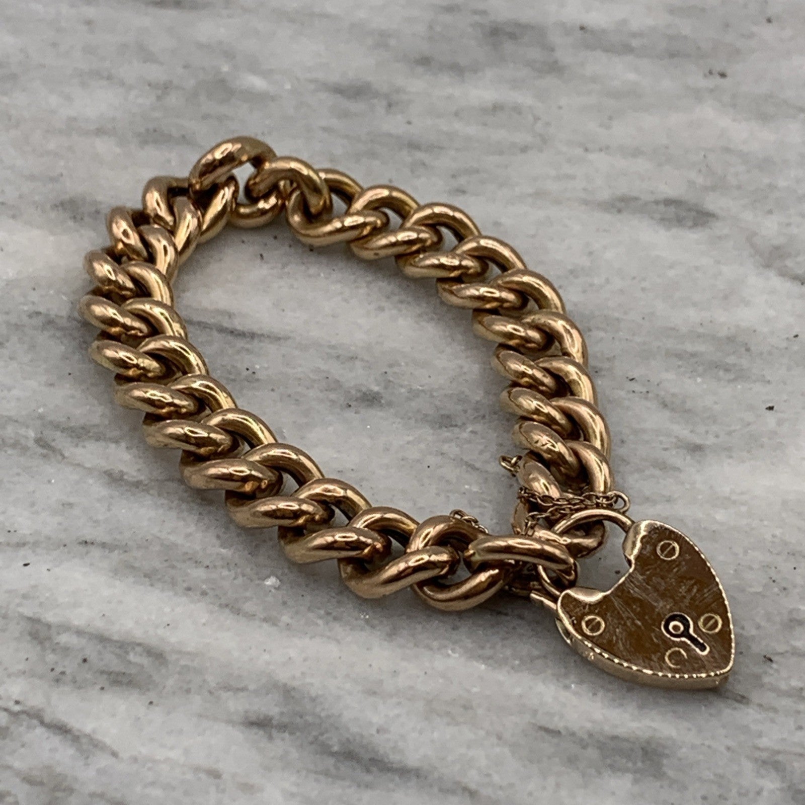 - A gorgeous rose gold chunky curb chain bracelet complete with a padlock closure and safety chain.