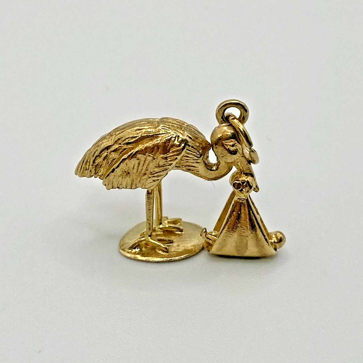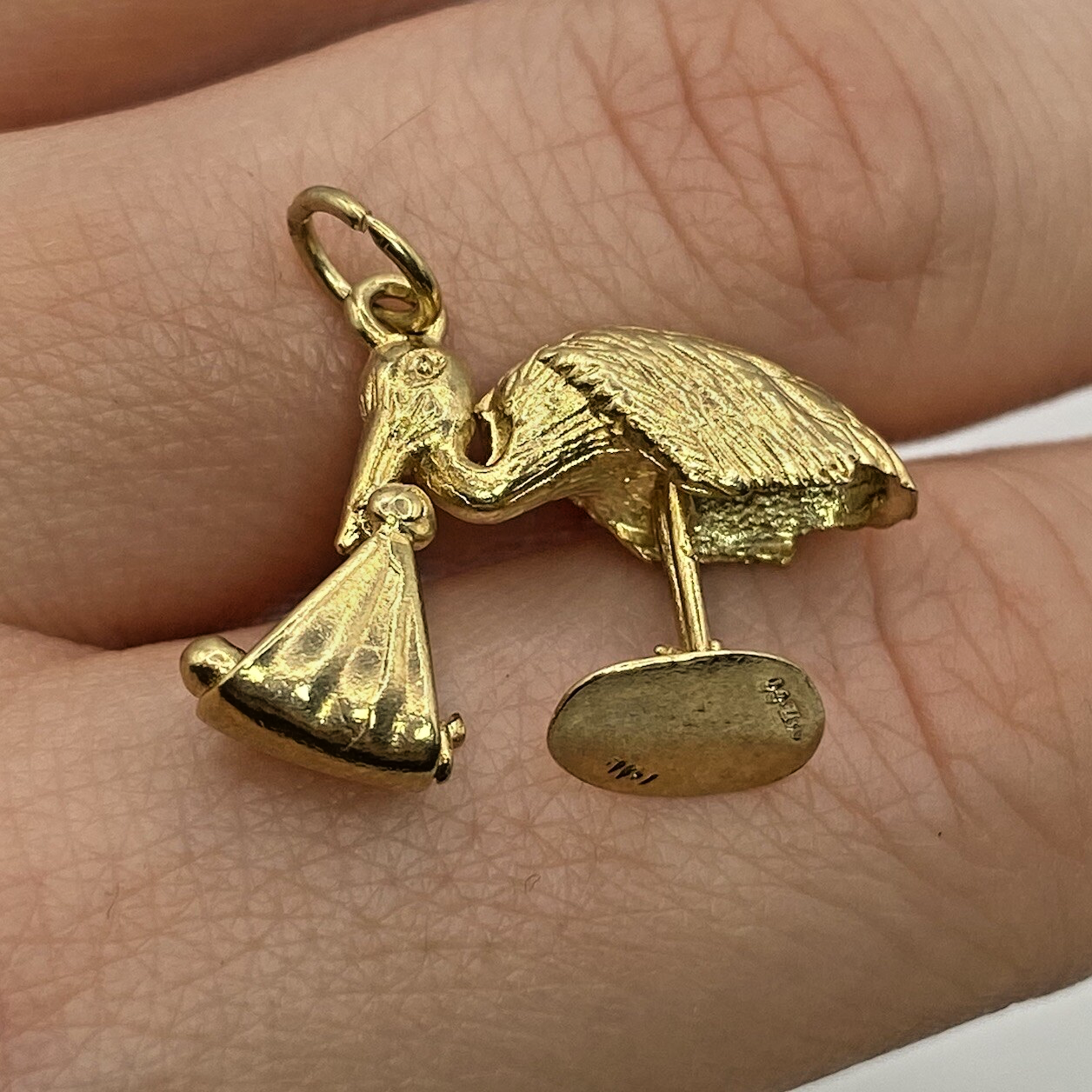 A lovely sentimental gold pendant in the shape of a stork bird carrying a new born baby.