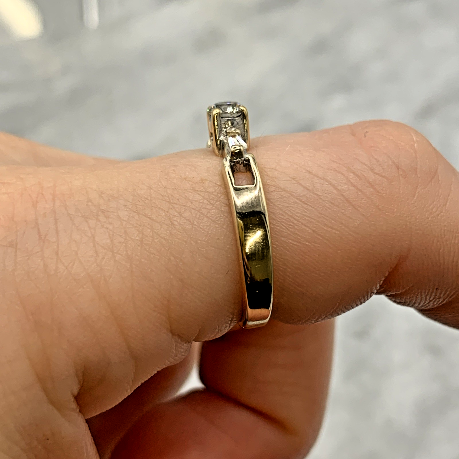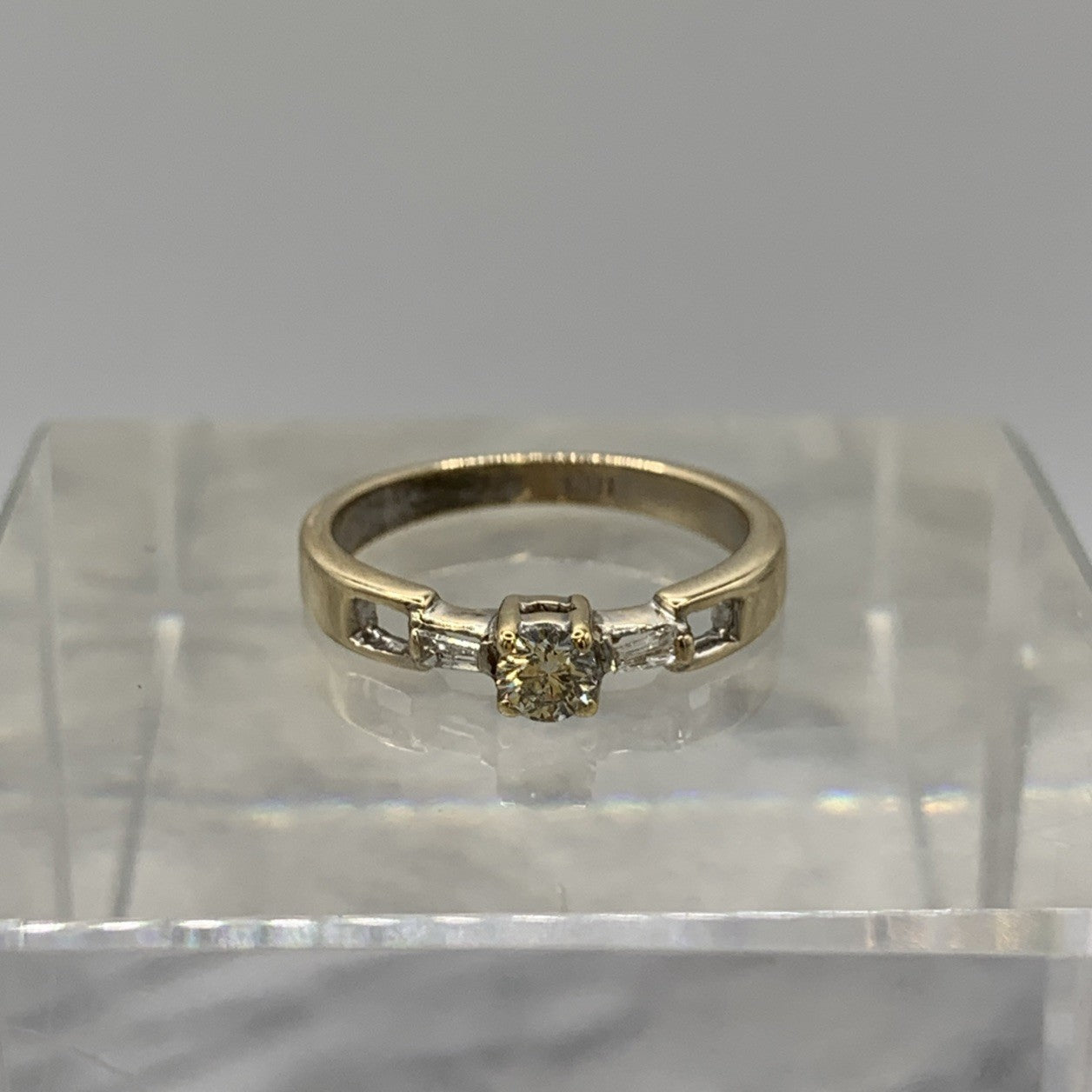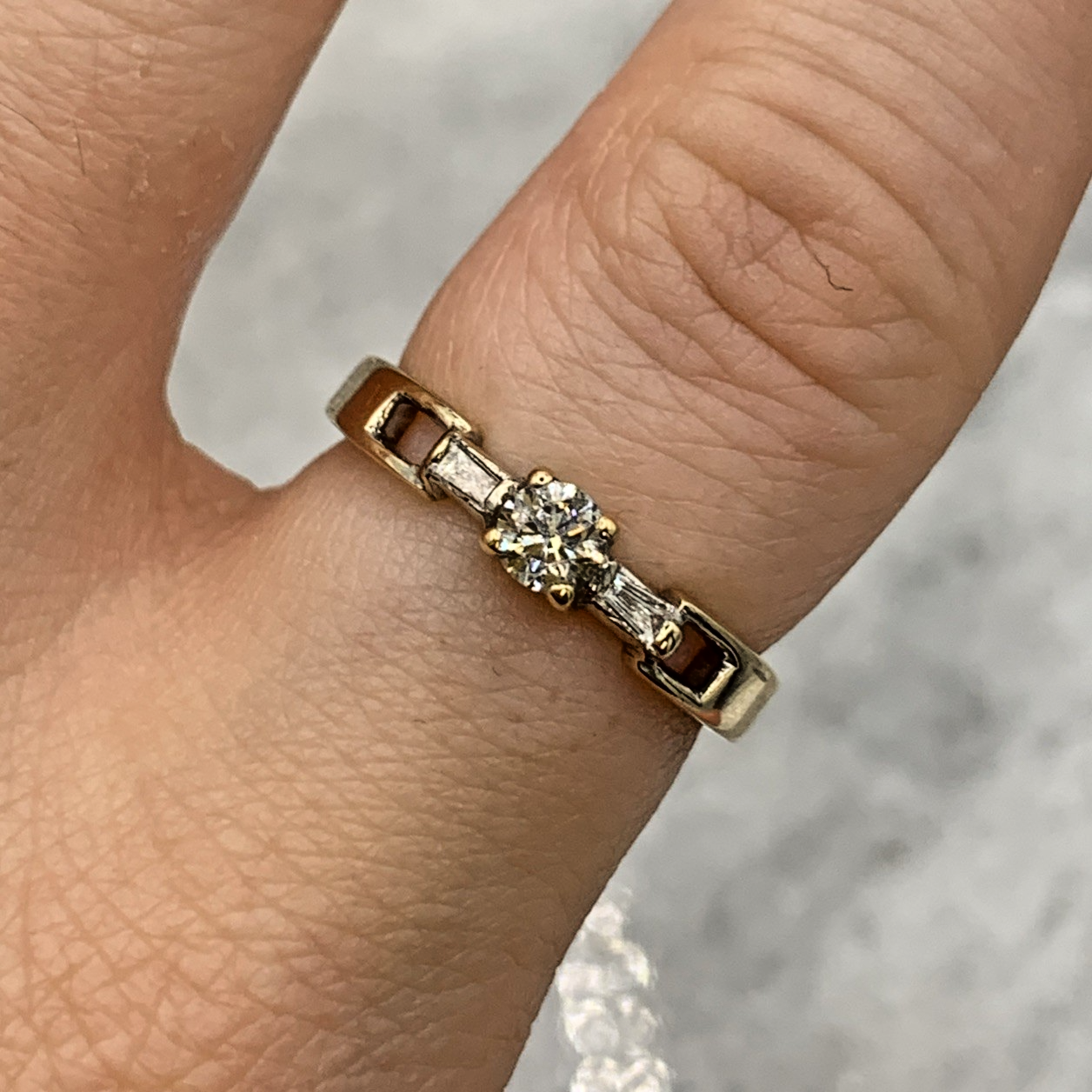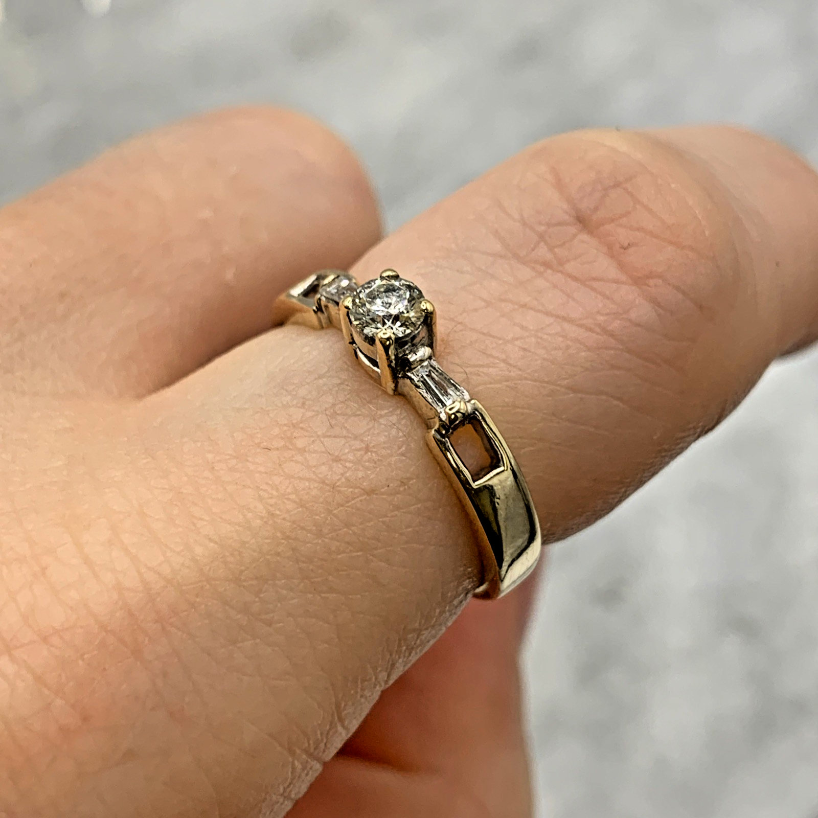 A beautiful ring showcasing a round cut diamond, flanked by a duo of baguette cut diamonds and cut out shoulder detailing.