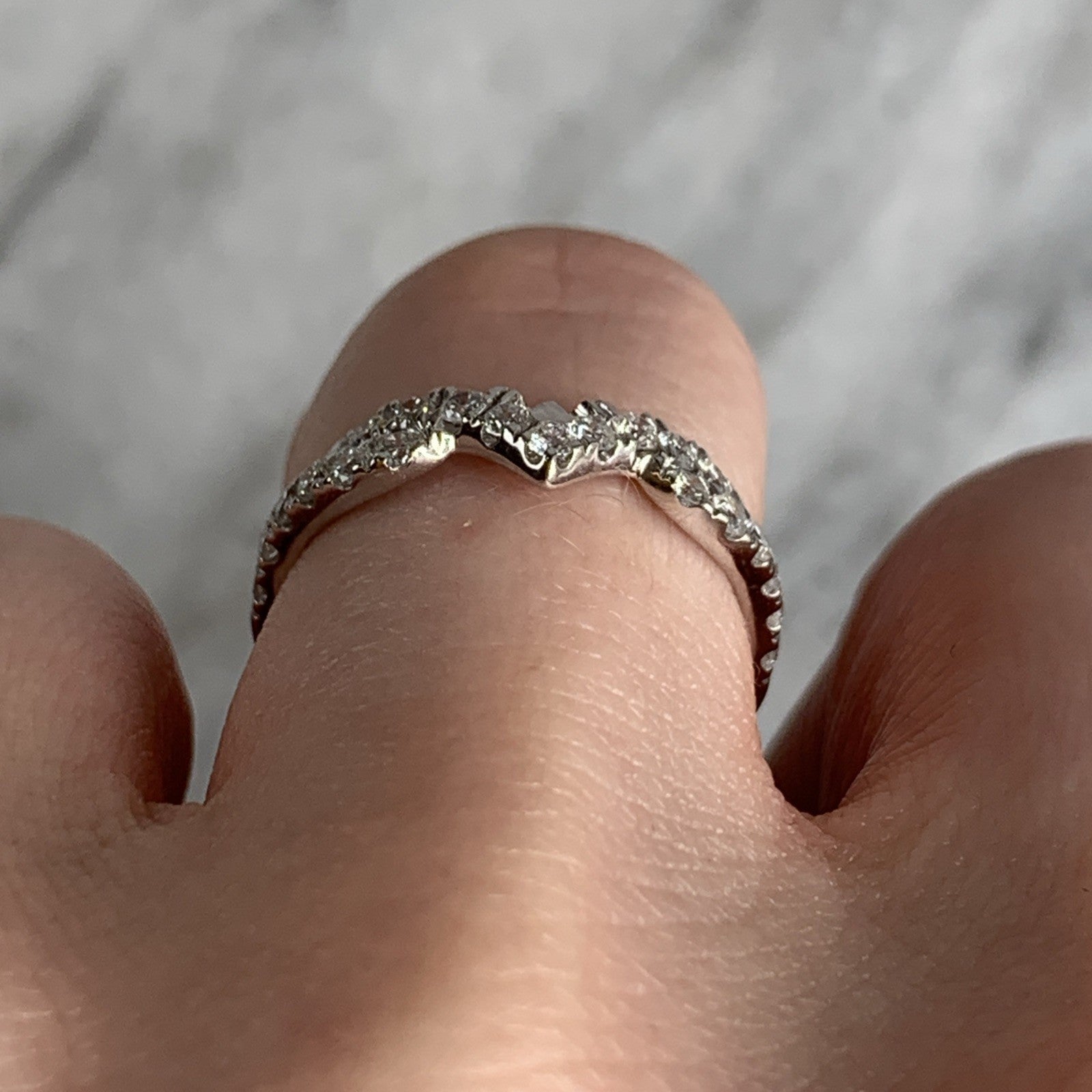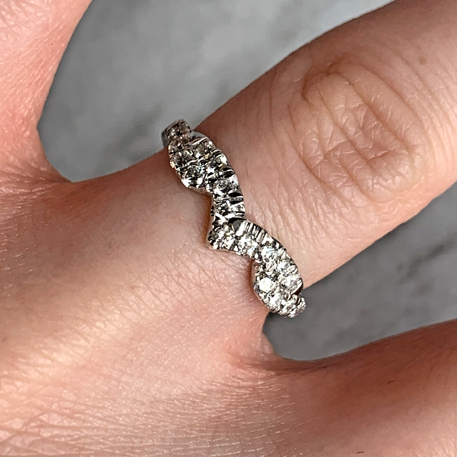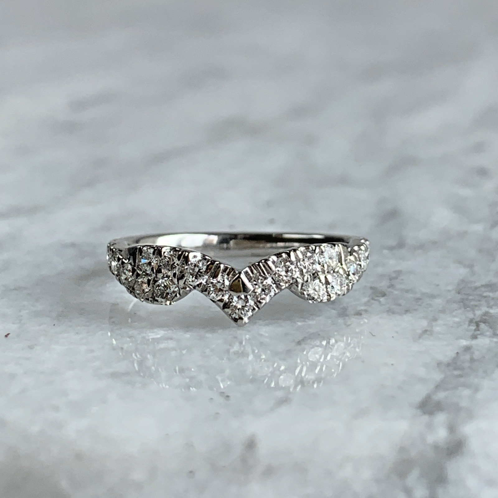 A gorgeous white gold wishbone style ring adorned with pave set diamonds.