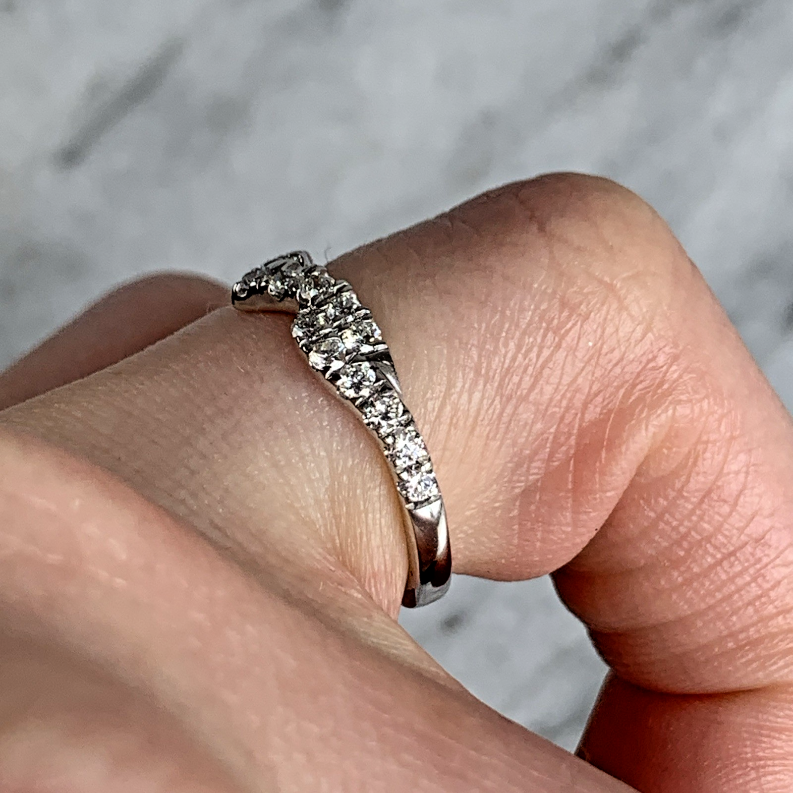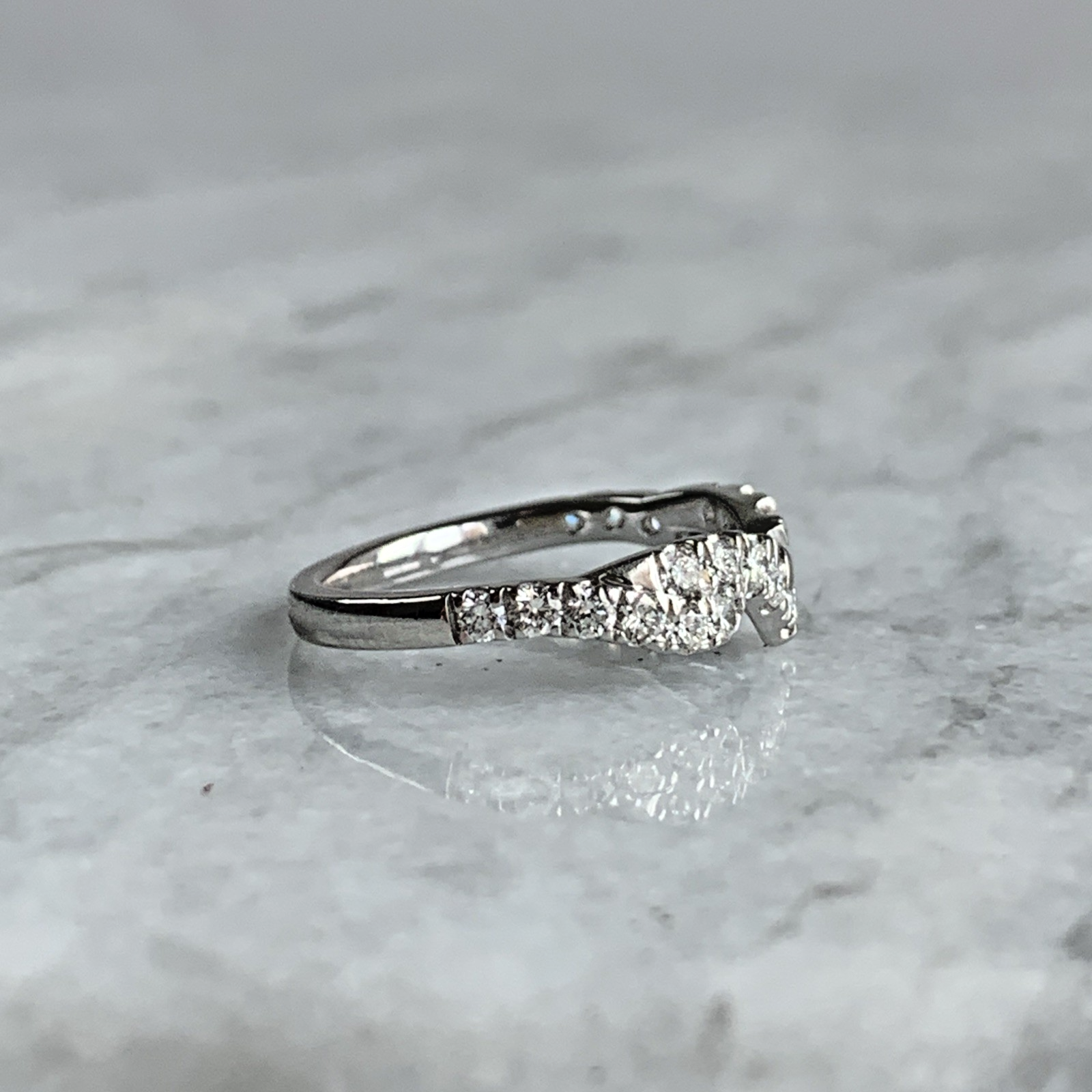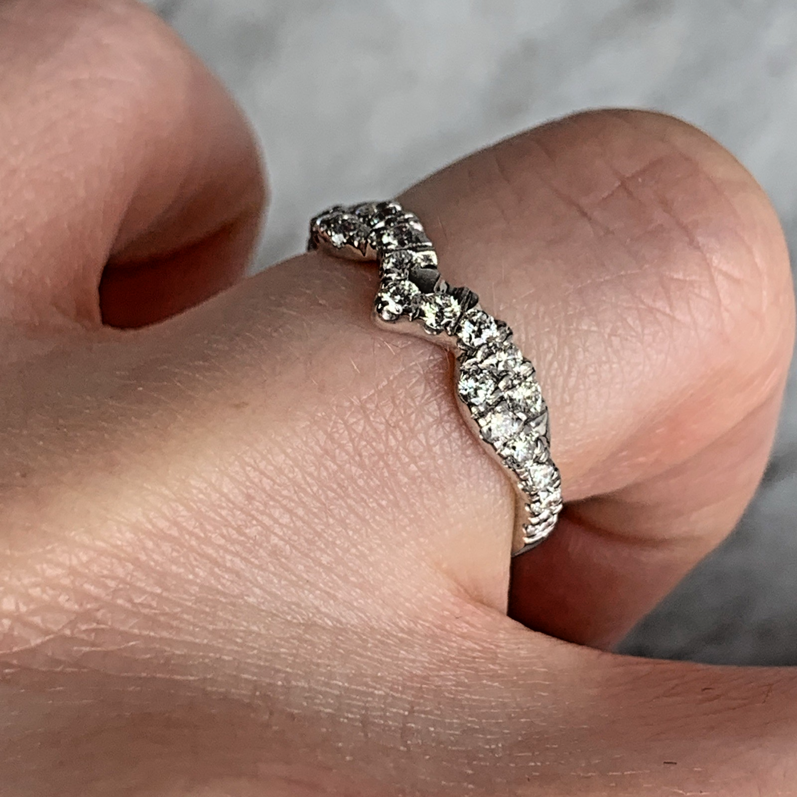 A gorgeous white gold wishbone style ring adorned with pave set diamonds.