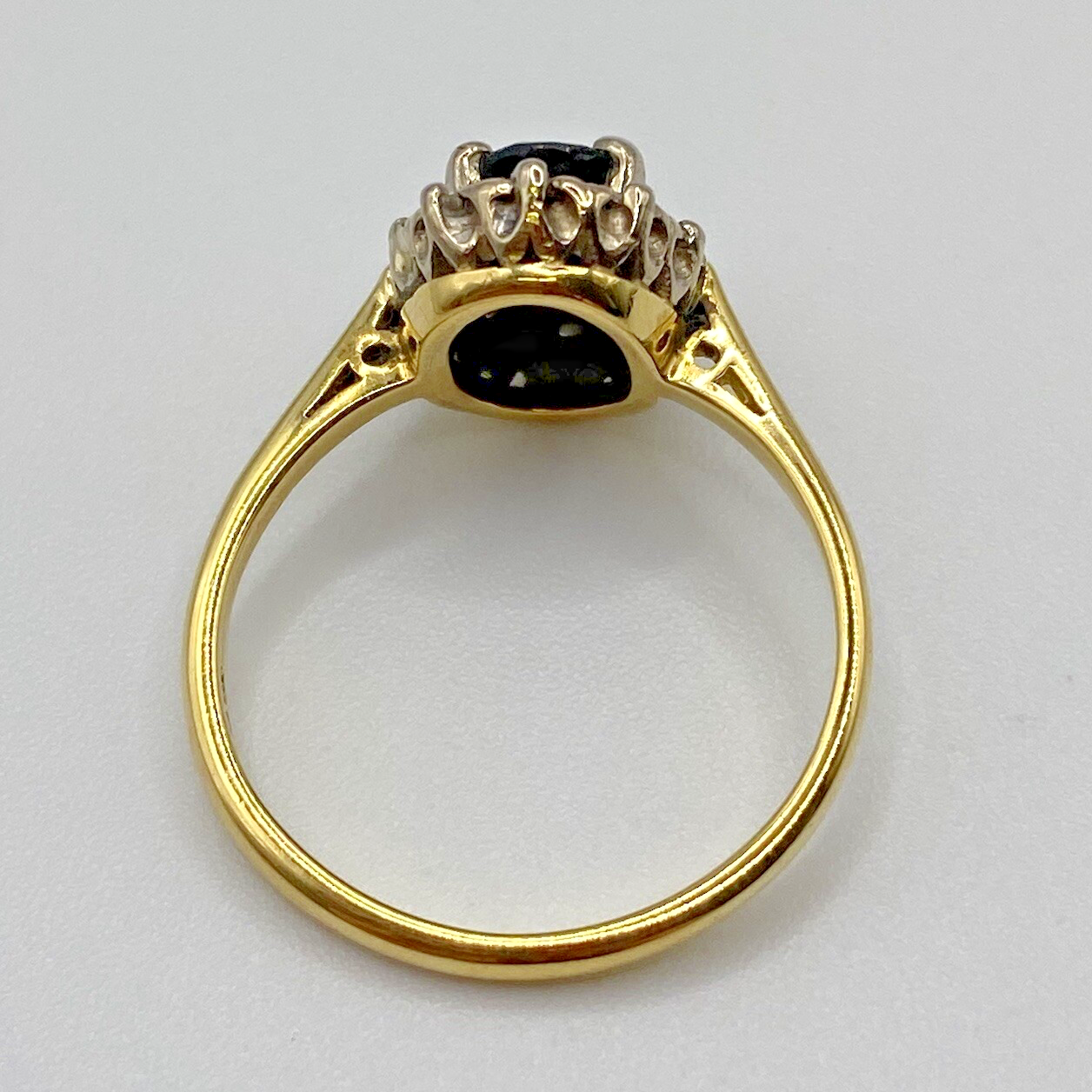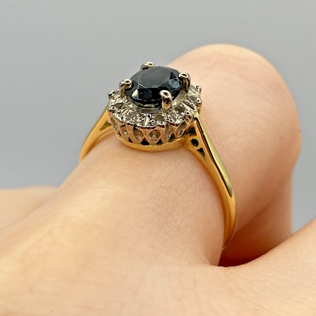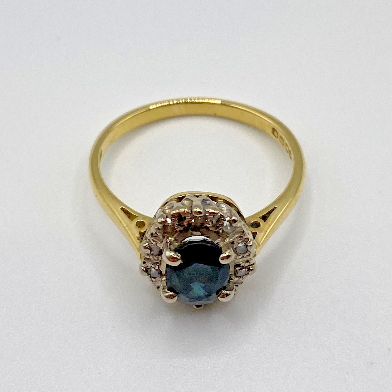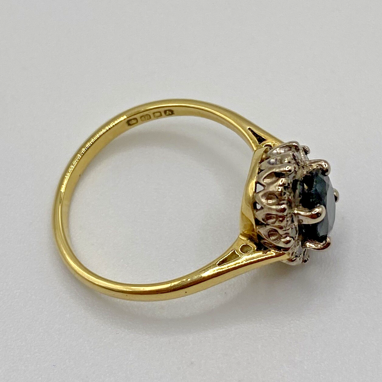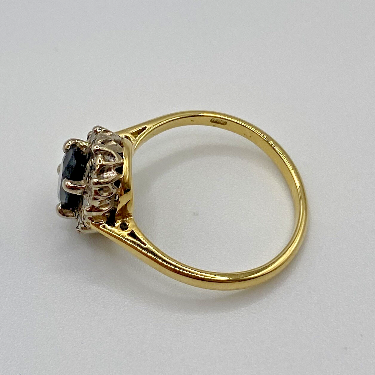 18 ct Gold Sapphire Diamond Ring in 750 Yellow Gold Halo Cluster - Size N