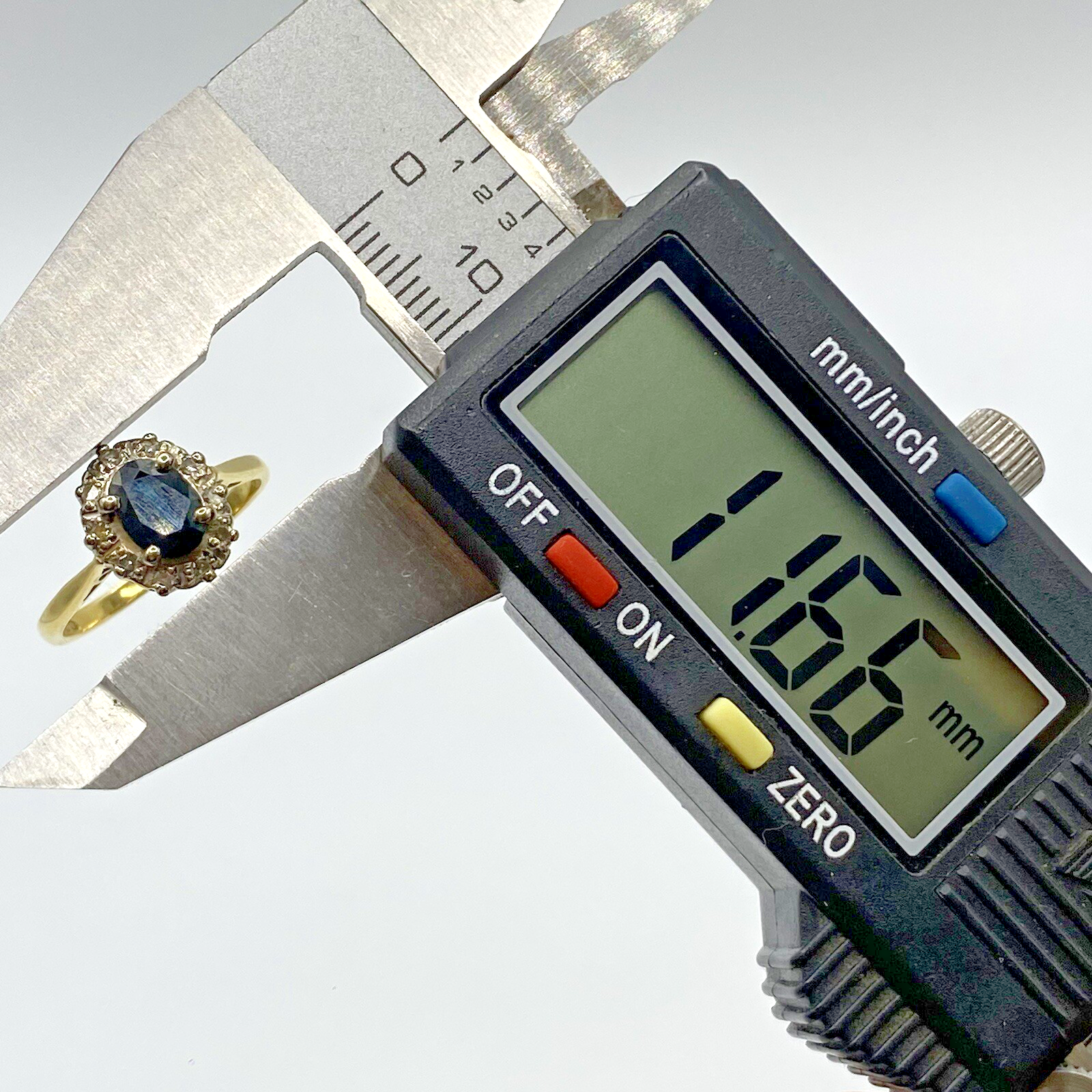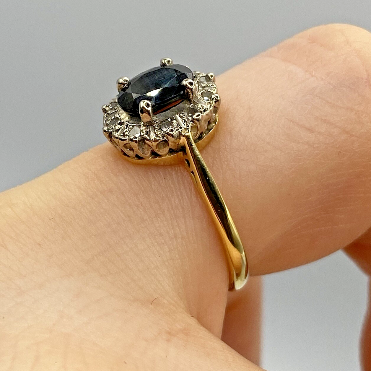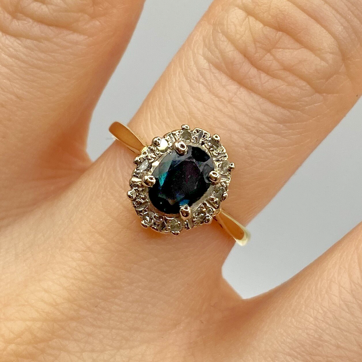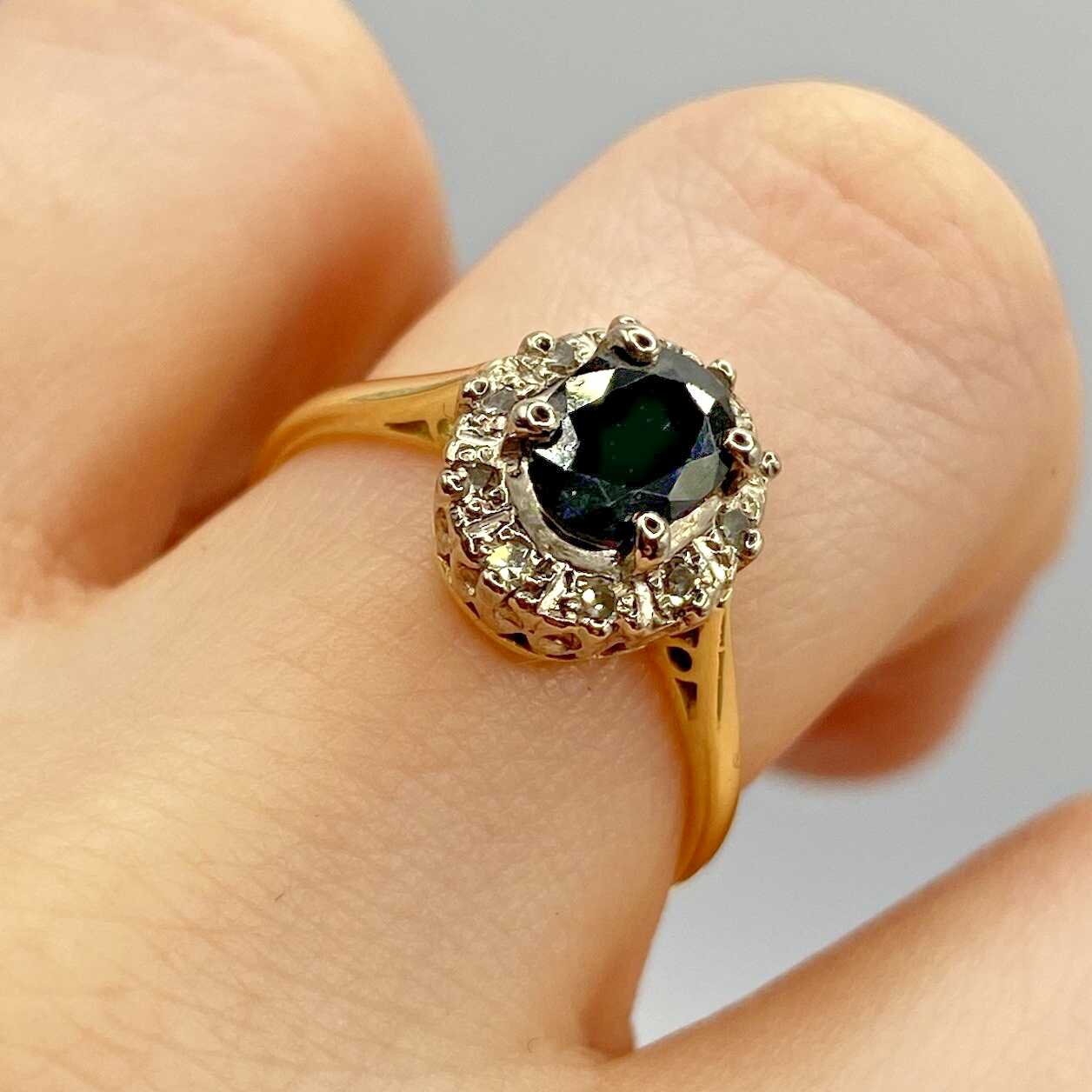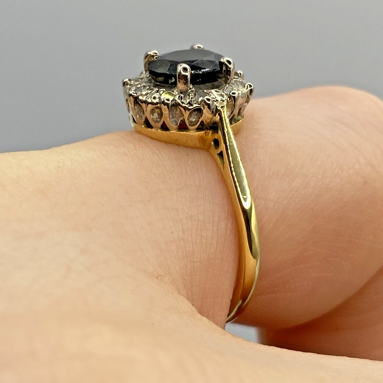 18 ct Gold Sapphire Diamond Ring in 750 Yellow Gold Halo Cluster - Size N