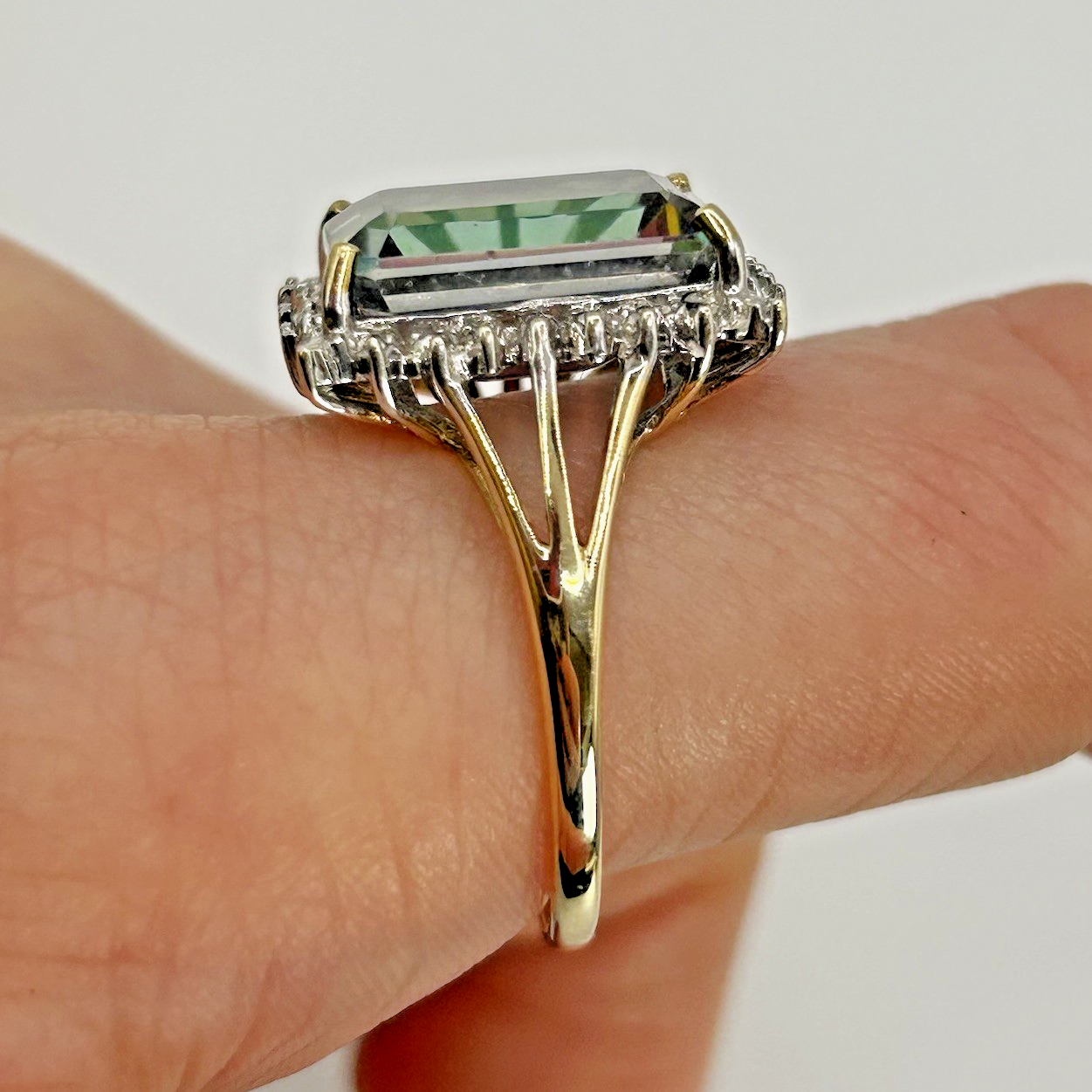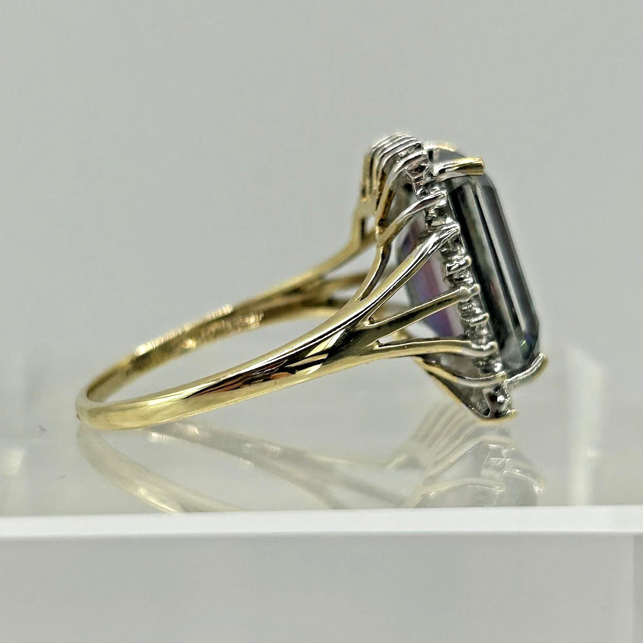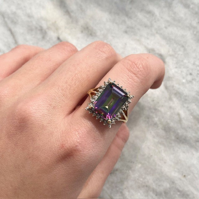 A stunning gold ring showcasing an ornate emerald-cut mystic topaz gemstone, haloed by petite diamonds and split shoulders to accent.