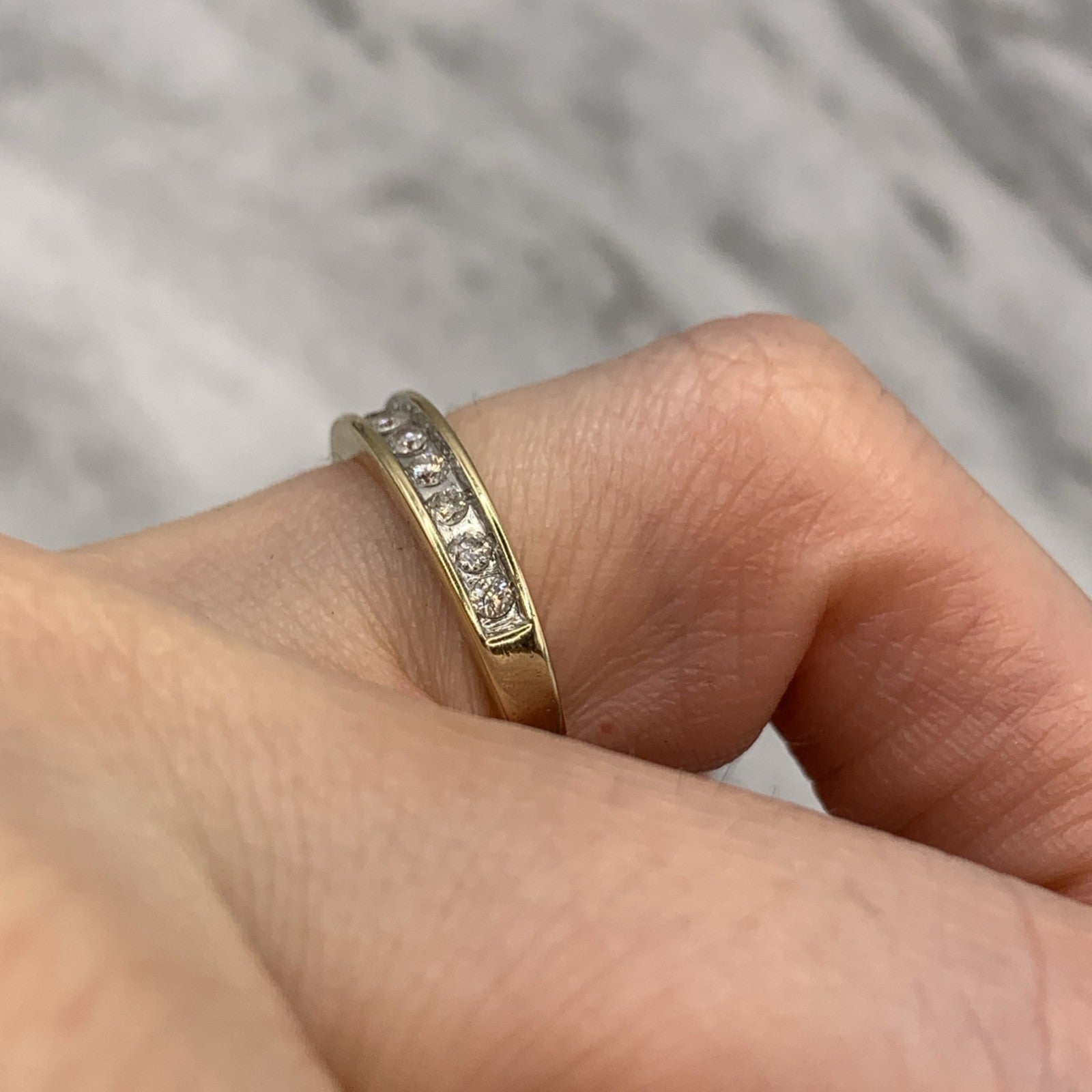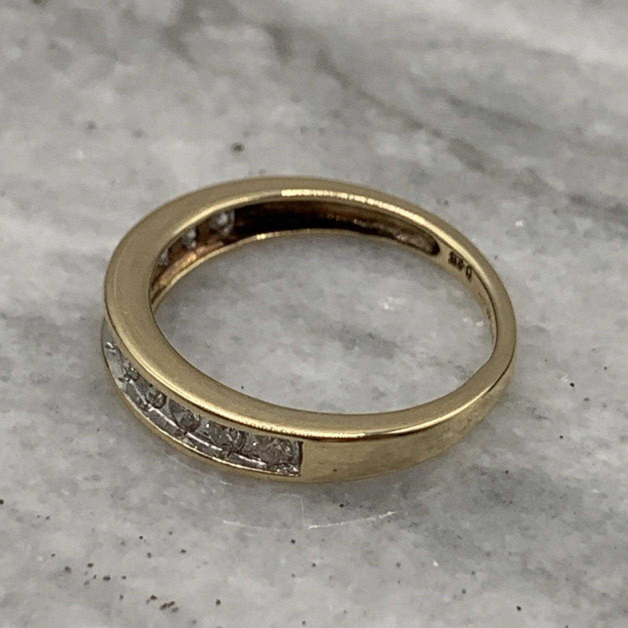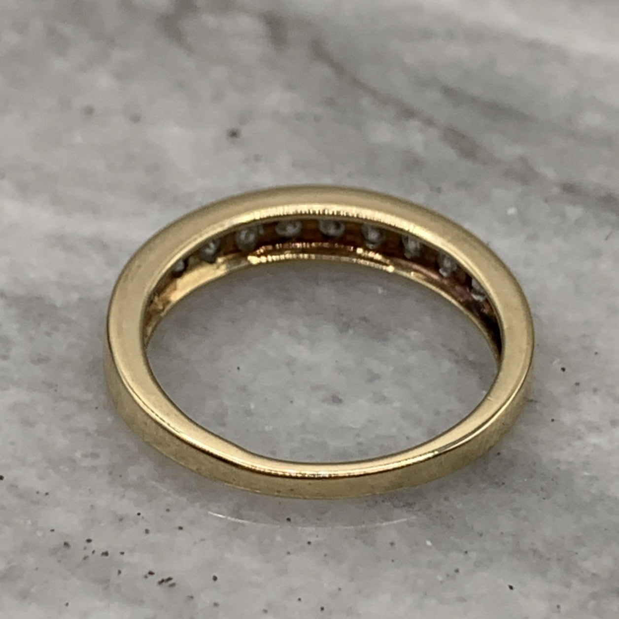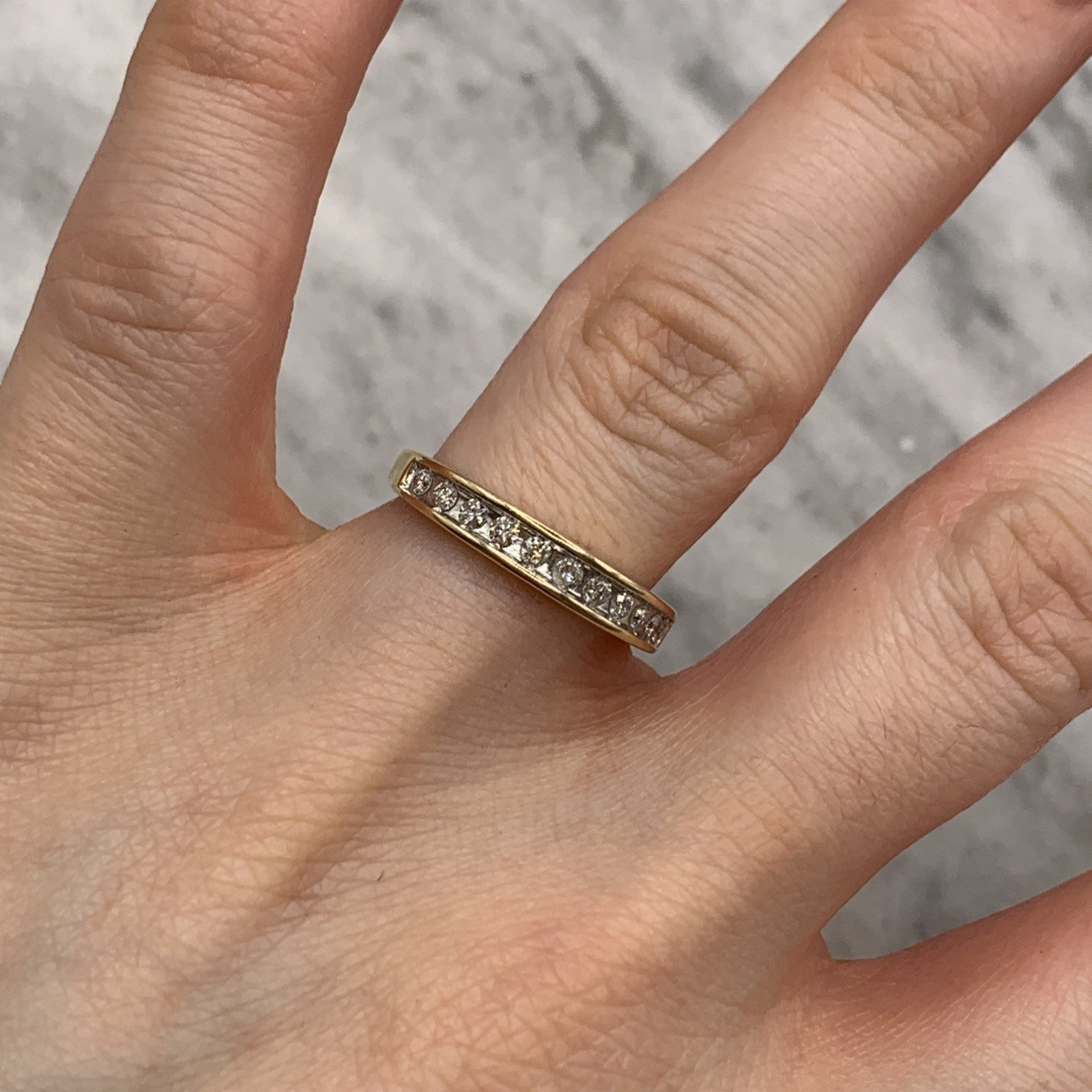 - A timeless gold band ring featuring a row of round cut diamonds in the half eternity style, amounting to .25ct.