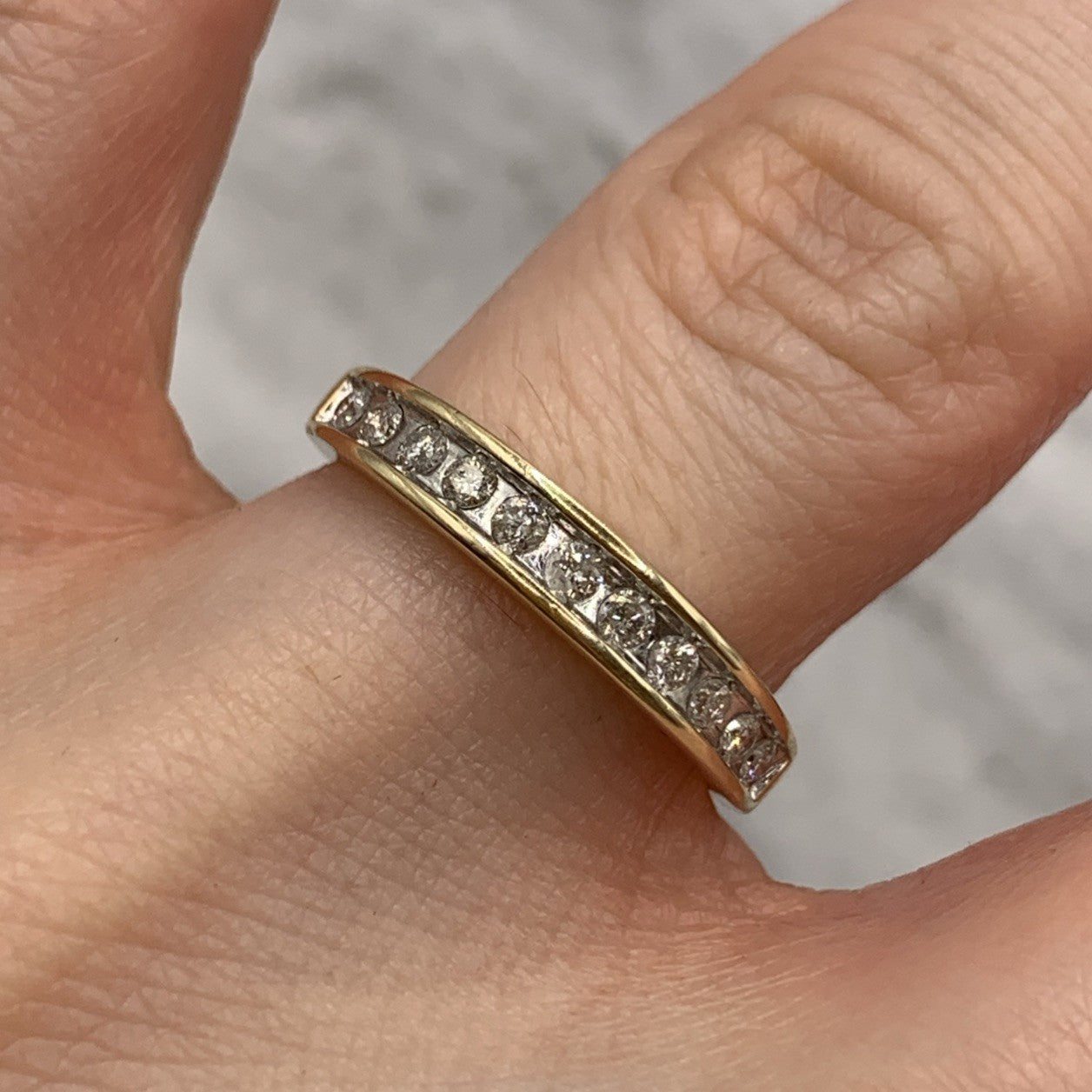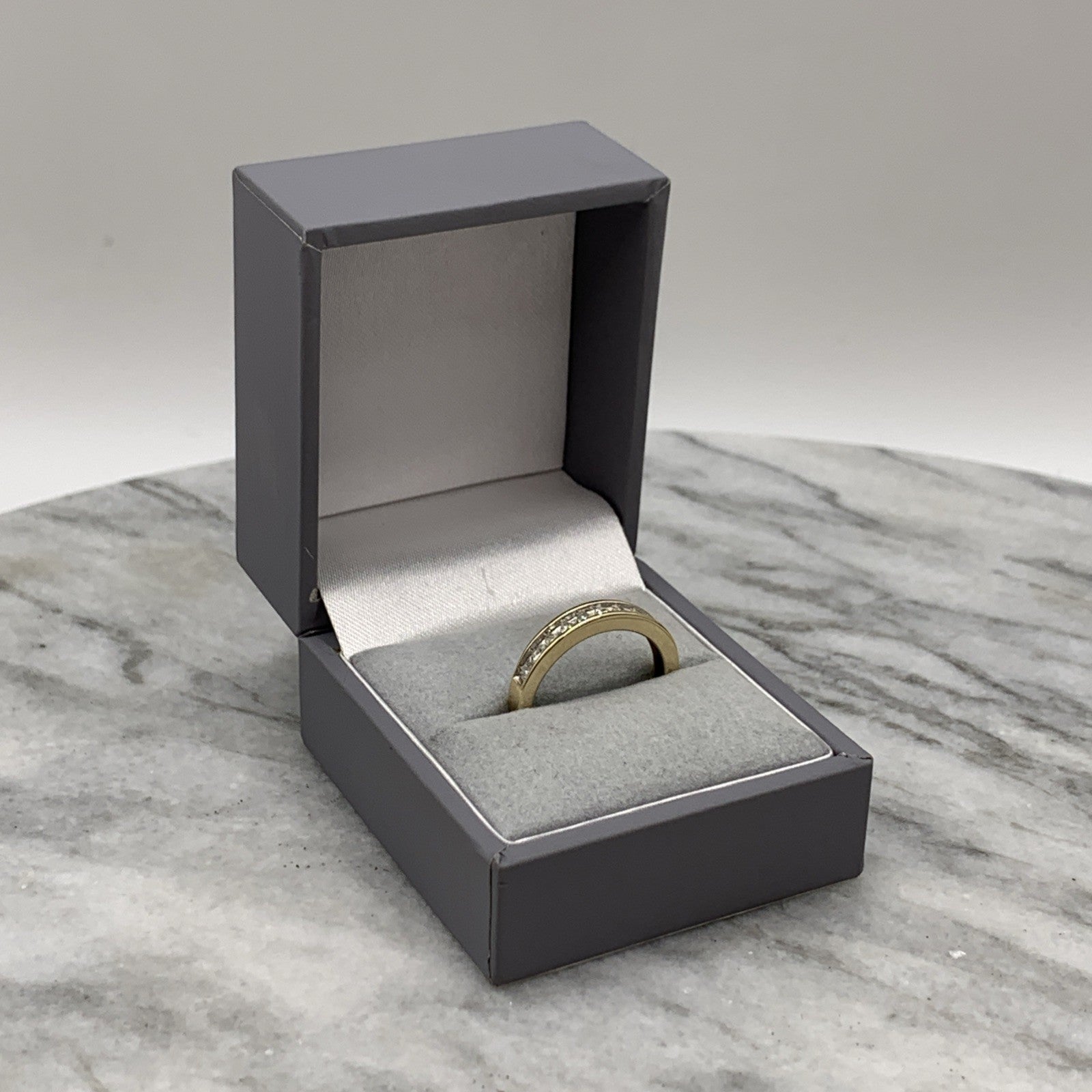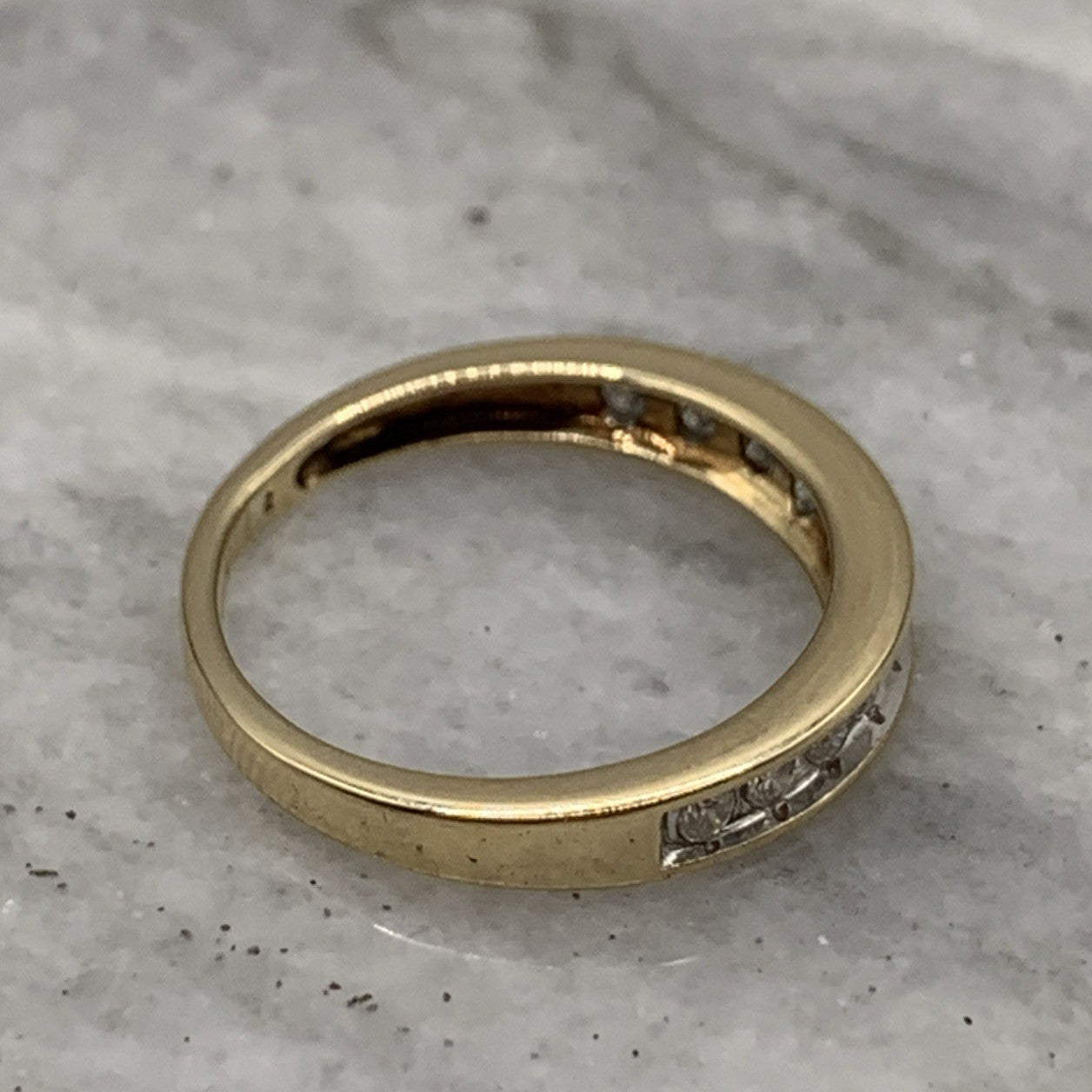 - A timeless gold band ring featuring a row of round cut diamonds in the half eternity style, amounting to .25ct.