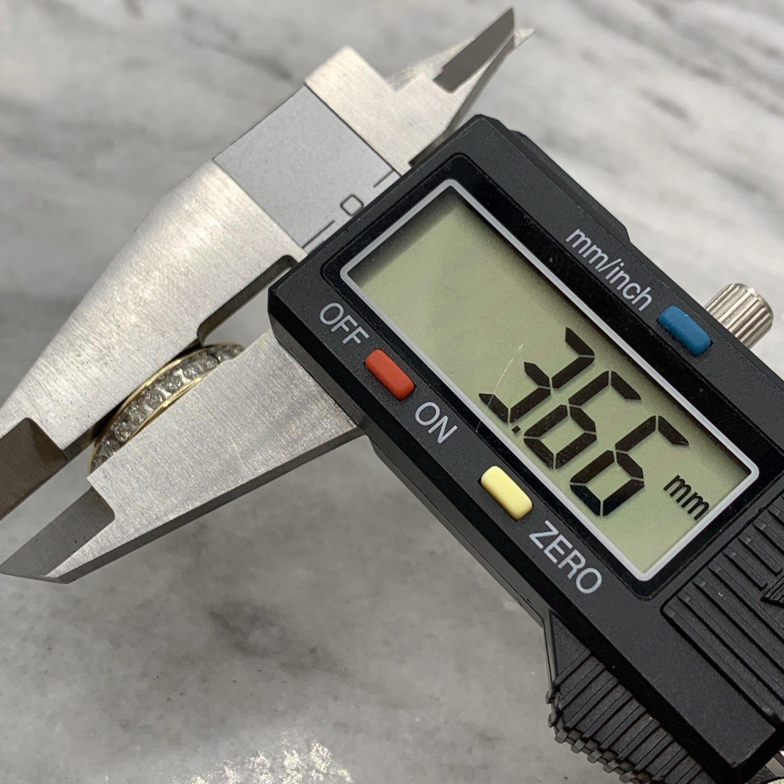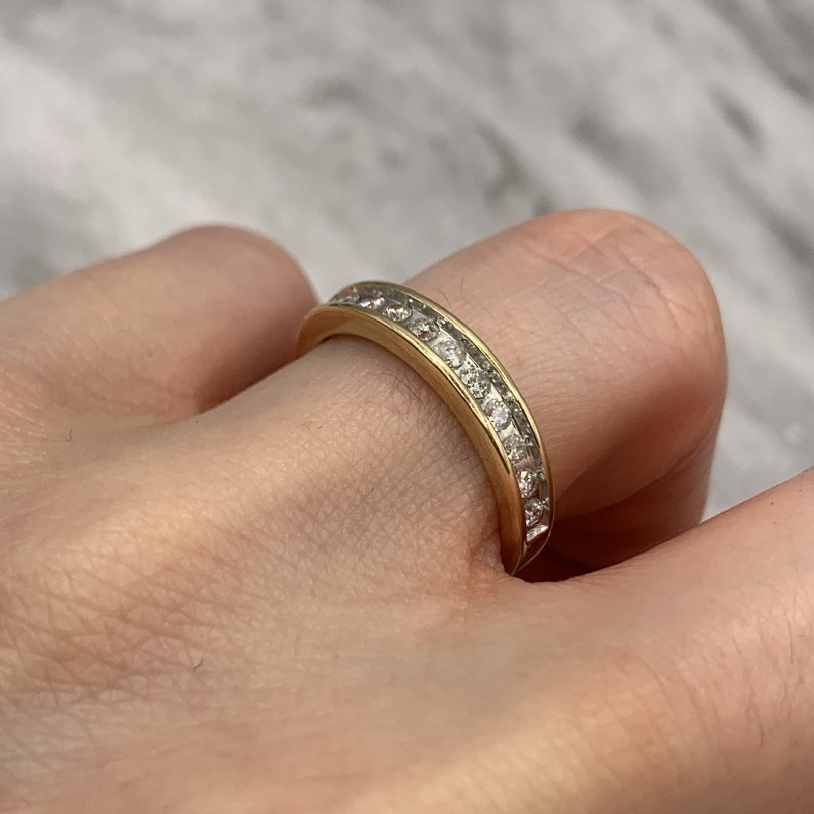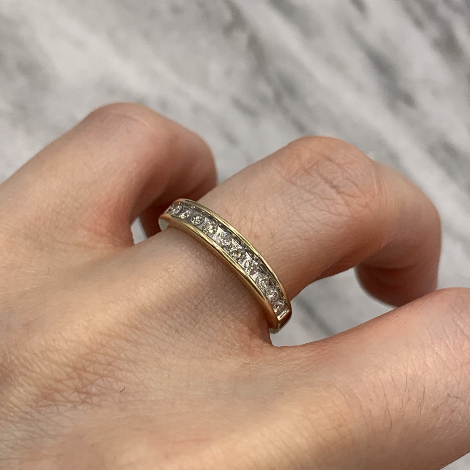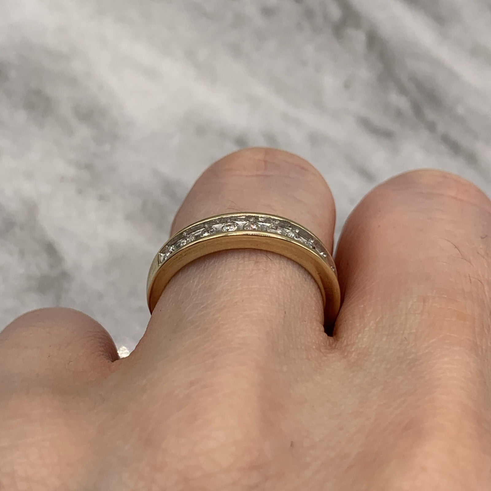 - A timeless gold band ring featuring a row of round cut diamonds in the half eternity style, amounting to .25ct.
