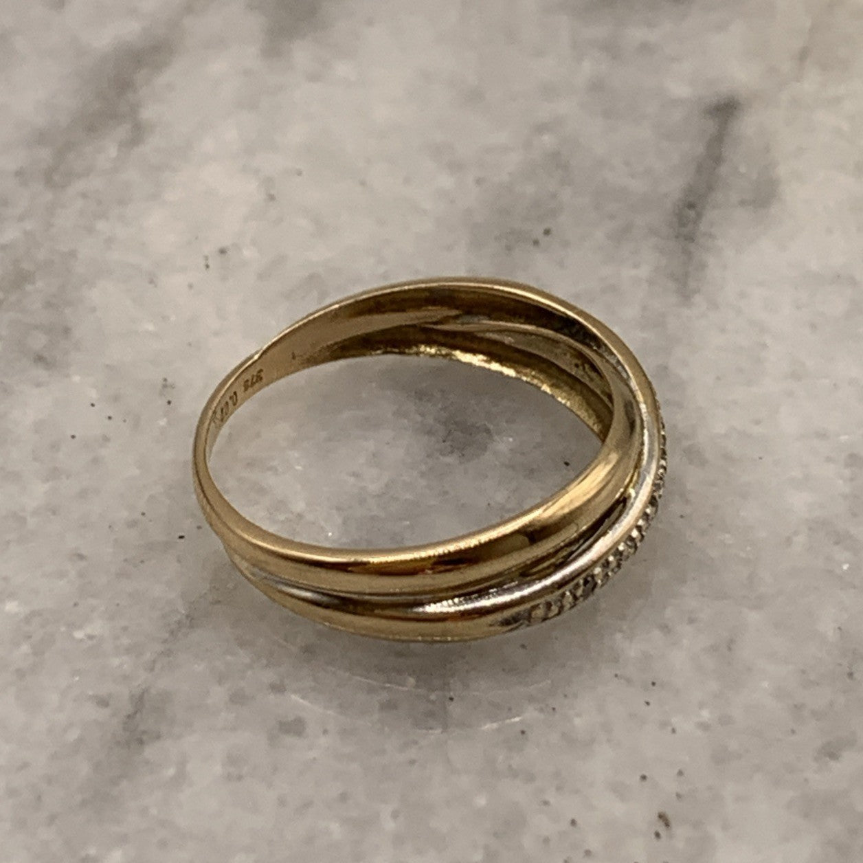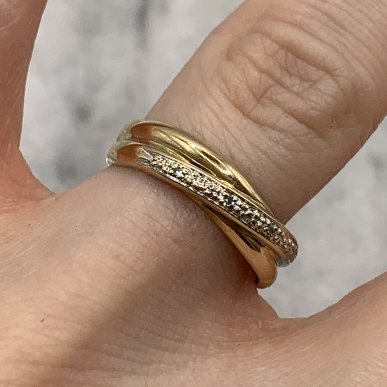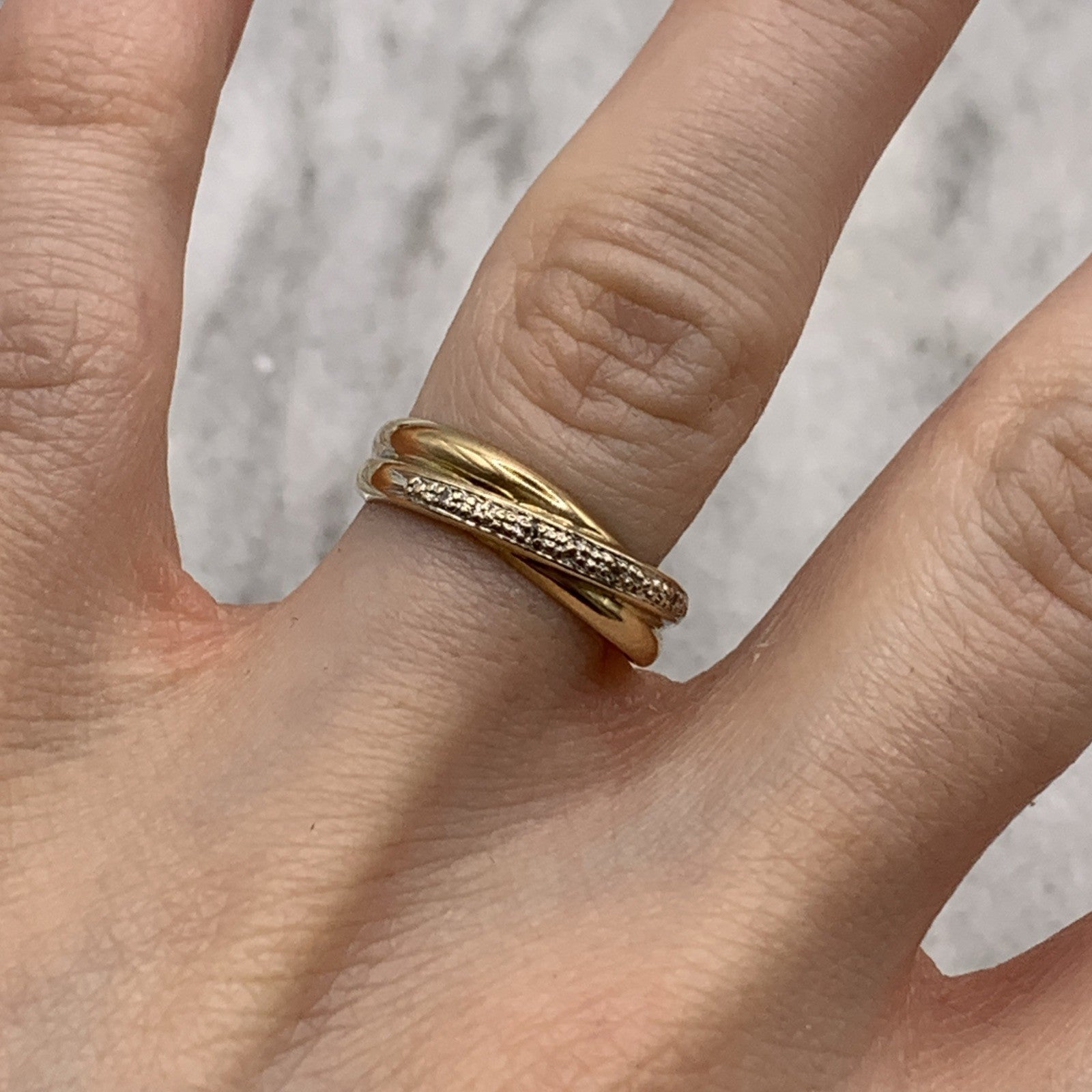 A lovely crossover style gold band ring featuring a row of petite pave set diamonds.