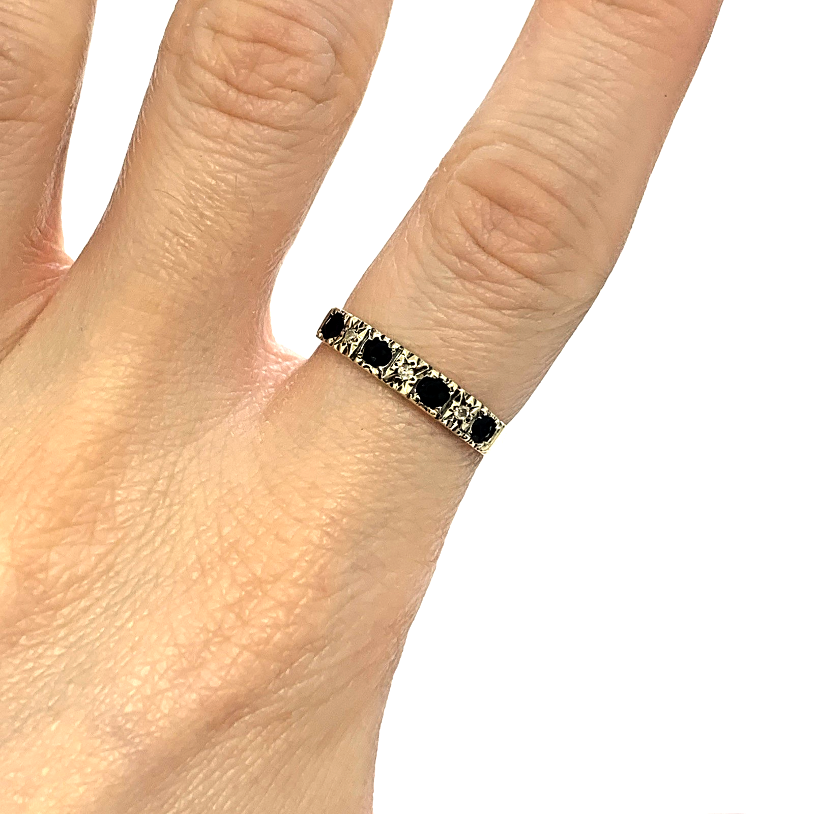 A stunning gold band ring featuring four oval cut sapphires accented by petite illusion set diamonds.