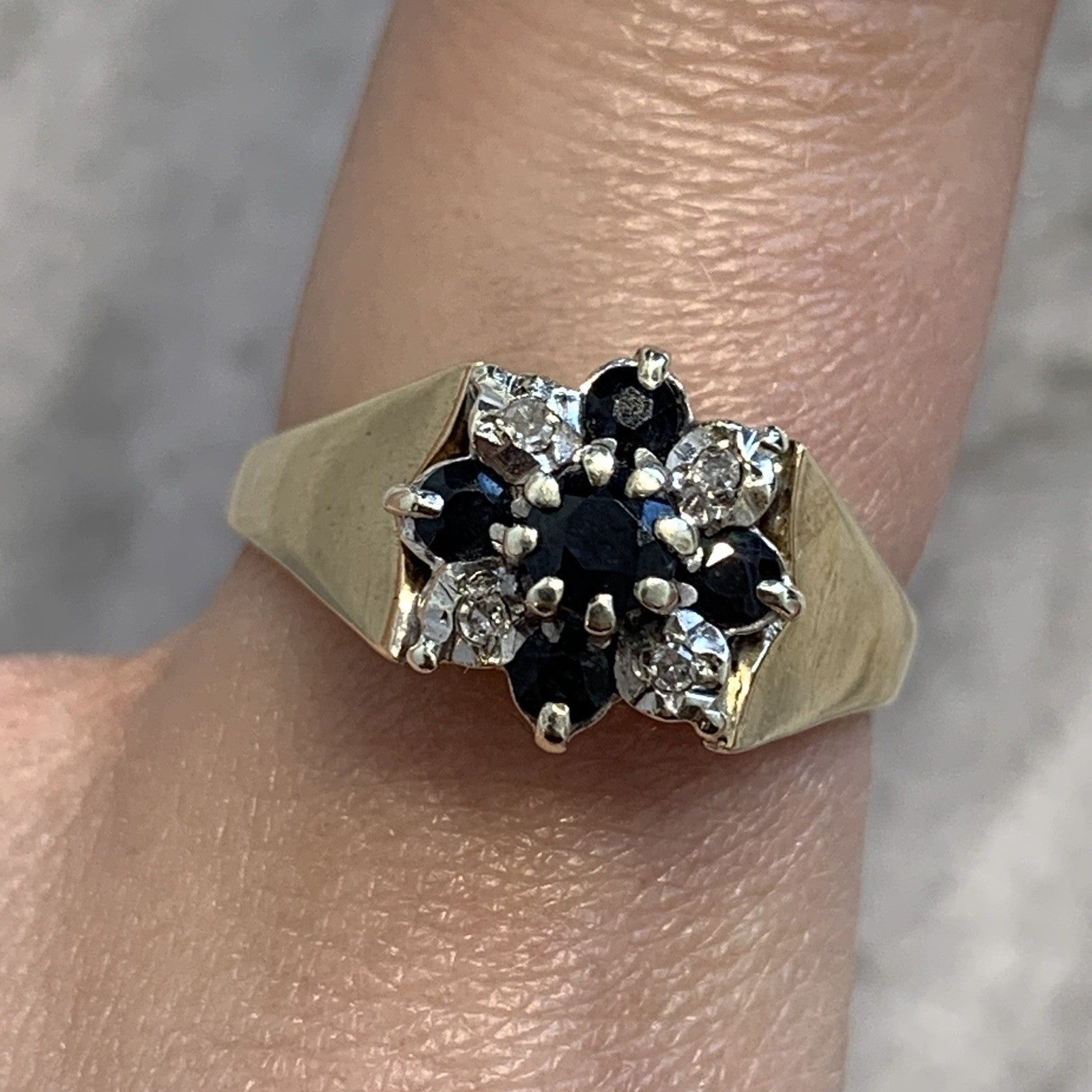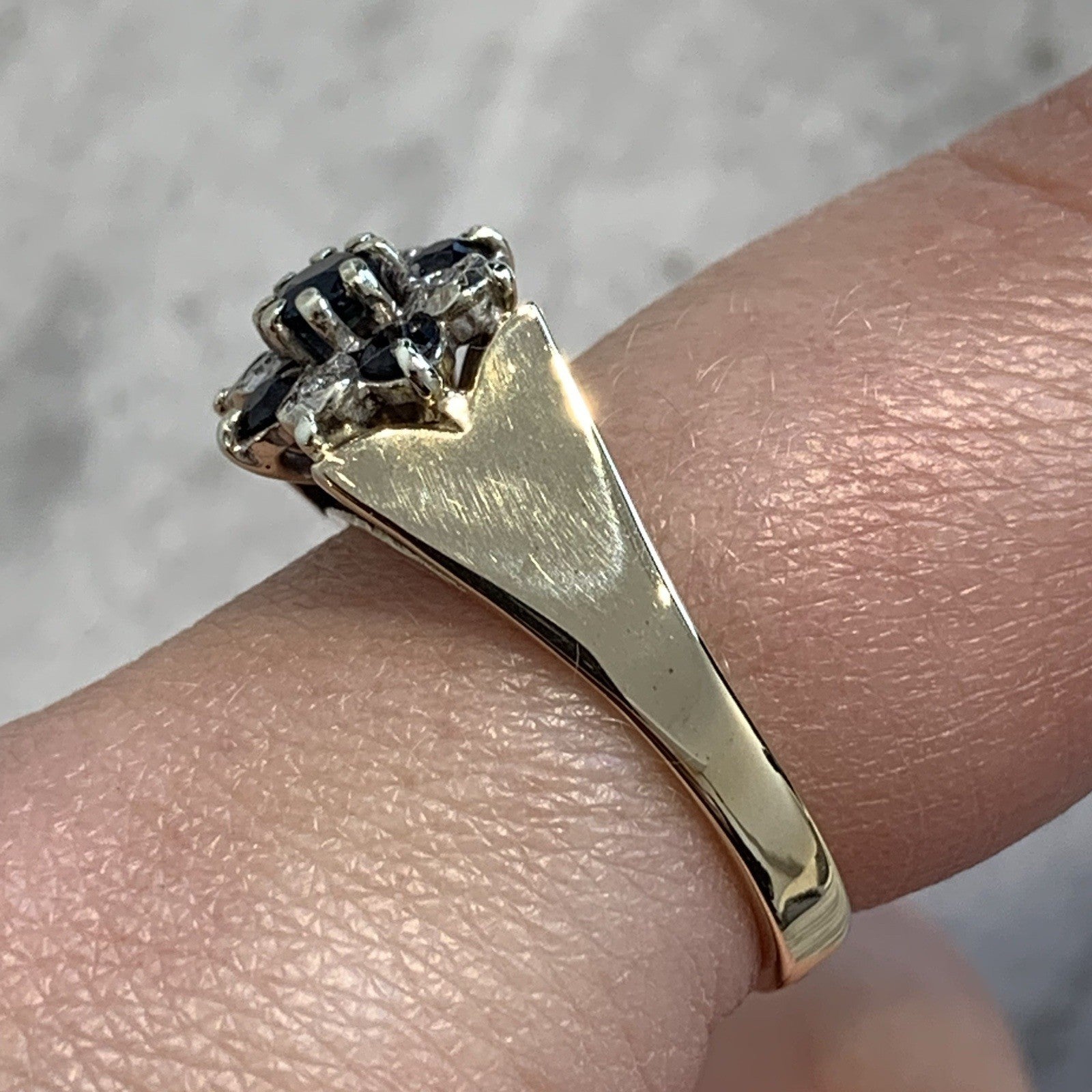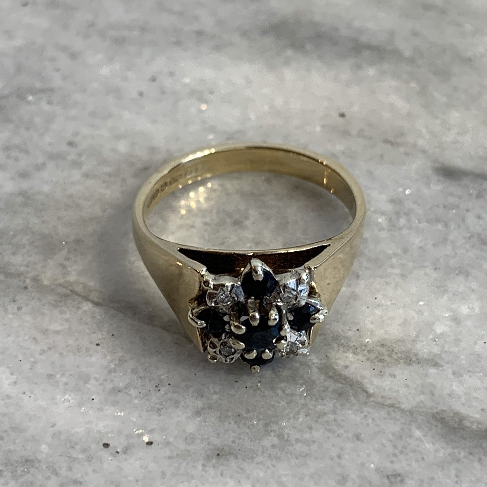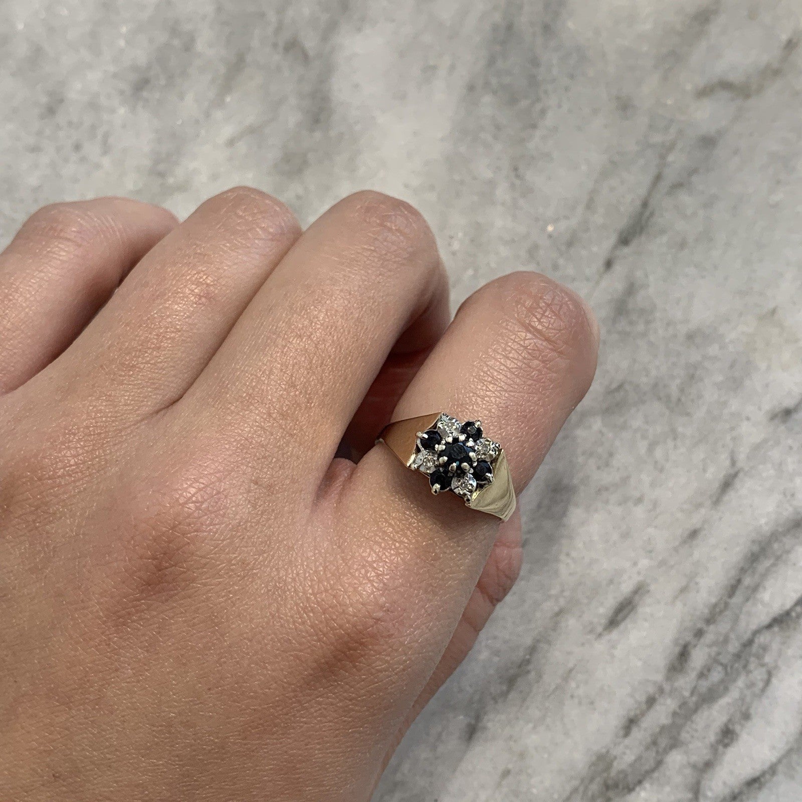 A gorgeous vintage gold ring showcasing a cluster of dark natural sapphires and natural diamonds, upon wide style shoulders to create a statement look.