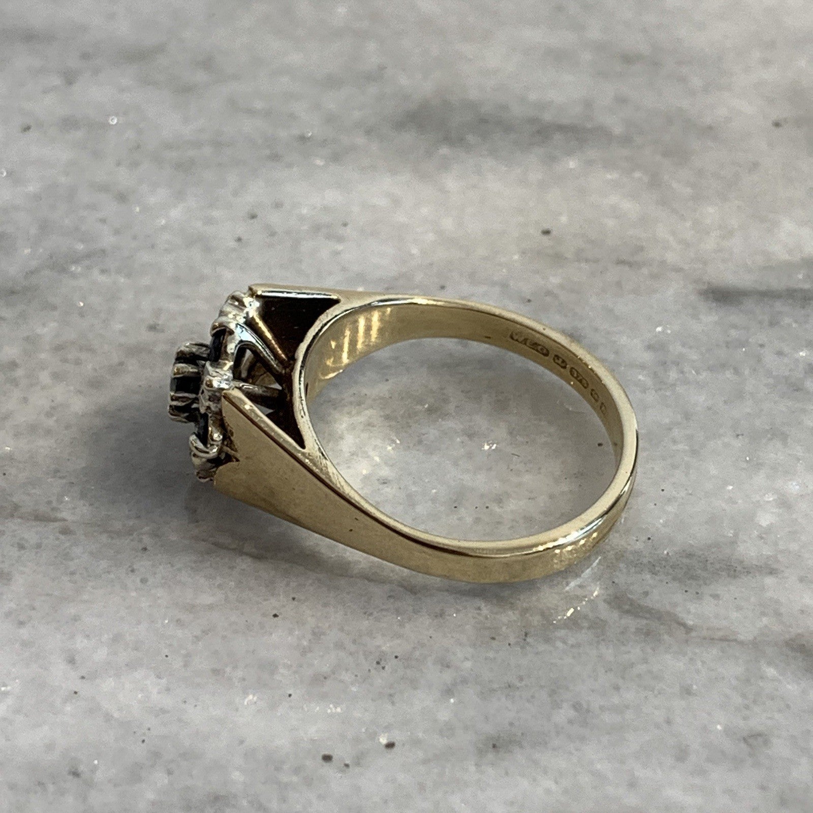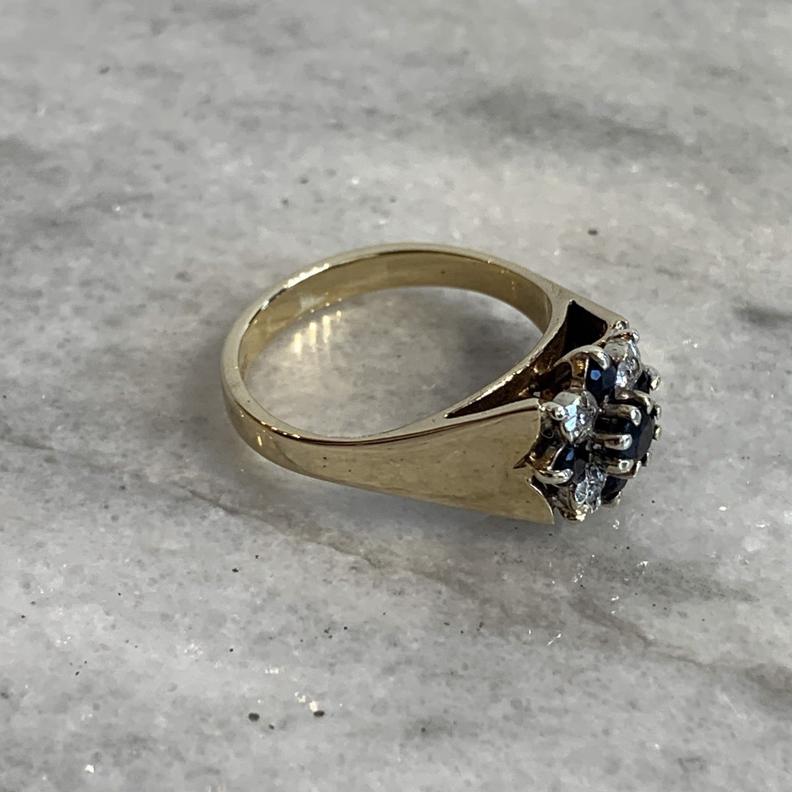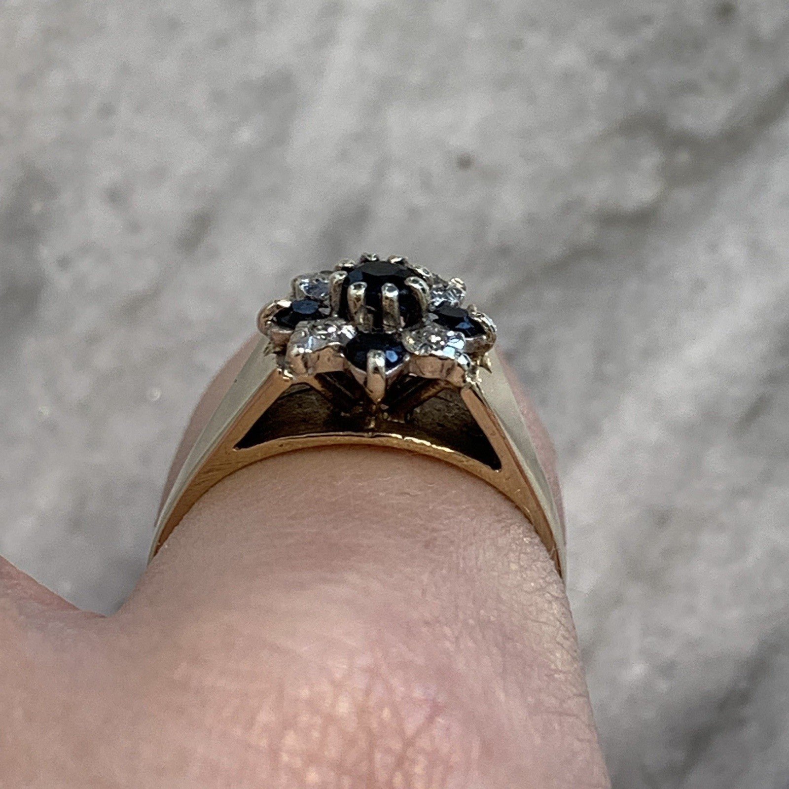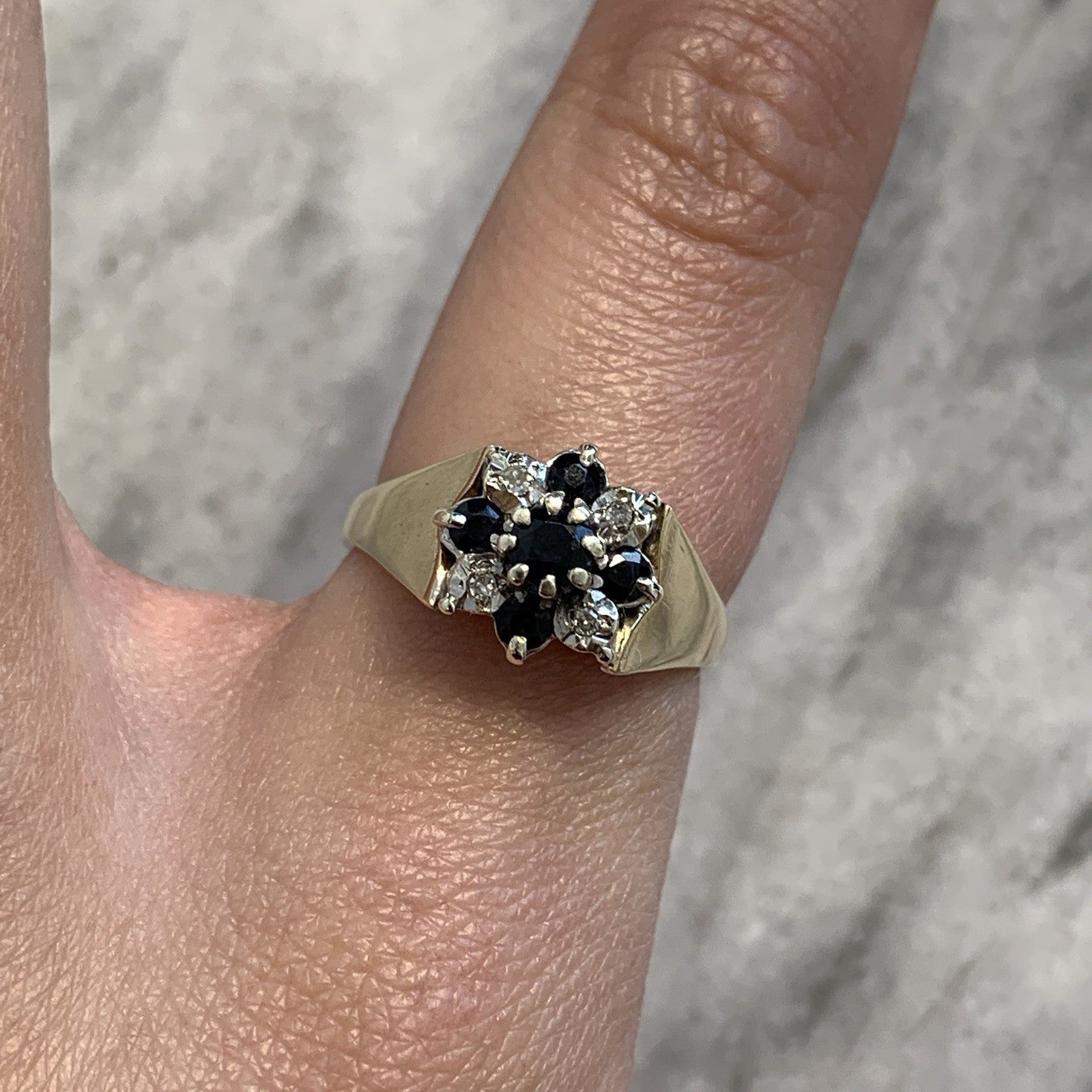 A gorgeous vintage gold ring showcasing a cluster of dark natural sapphires and natural diamonds, upon wide style shoulders to create a statement look.
