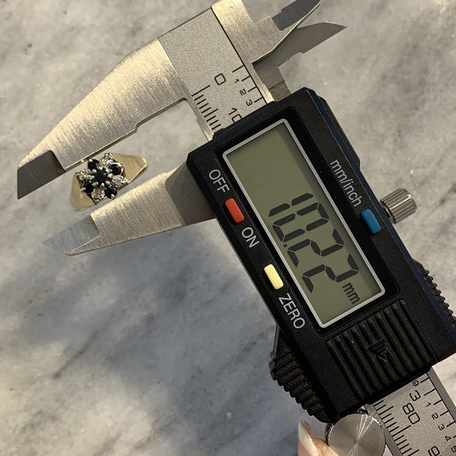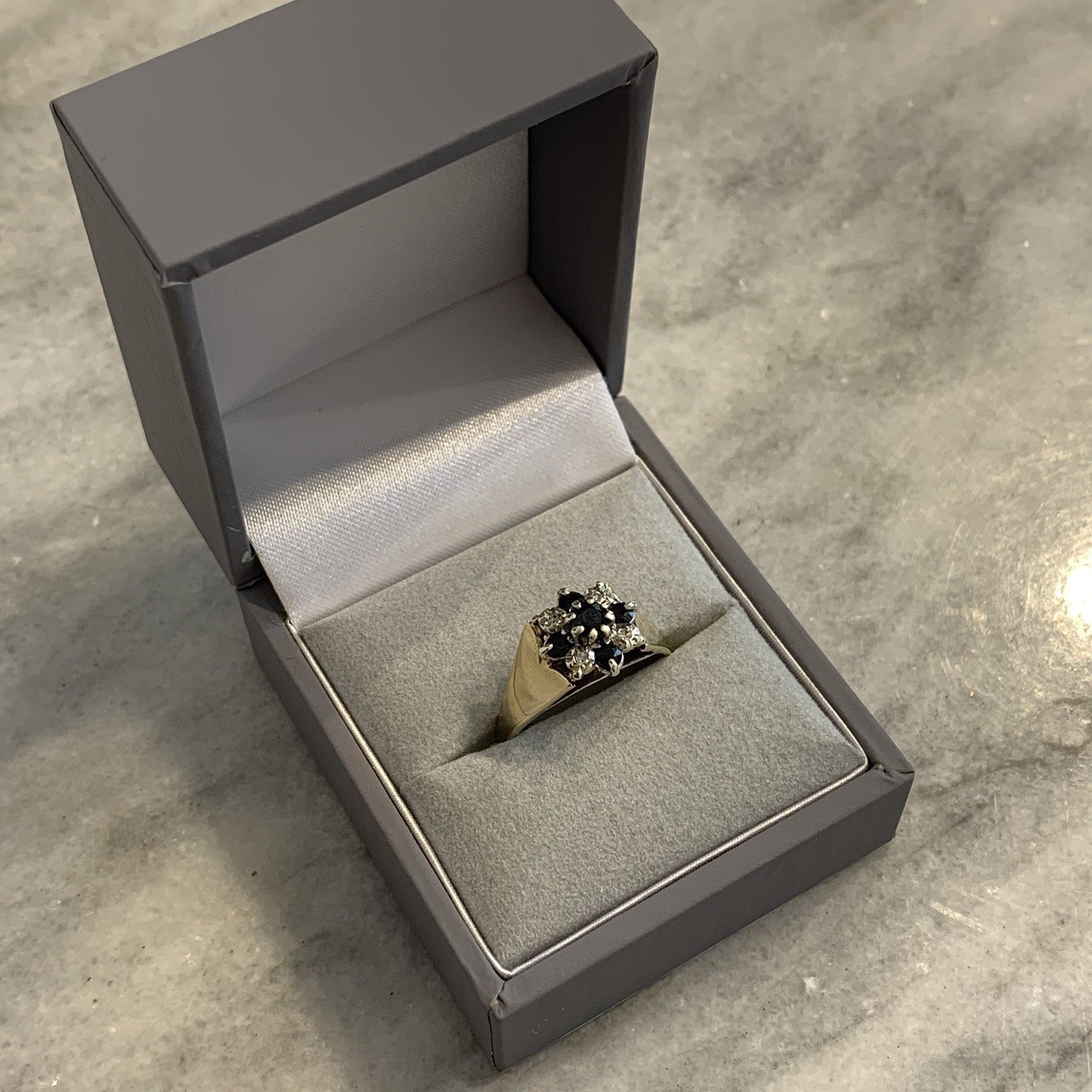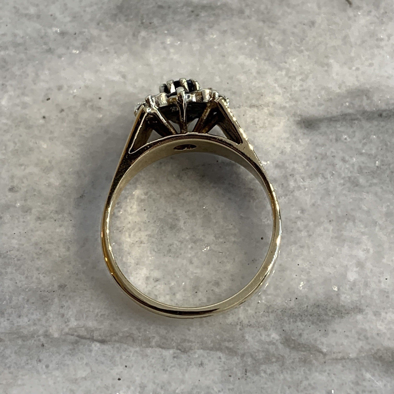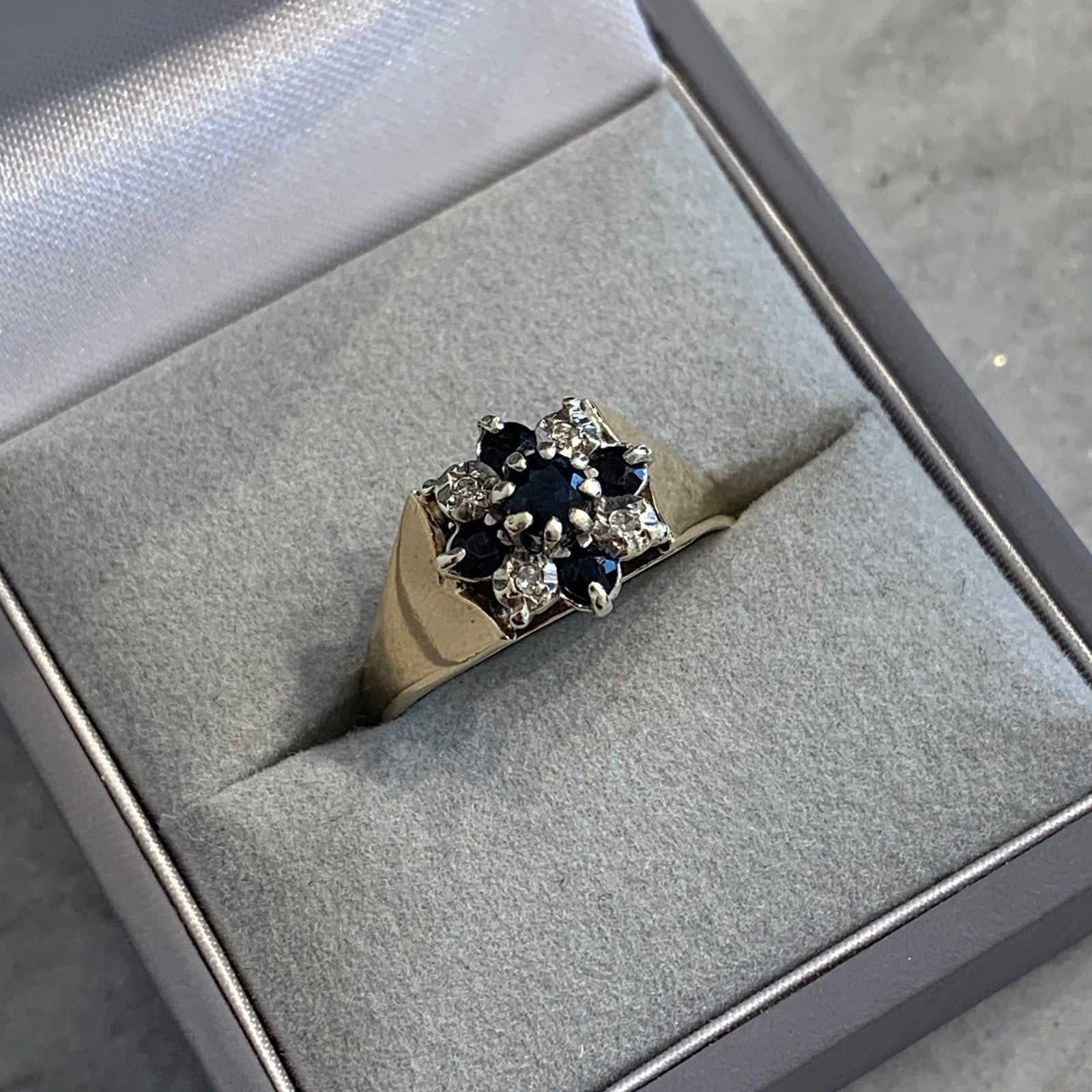 A gorgeous vintage gold ring showcasing a cluster of dark natural sapphires and natural diamonds, upon wide style shoulders to create a statement look.