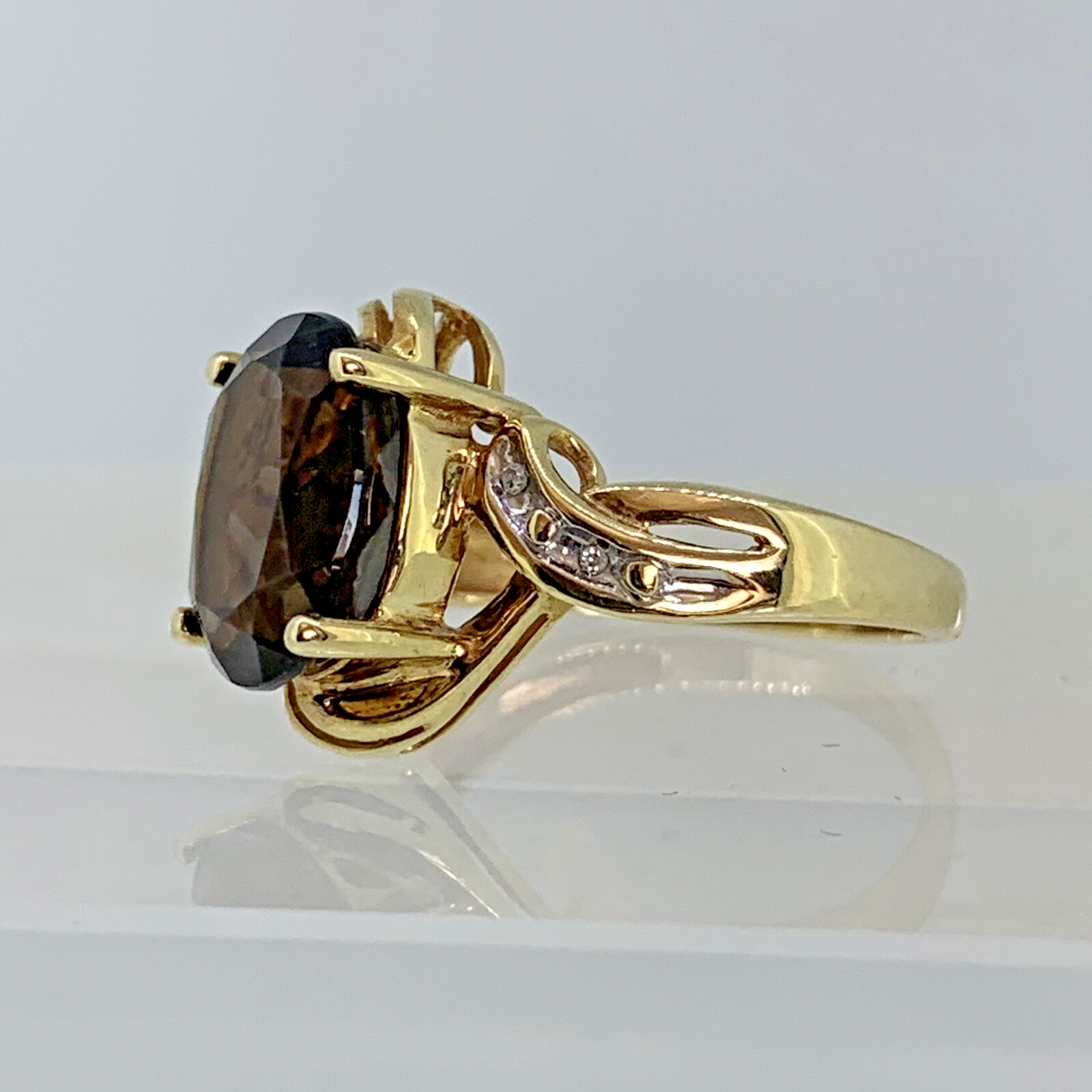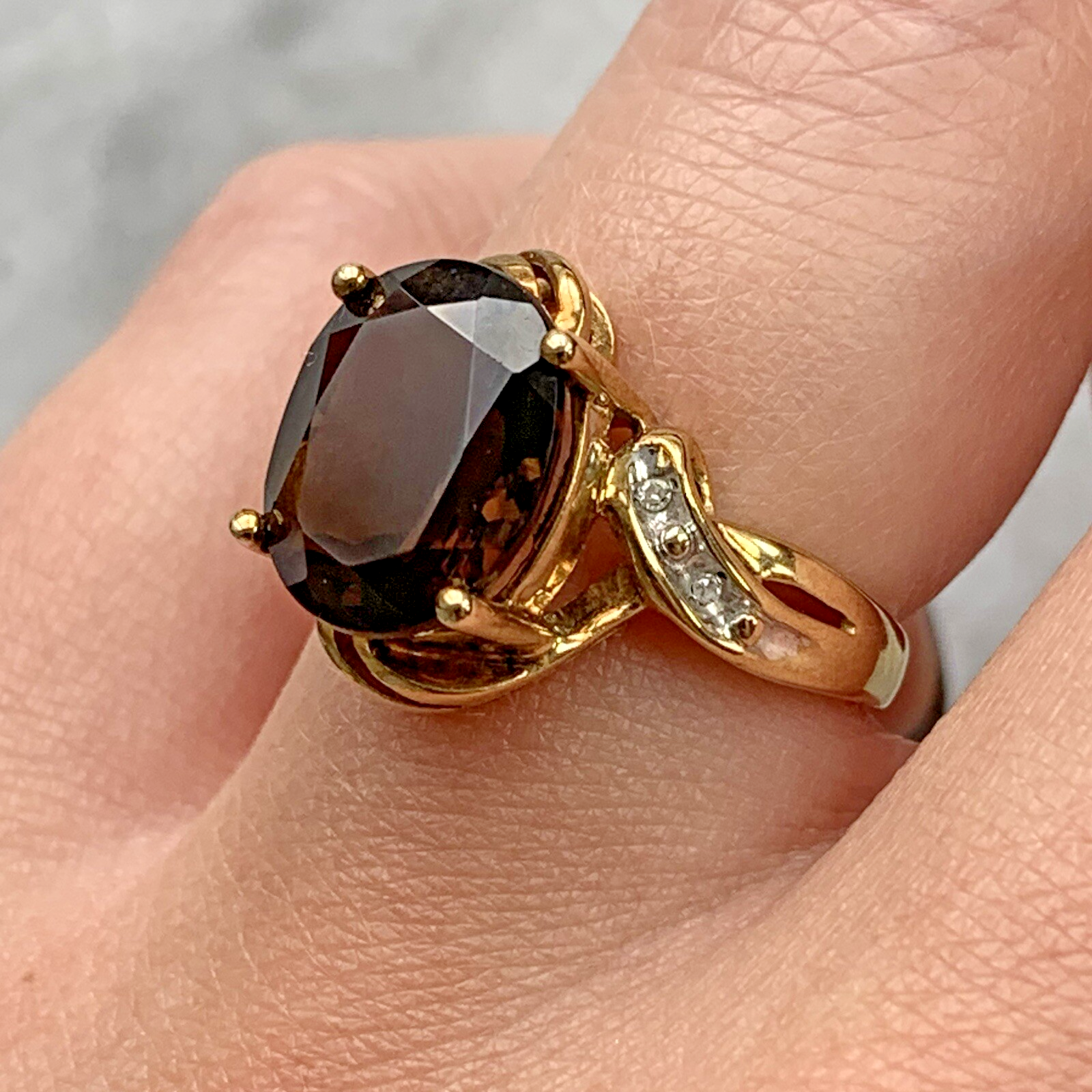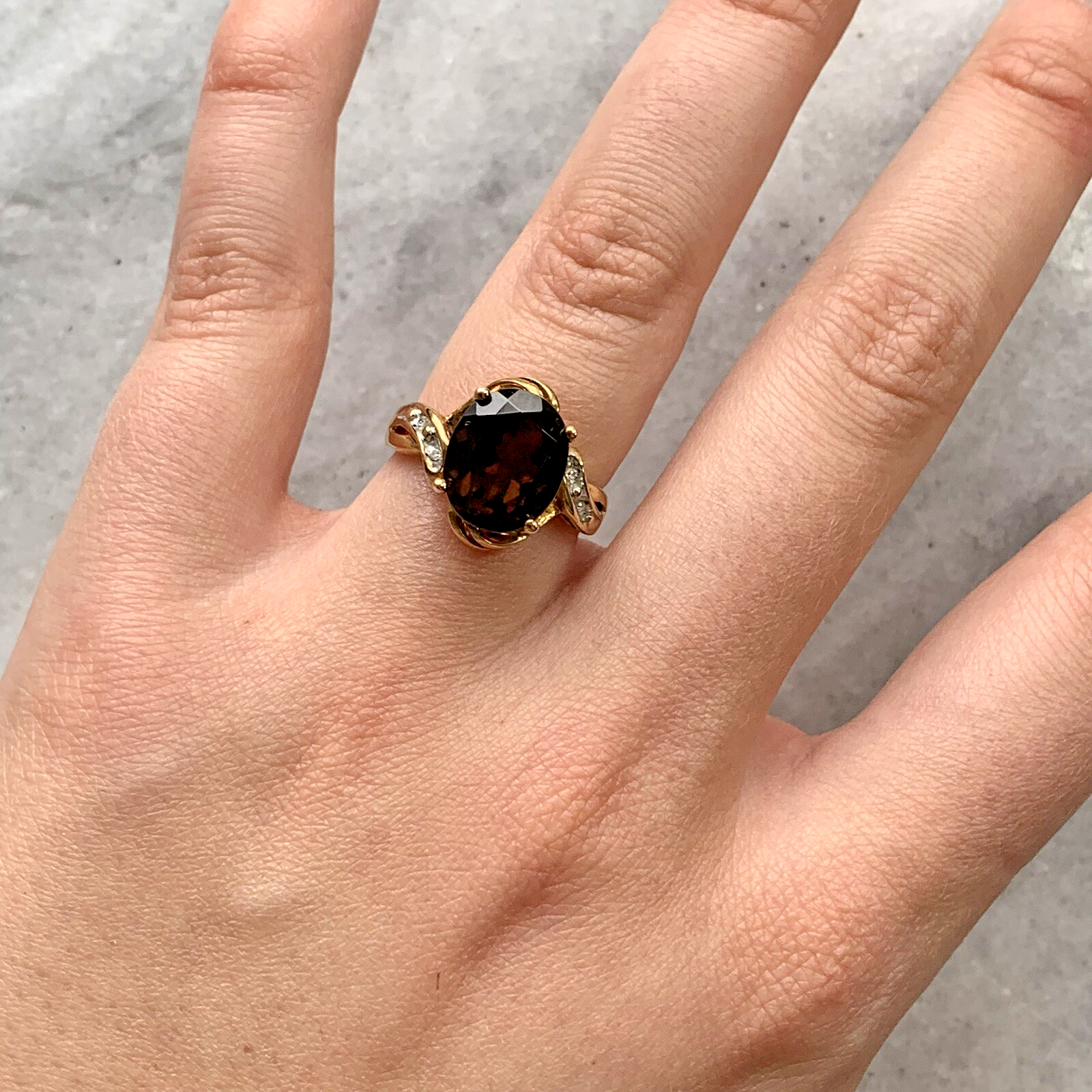 A beautiful ring featuring an oval cut rich coloured smoky quartz gemstone with twist shoulders that have diamond accents.